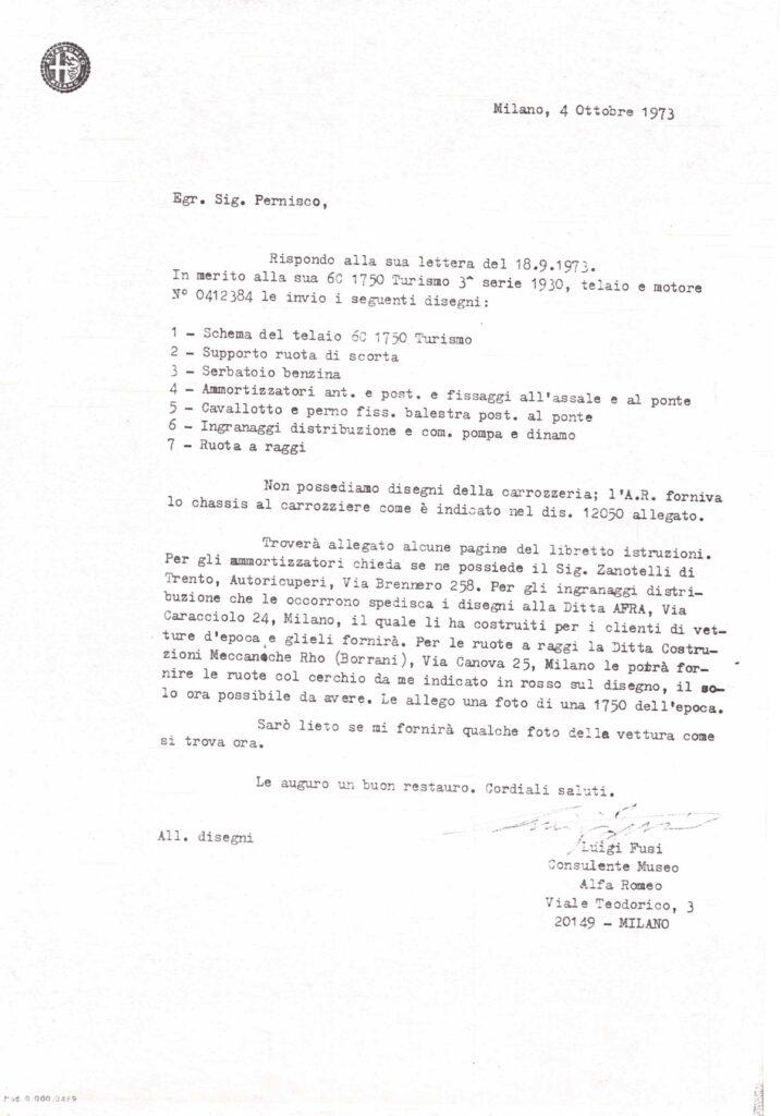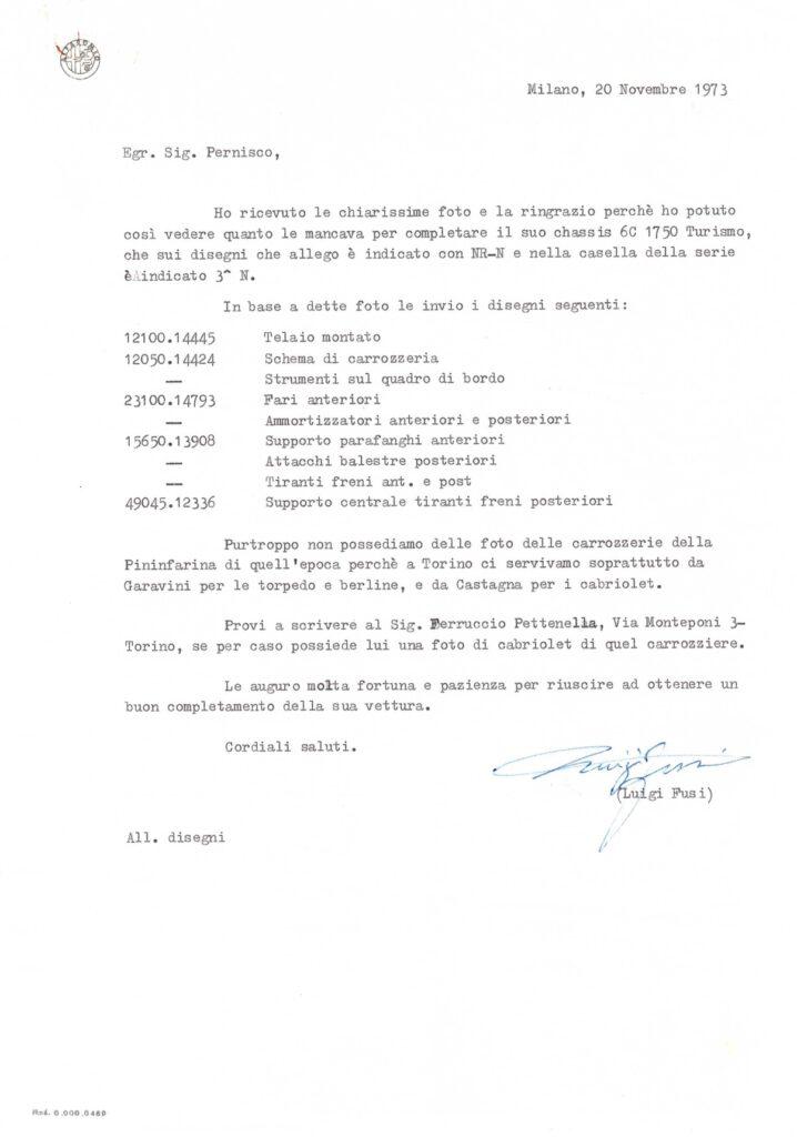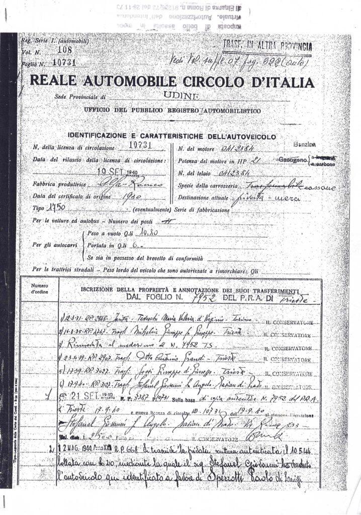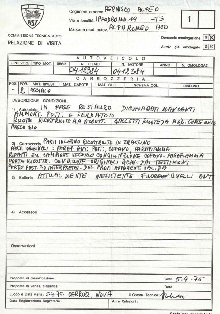 The owner of the time who bought the car to start the restoration asked Cavalier Luigi Fusi (author of the famous books on Alfa Romeos and keeper of the Italian trademark register) for help on how to proceed for an accurate and faithful restoration to the car that was missing only of the rear part due to the conversion to a truck (while all the other original parts are present as written by the ASI report attached in '75).