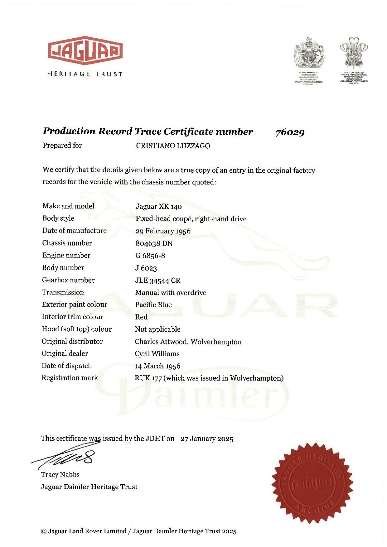In January 2025, the car was awarded the “JAGUAR HERITAGE TRUST CERTIFICATE,” which certifies the complete originality of its colors and the consistency of all chassis and engine numbers, confirming its status as a collector's piece.