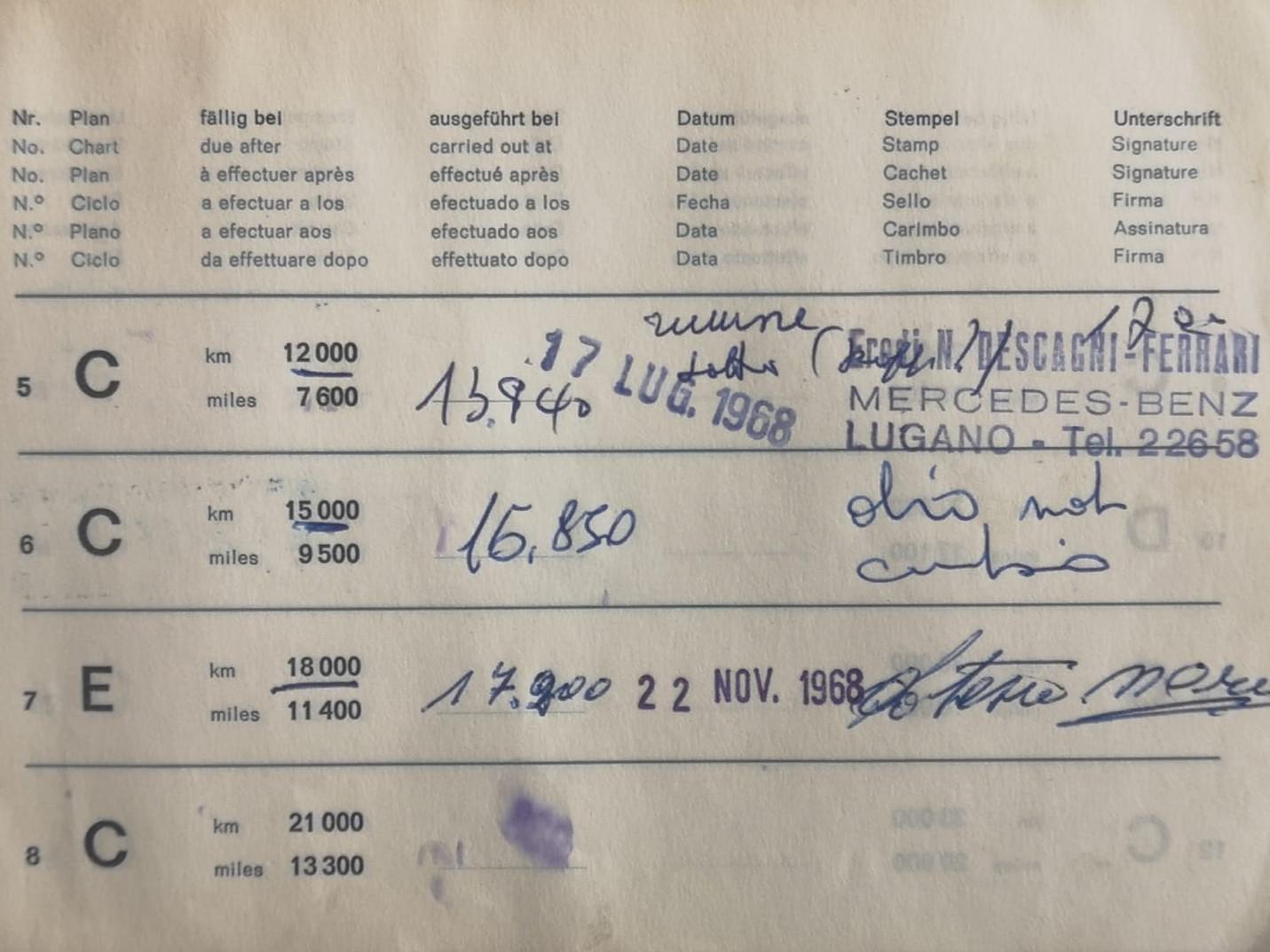 This particular example was manufactured in 1958 and sold new by the official Mercedes-Benz importer in Switzerland, with delivery in Zurich. It was registered in July of the same year under the name of Ing. Ballabio in the Canton of Ticino. Over the years, it received regular maintenance at the Mercedes-Benz Bescagni and Ferrari dealership in Lugano and, by 1968, after a decade, had only covered 17,200 km.