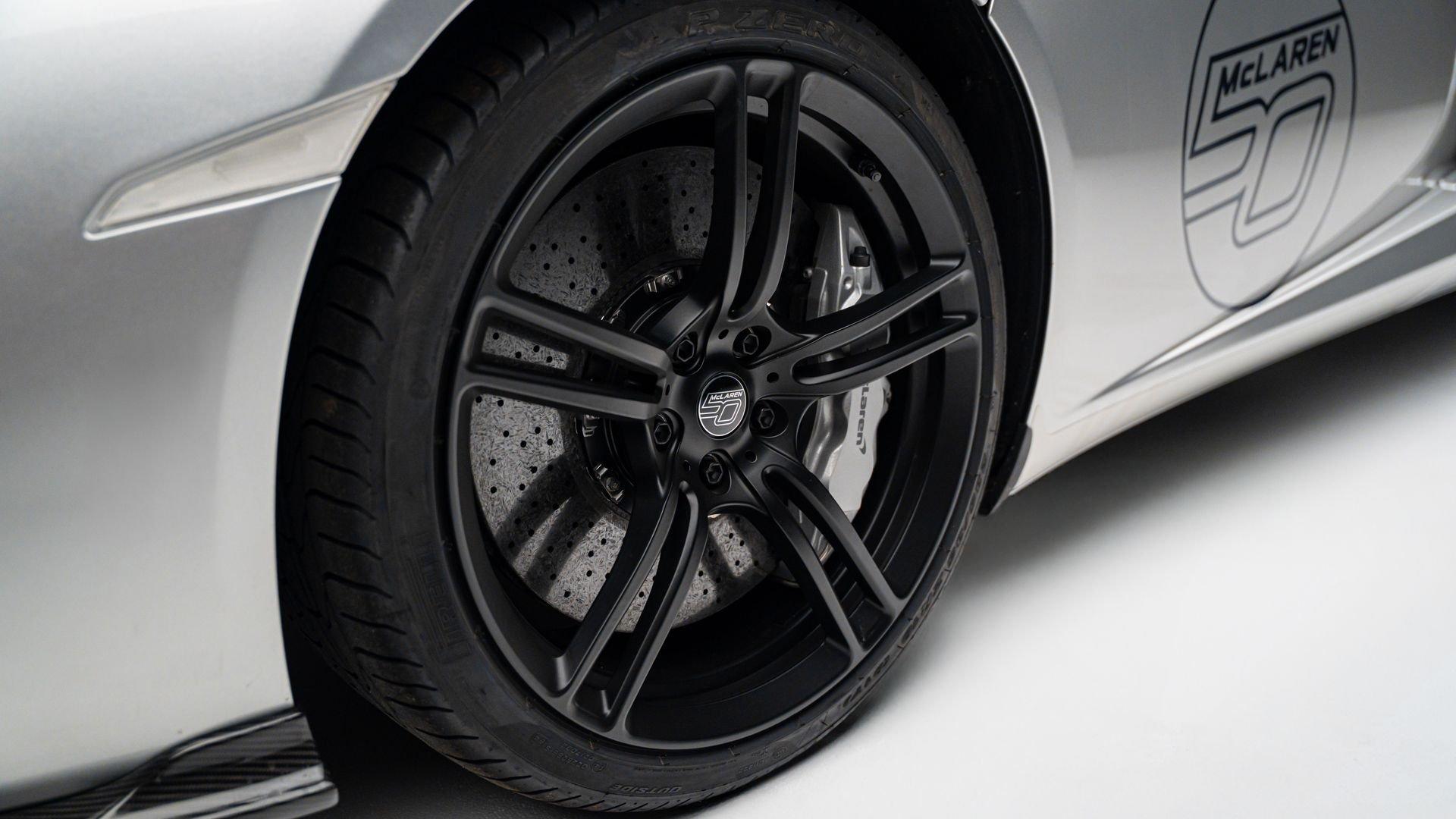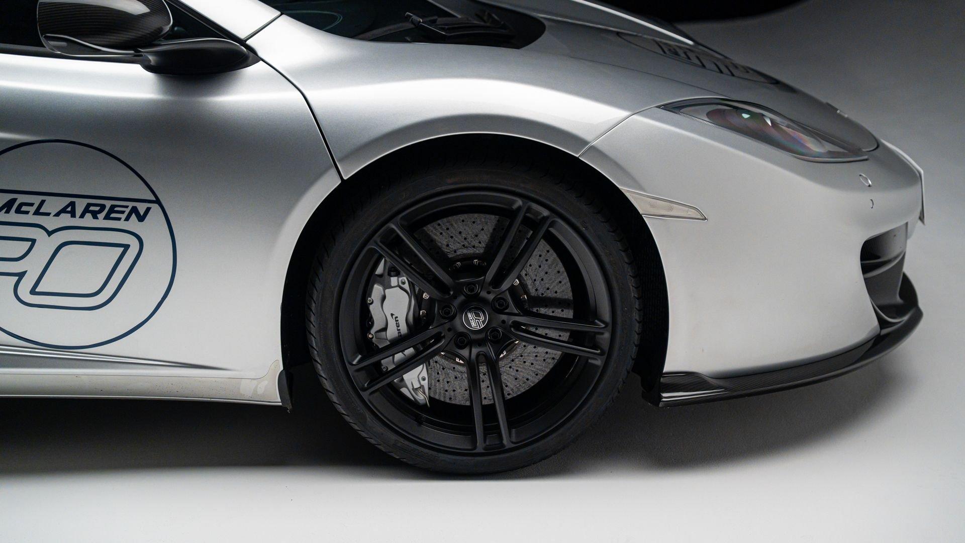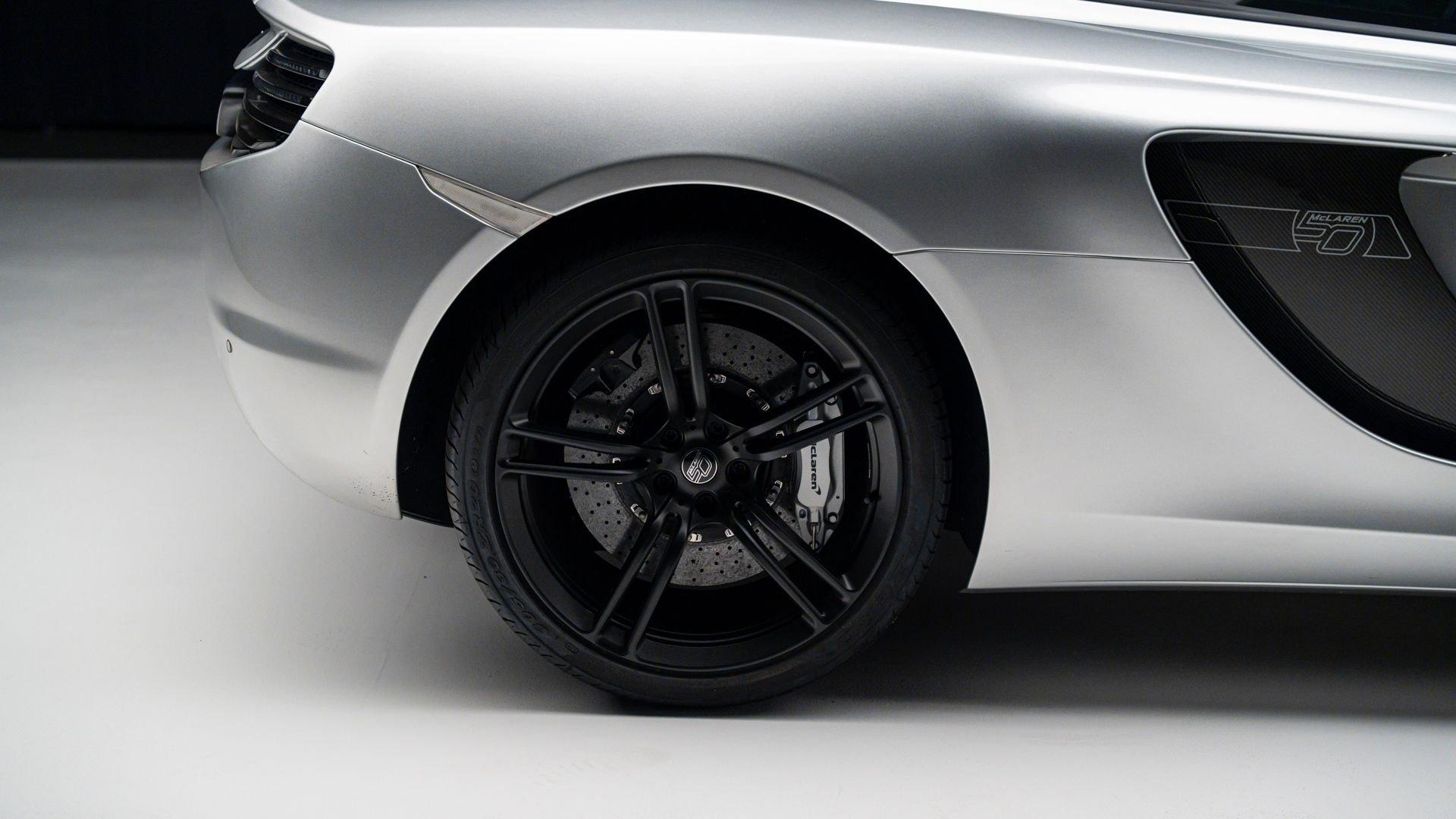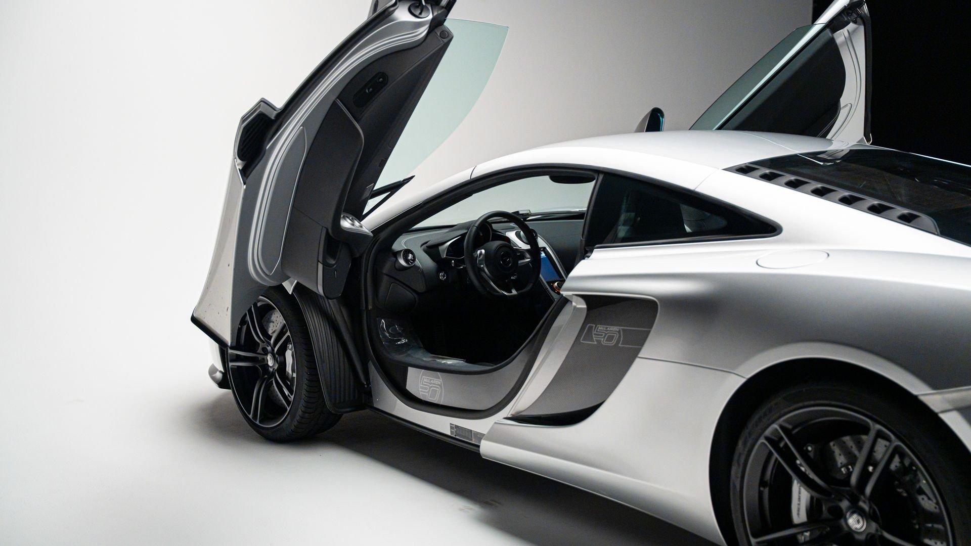 This 2013 McLaren 50 12C by MSO is finished in elegant Supernova Silver, one of three Elite colors offered for the exclusive anniversary model. It is distinguished from the standard 12C by a custom MSO-designed high-downforce front bumper, carbon Kevlar front floor, and McLaren 50 Ultra Lightweight wheels. Finished in Satin Black, these exclusive wheels reduce two more kilograms than the standard Super Lightweight wheels and frame the factory-fitted carbon ceramic brake upgrade that all 50 12Cs are equipped with as standard. The cabin reflects the 50 12C's restrained exclusivity, trimmed in Carbon Black Full Nappa Leather upholstery throughout. Subtle commemorative details include McLaren 50 branding on the carbon fiber sill panels and floor mats, and an anniversary dedication plate mounted on the driver's door.