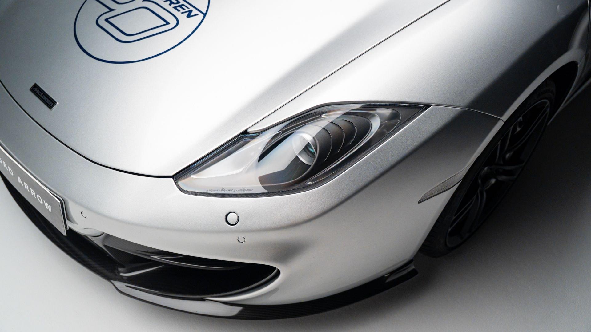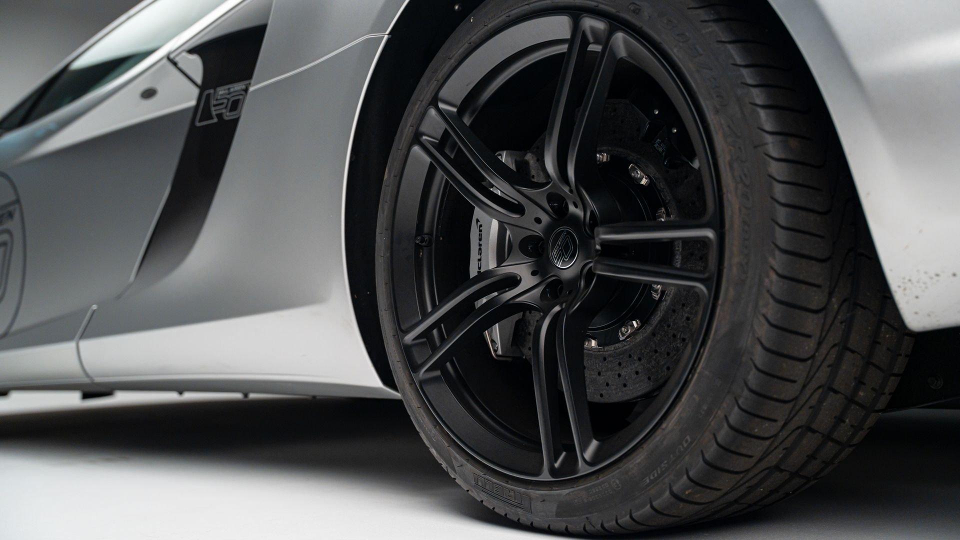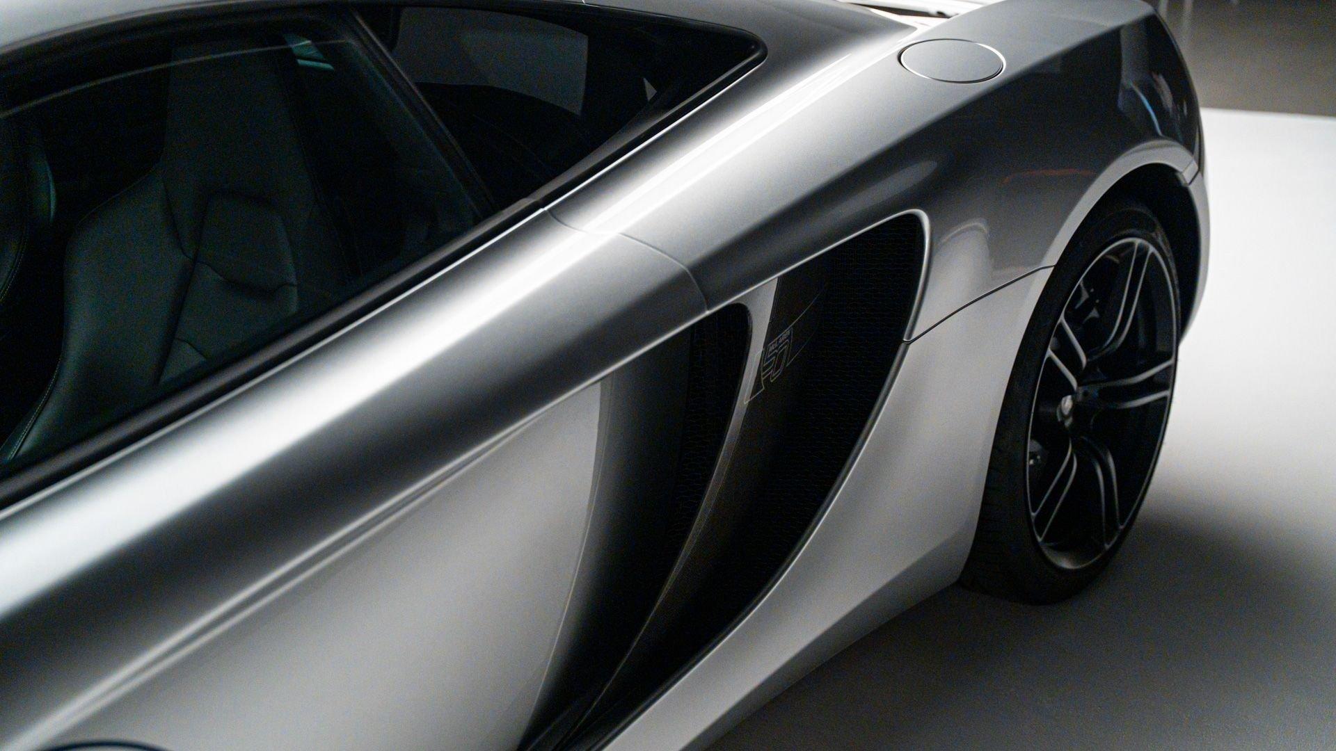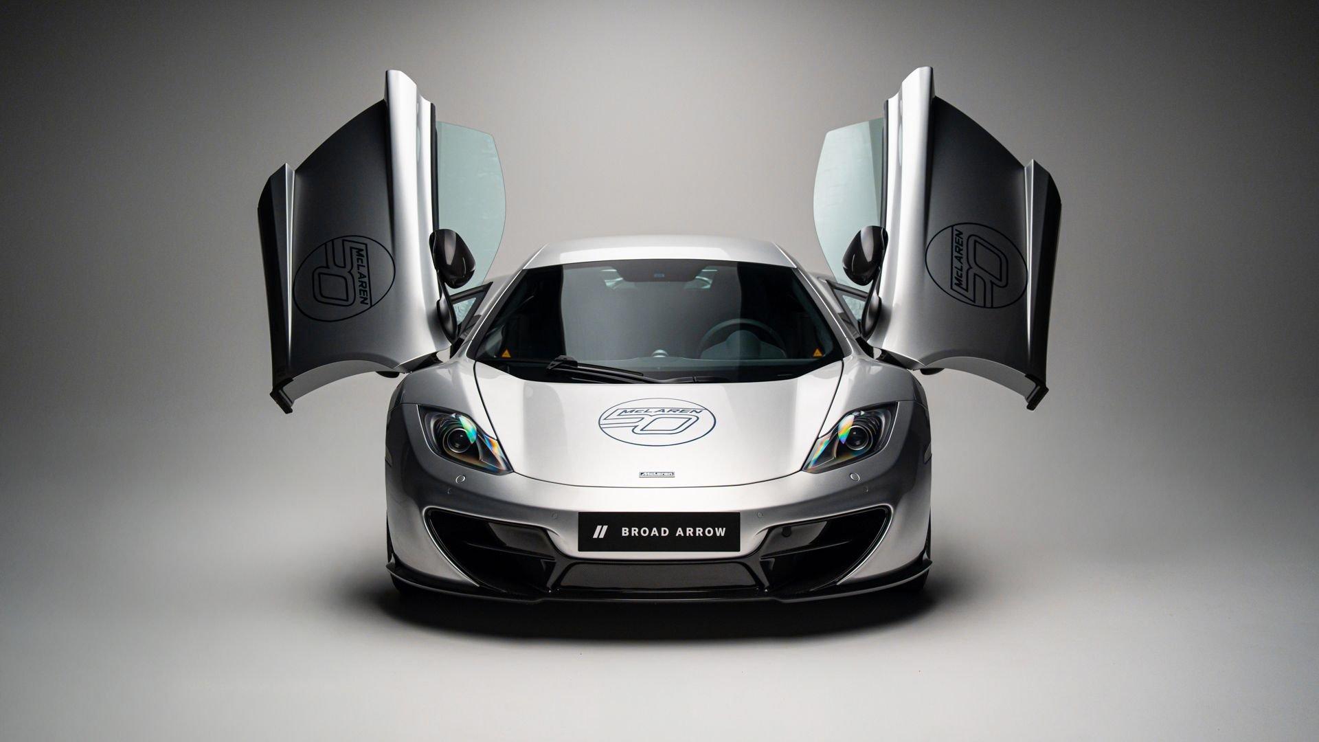This 2013 McLaren 50 12C by MSO is finished in elegant Supernova Silver, one of three Elite colors offered for the exclusive anniversary model. It is distinguished from the standard 12C by a custom MSO-designed high-downforce front bumper, carbon Kevlar front floor, and McLaren 50 Ultra Lightweight wheels. Finished in Satin Black, these exclusive wheels reduce two more kilograms than the standard Super Lightweight wheels and frame the factory-fitted carbon ceramic brake upgrade that all 50 12Cs are equipped with as standard. The cabin reflects the 50 12C's restrained exclusivity, trimmed in Carbon Black Full Nappa Leather upholstery throughout. Subtle commemorative details include McLaren 50 branding on the carbon fiber sill panels and floor mats, and an anniversary dedication plate mounted on the driver's door.