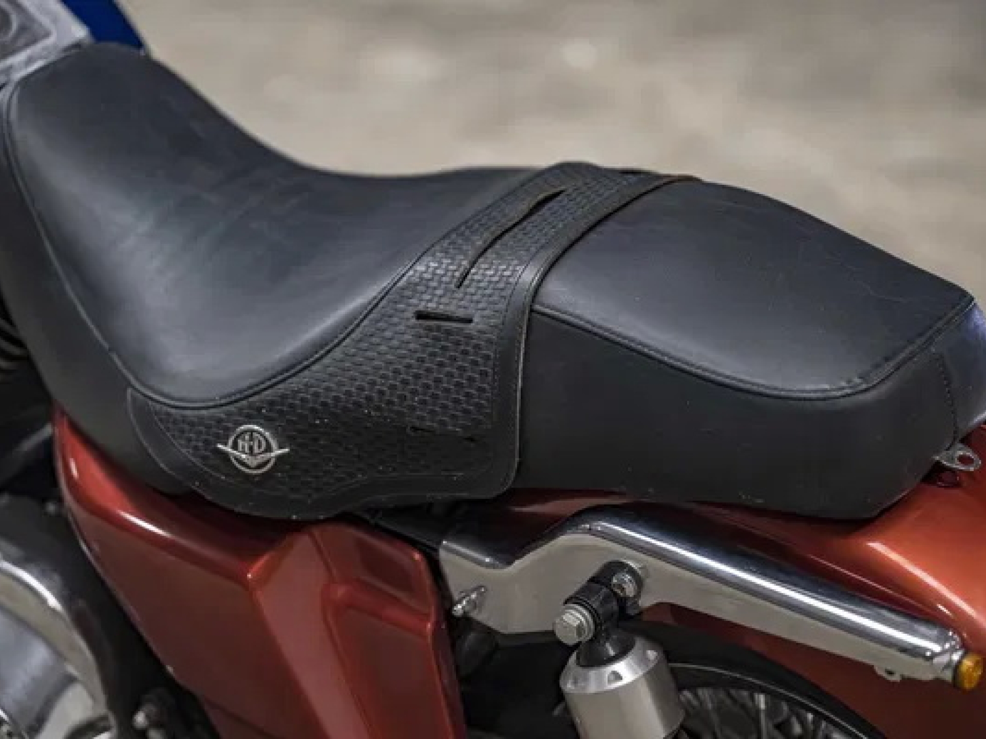 The black leather on the main and pillion seats is free of any holes or tears, and the leather-covered hard-case saddle bags are fine, save the odd scuff here and there.