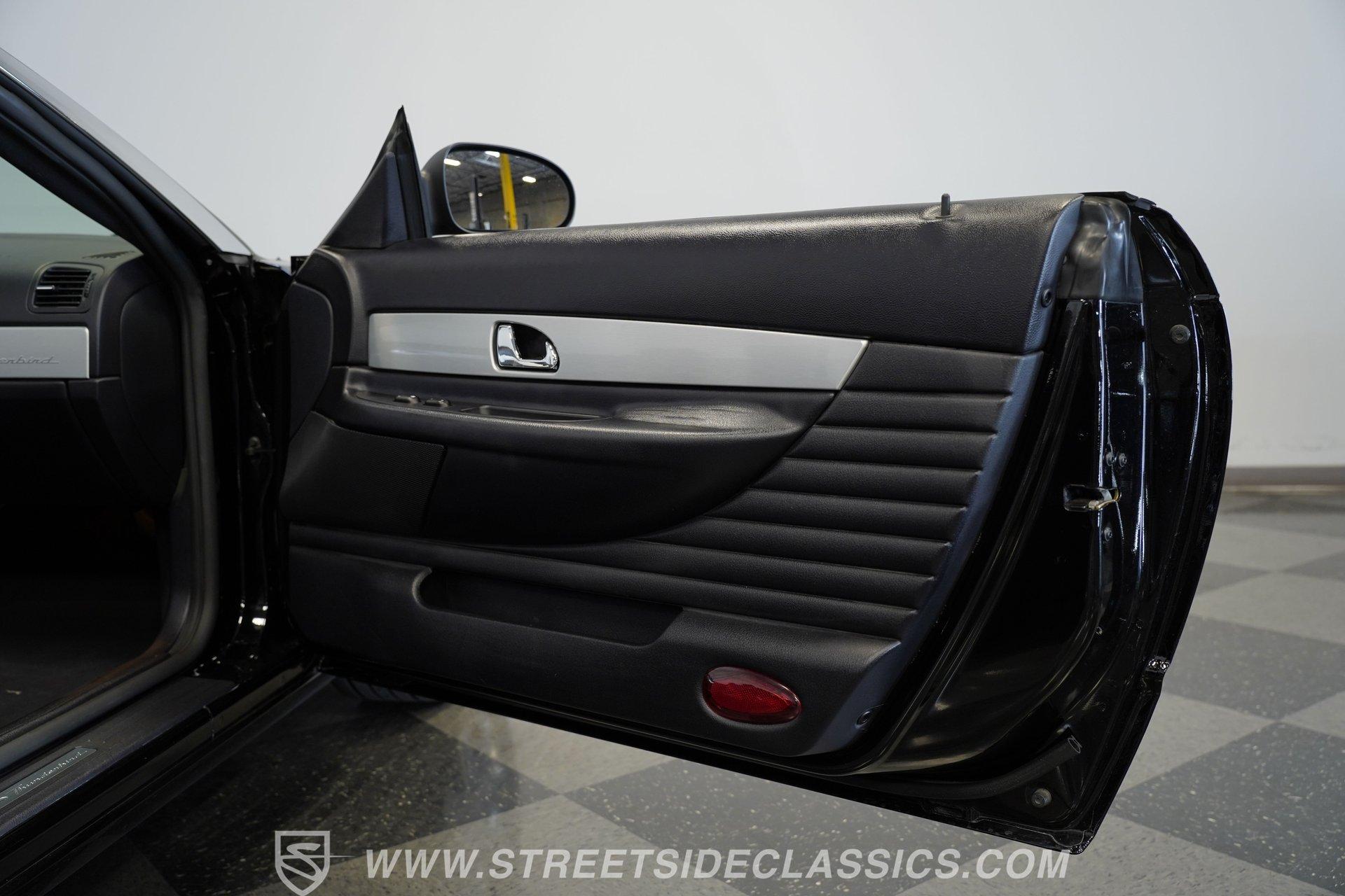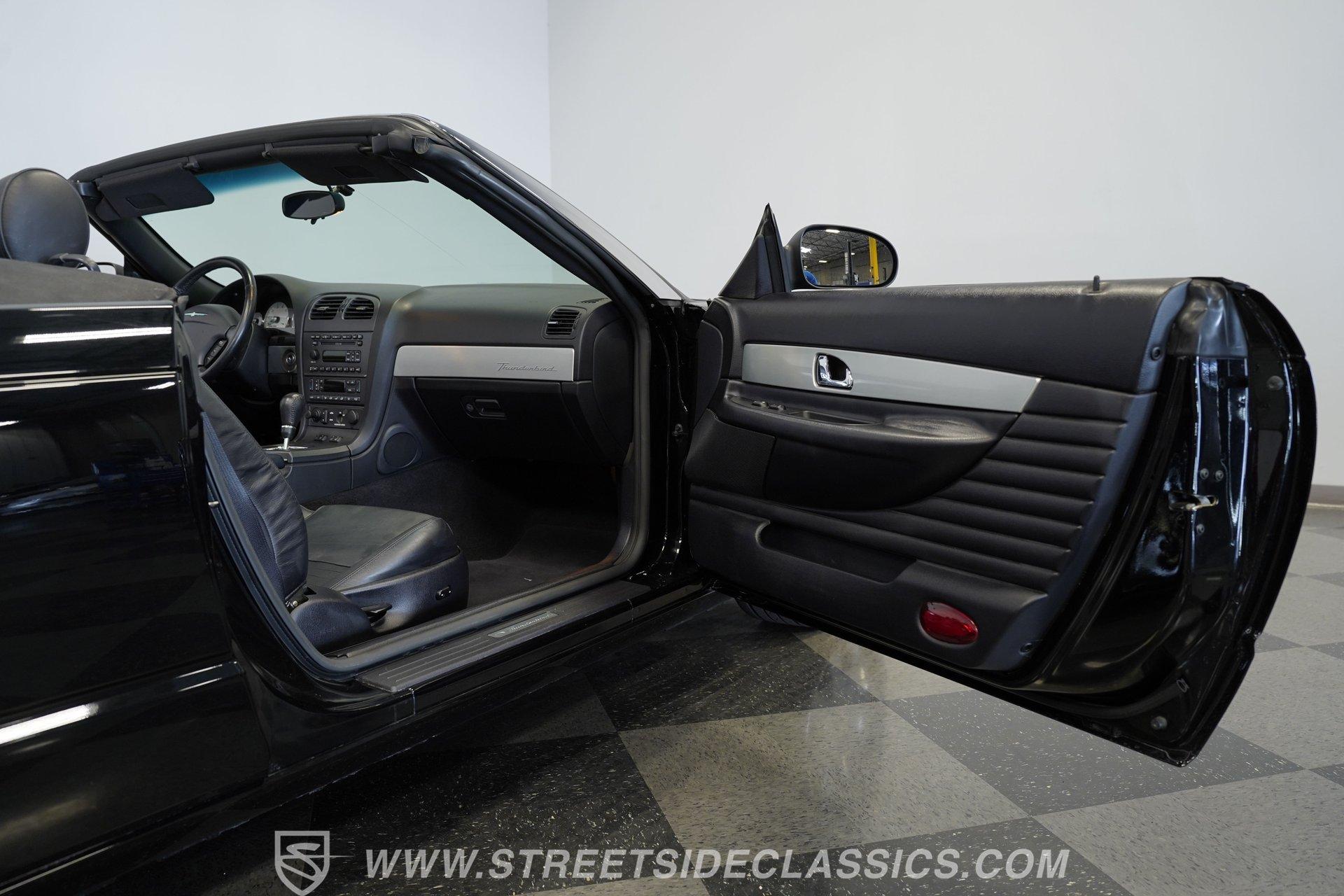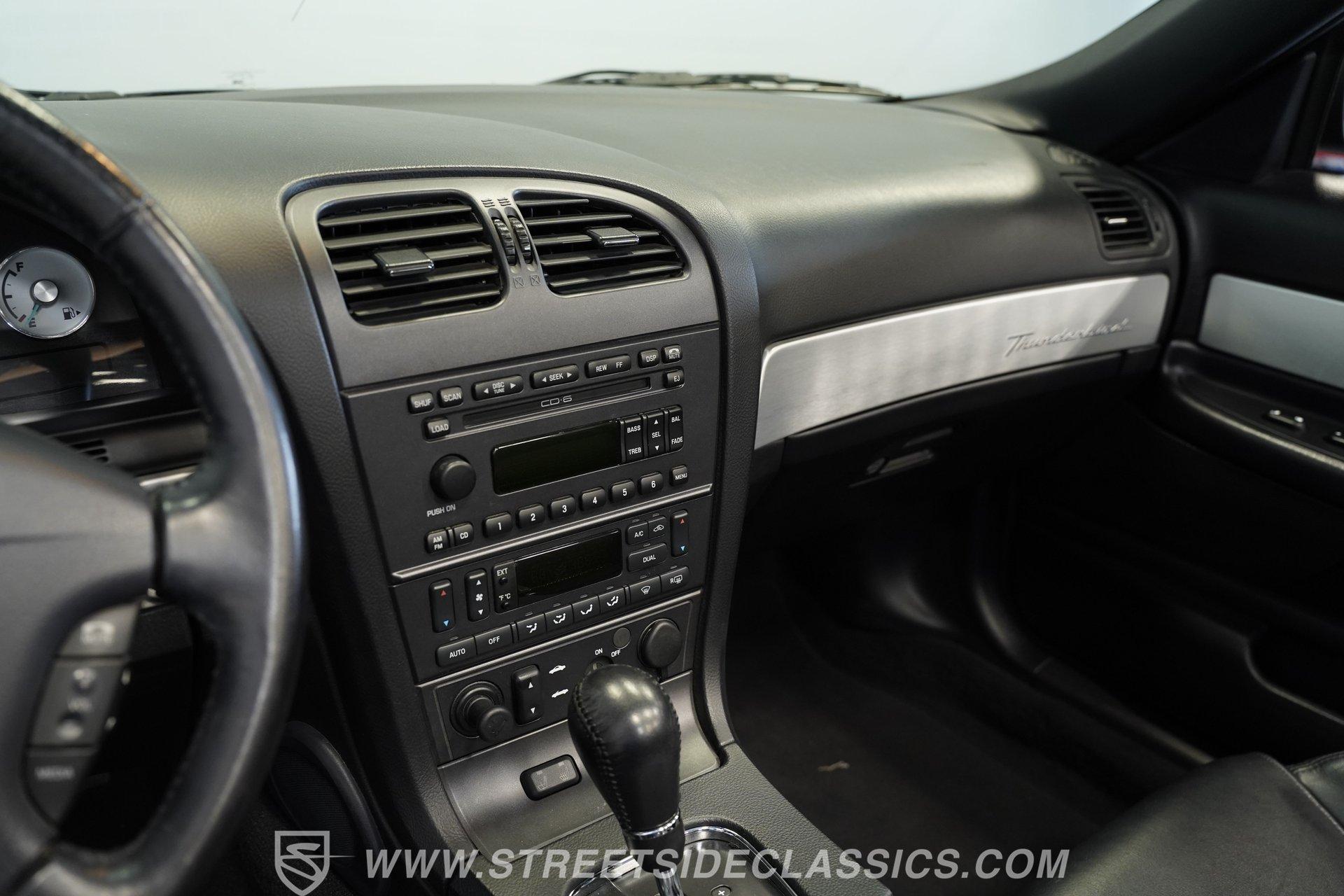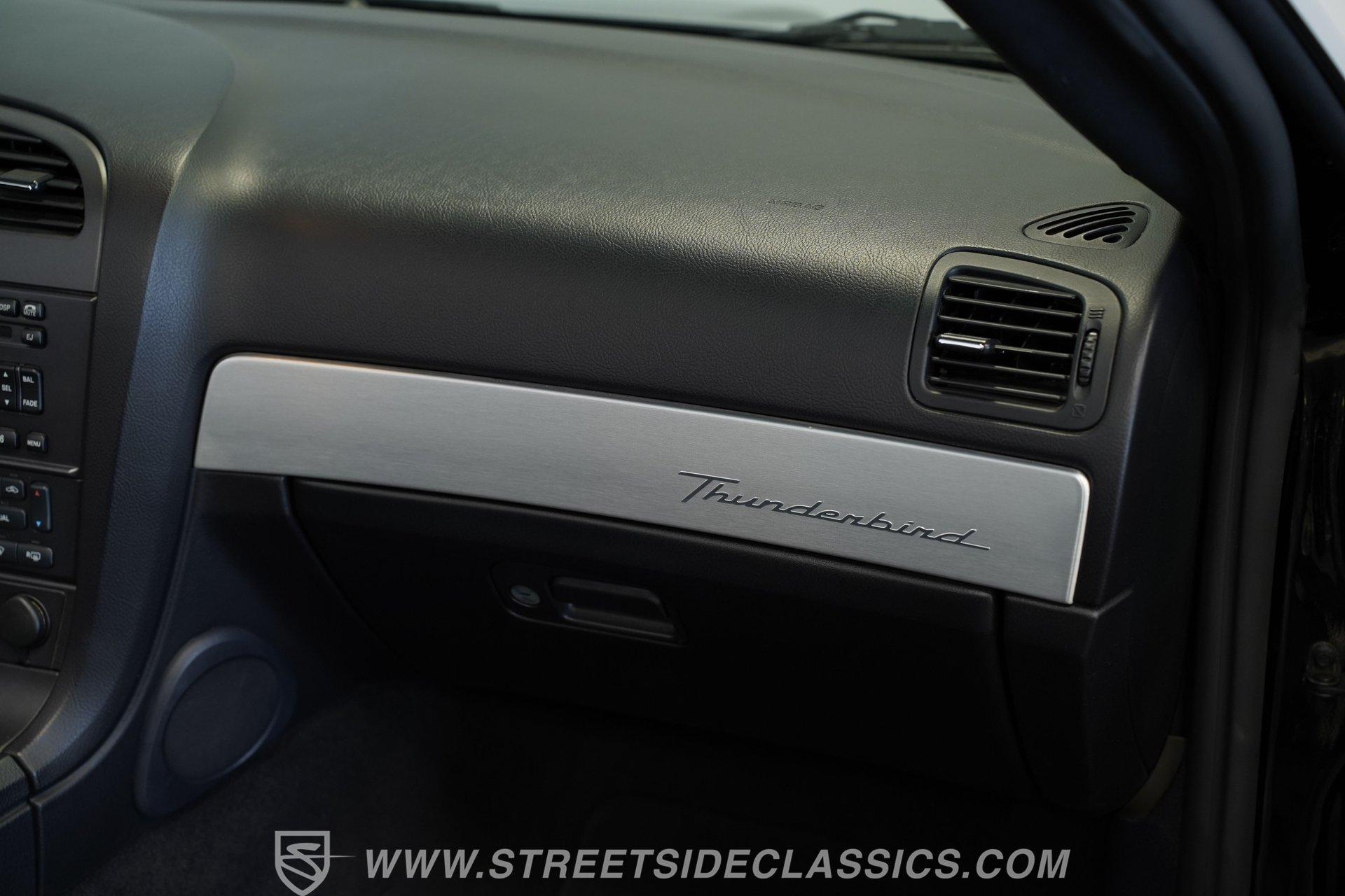 This generation Thunderbird, finished elegantly in Ebony Black with a Black interior, features automatic A/C climate control and heated seats, allowing you to drive comfortably with the top down nearly all year round. This car was created to be a terrific cruiser loaded with power windows, power locks, keyless entry/alarm, dual front airbags, a premium AM/FM/6-CD changer stereo and cruise control. The leather seats feel comfy and have a well-respected style with the kind of use that goes with the low mileage. The power driver's seat gets you in the right position to really see nice details such as the steering wheel's classic turquoise streak in the Thunderbird logo that is coordinated with the needles on the gauges.