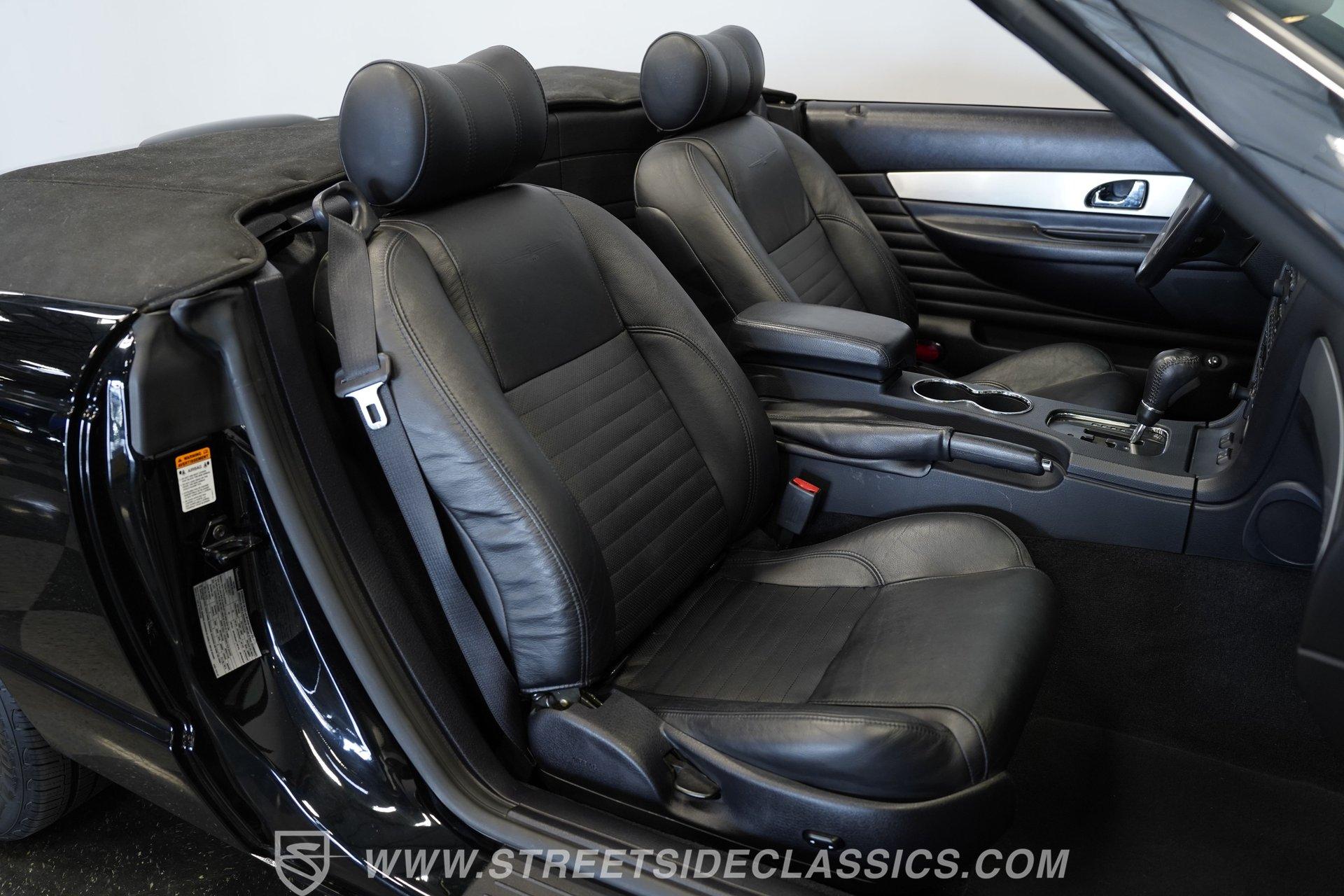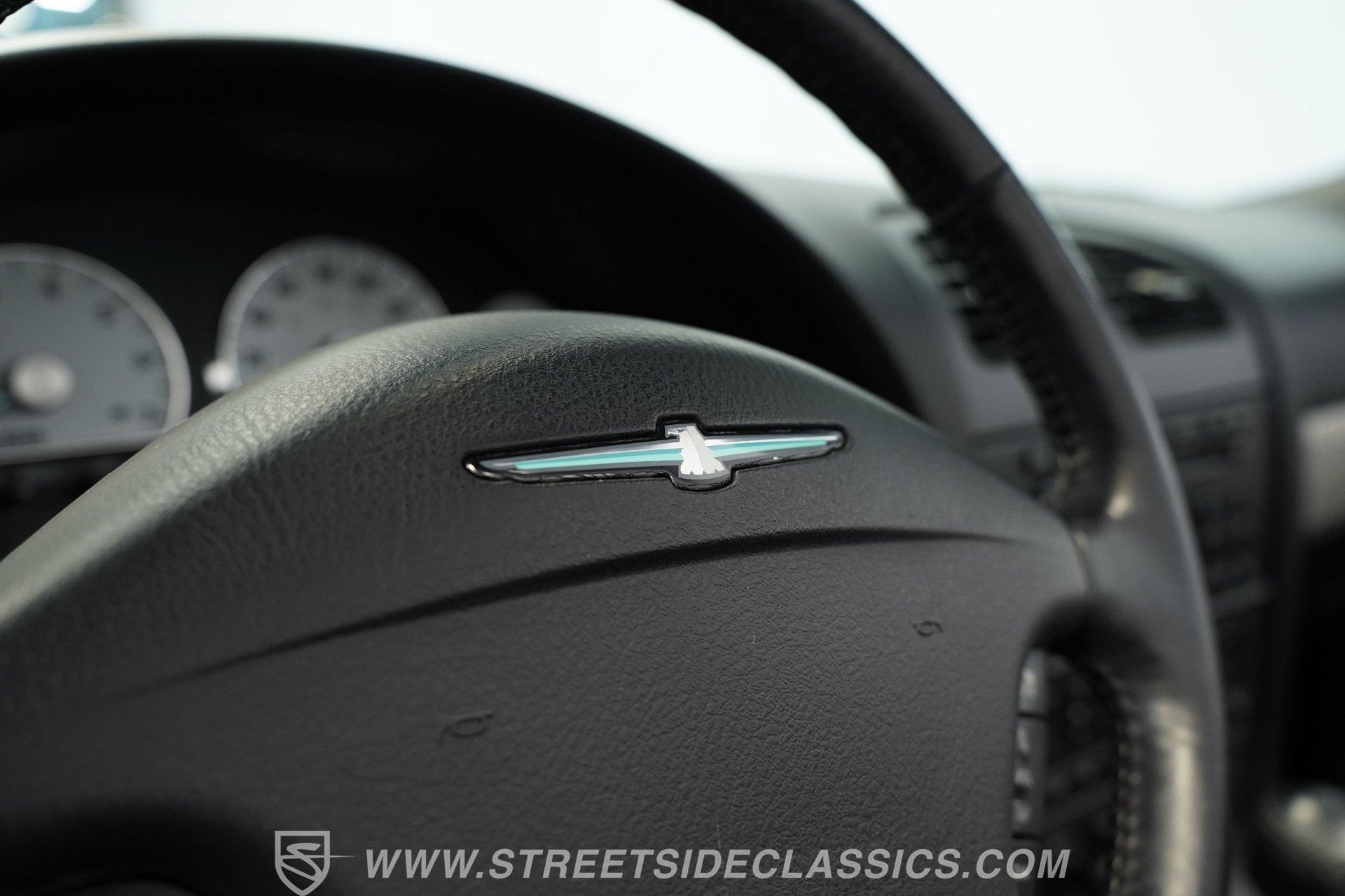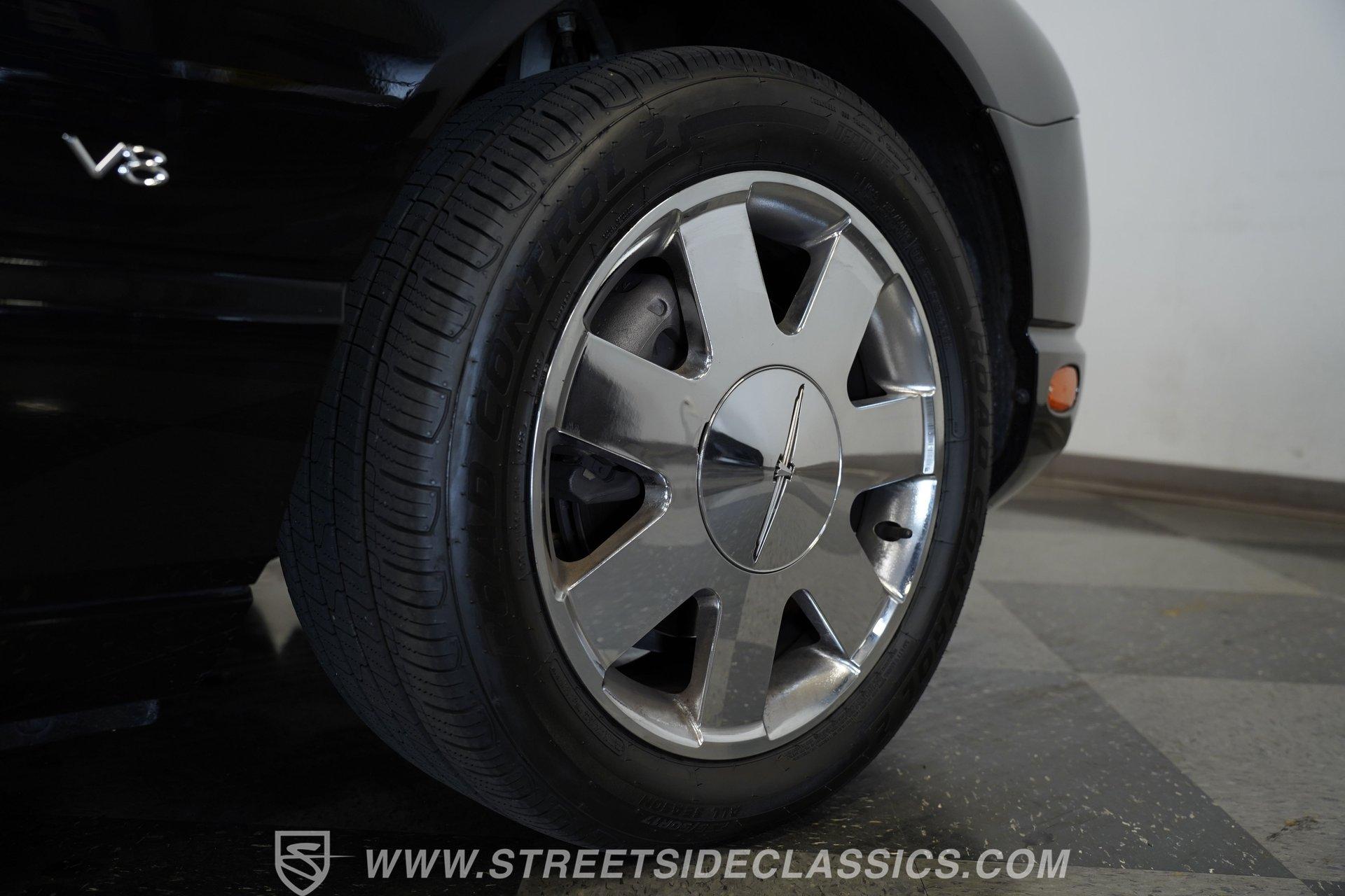 This generation Thunderbird, finished elegantly in Ebony Black with a Black interior, features automatic A/C climate control and heated seats, allowing you to drive comfortably with the top down nearly all year round. This car was created to be a terrific cruiser loaded with power windows, power locks, keyless entry/alarm, dual front airbags, a premium AM/FM/6-CD changer stereo and cruise control. The leather seats feel comfy and have a well-respected style with the kind of use that goes with the low mileage. The power driver's seat gets you in the right position to really see nice details such as the steering wheel's classic turquoise streak in the Thunderbird logo that is coordinated with the needles on the gauges.