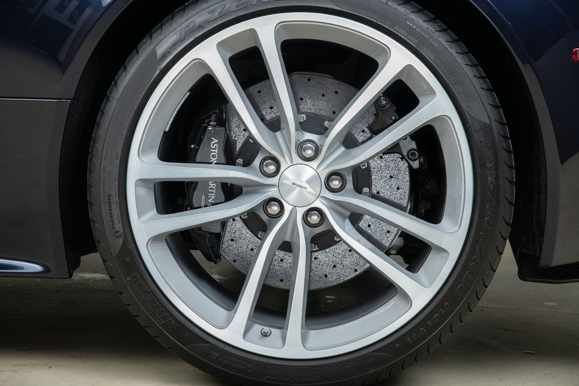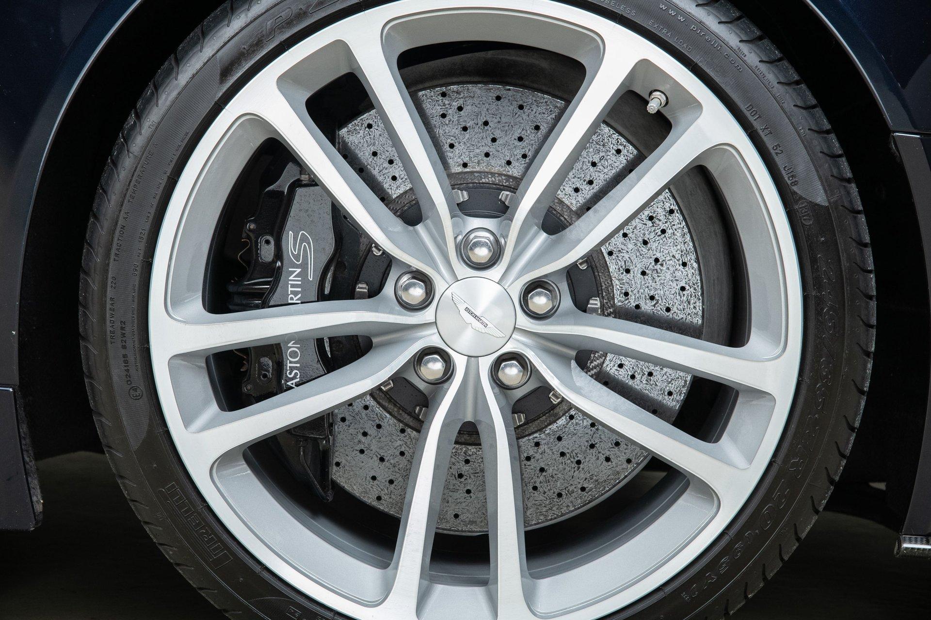 Aston Martin engineered the DBS Volante to maintain the rigidity and athleticism of the coupe by utilizing advanced materials to keep the vehicle balanced and responsive. Extensive use of carbon fiber for the hood, trunk, and front fenders helps offset the structural weight of the convertible mechanism, keeping the curb weight around 4,000 pounds. The motorized fabric soft top can be raised or lowered in just 14 seconds at speeds of up to 30 mph. For precise handling and stopping power, it features standard high-performance carbon-ceramic matrix brakes to reduce unsprung weight, as well as an adaptive damping system with driver-adjustable modes that allows it to transition seamlessly from a comfortable highway cruiser to a stiff, track-focused sports car.