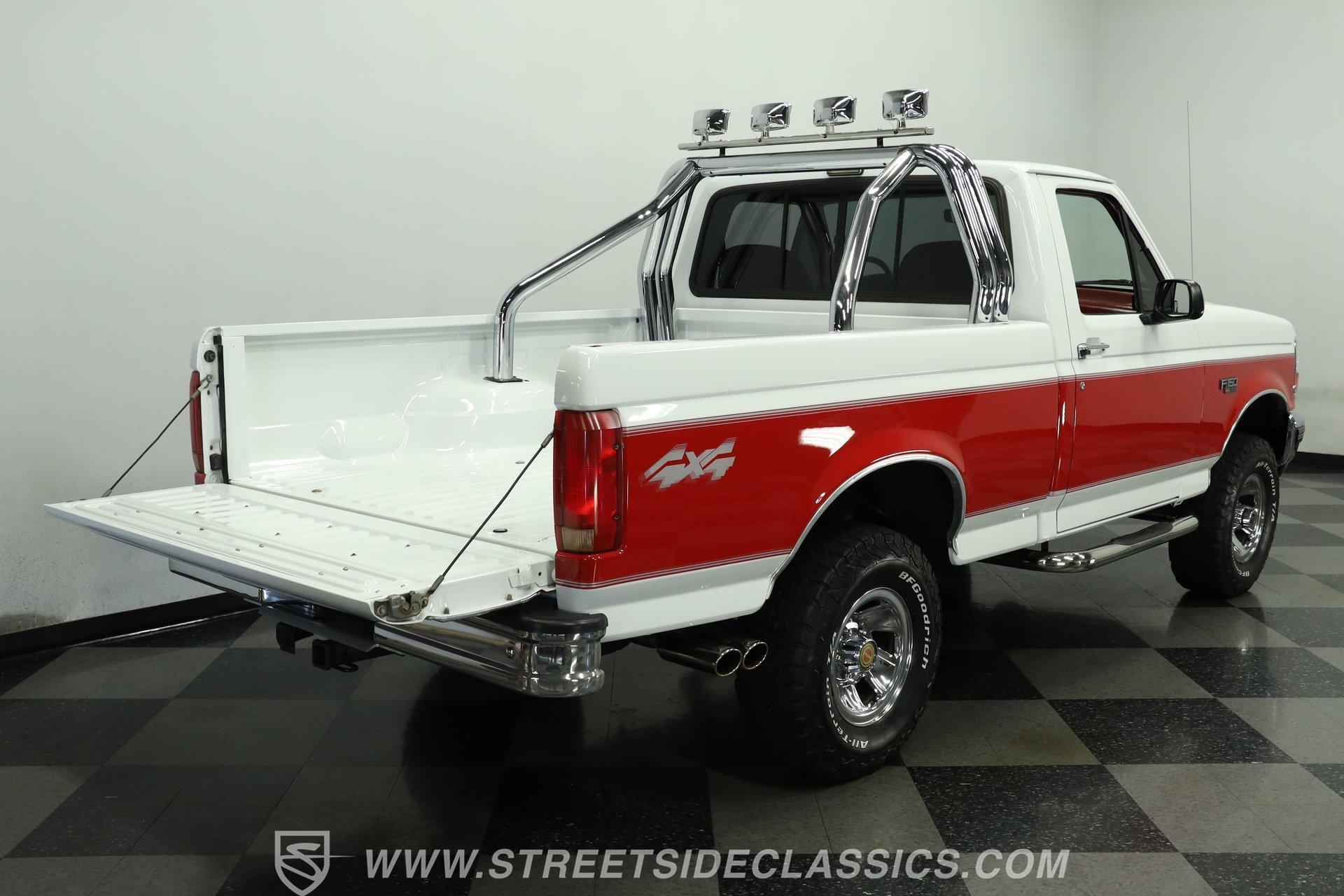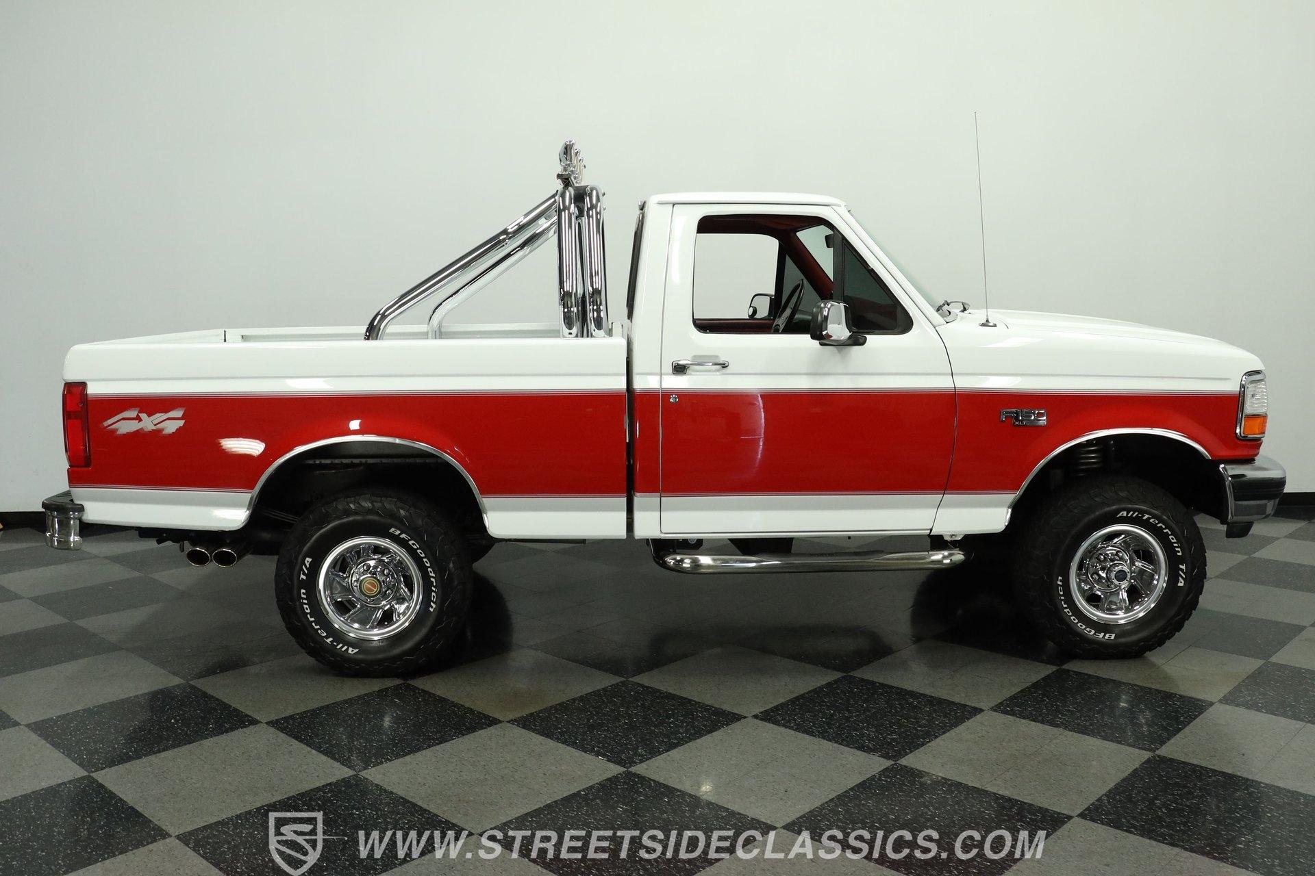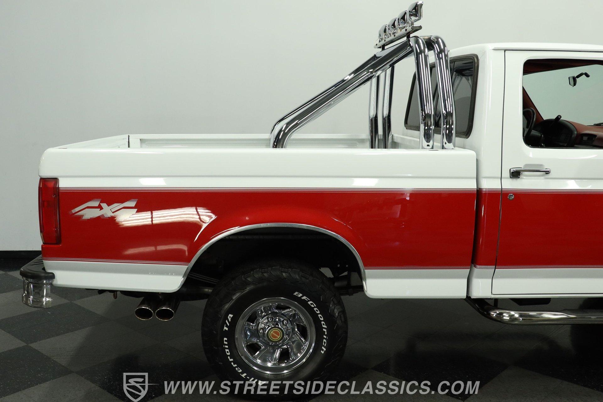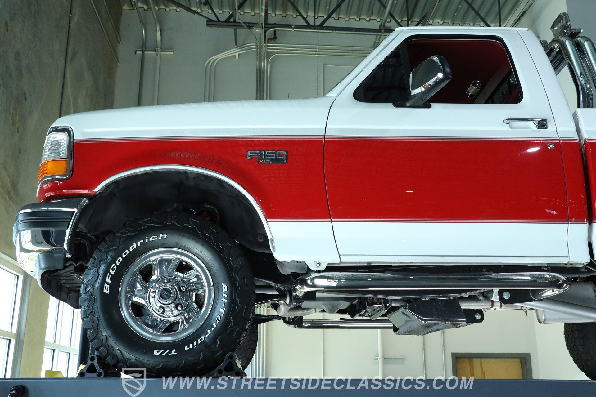 Here's a real-deal truck for classic pickup enthusiasts. This 1992 Ford F-150 XLT 4x4 short bed looks great in its white and red two-tone paint scheme. The finish still holds a nice gloss, while the chrome wheels and bumpers shine well. Up front, the grille is in good condition, and out back, the tailgate and roll bar with four auxiliary lights complete the classic lifted-truck look. Body panels are straight with proper gaps, and the doors, hood, and tailgate all close firmly. The lifted stance is well executed, and the step-sides remain solid, making entry and exit easy.