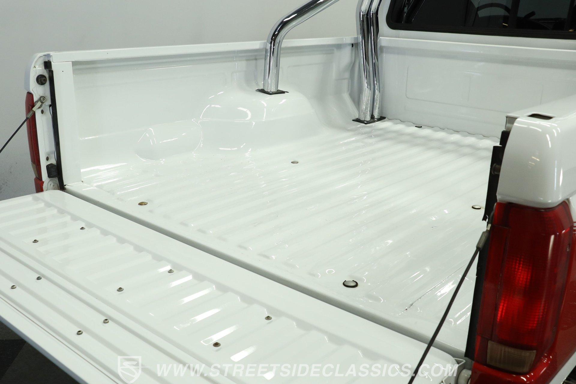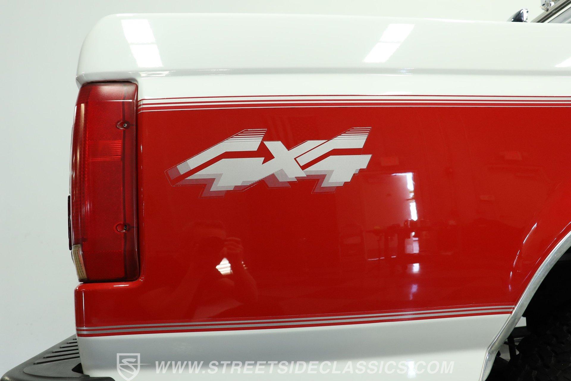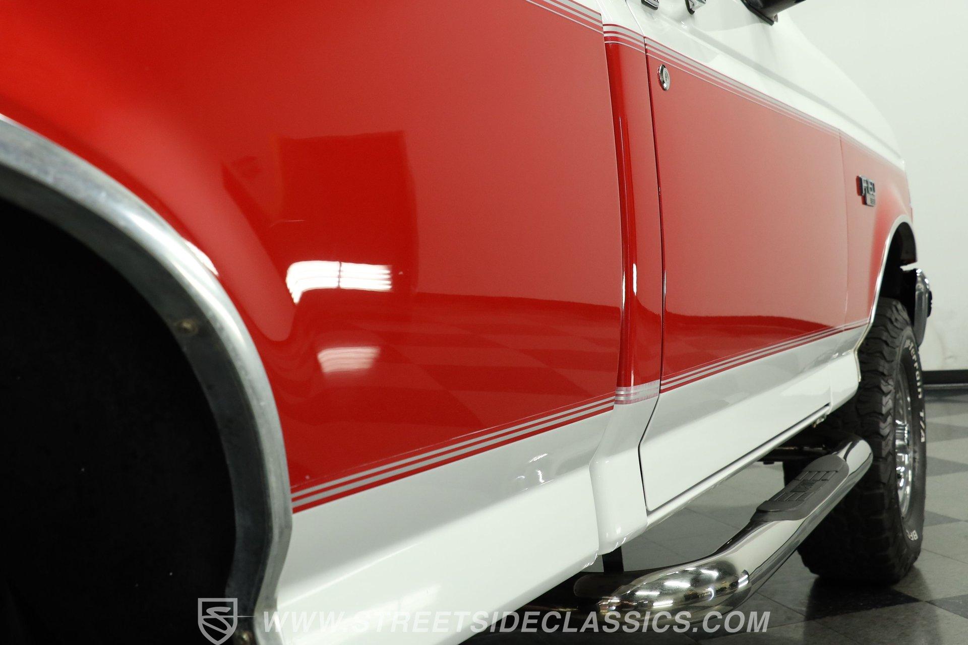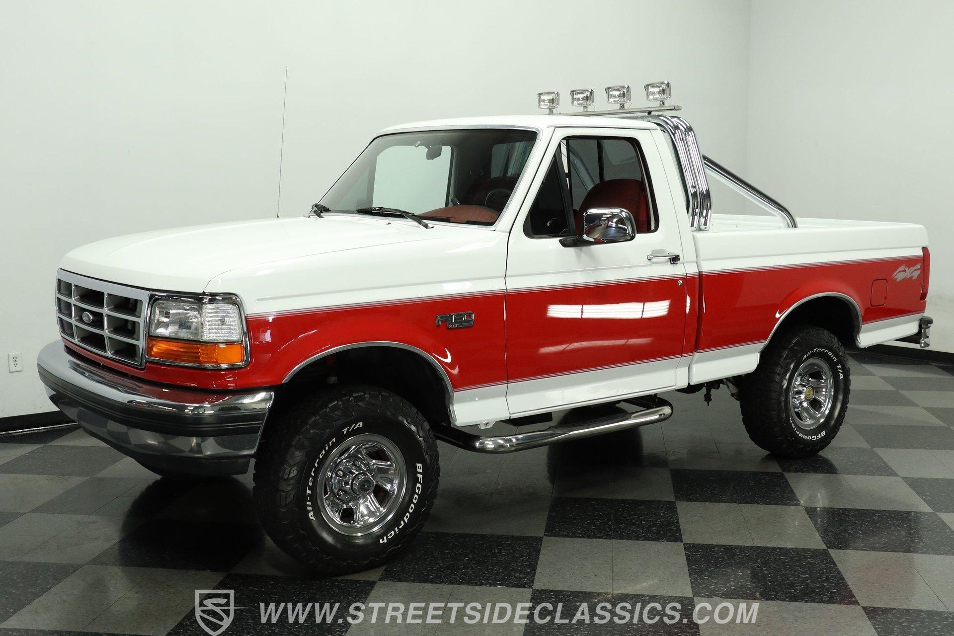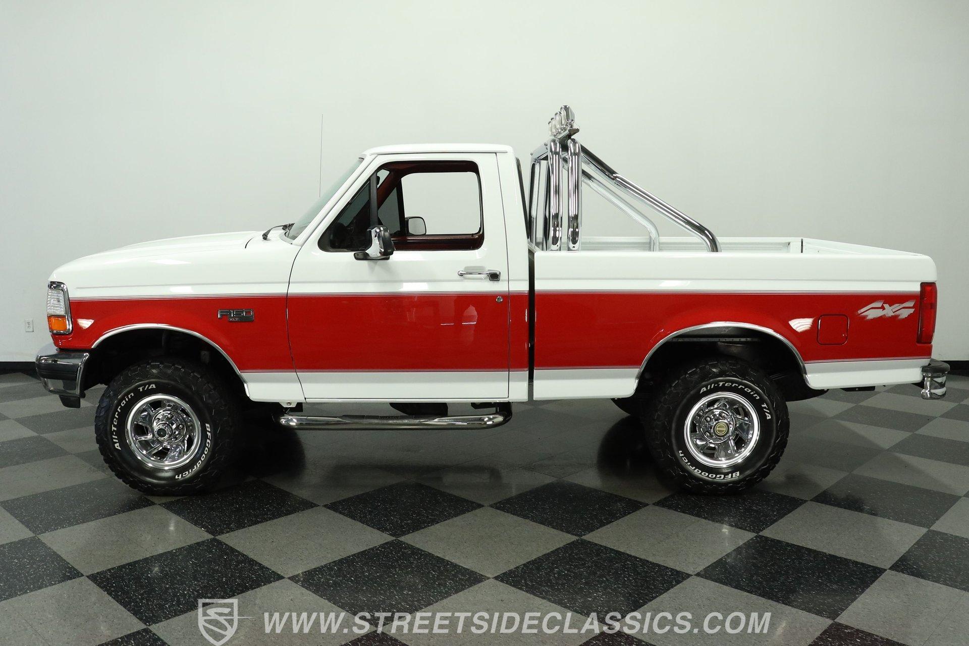 Here's a real-deal truck for classic pickup enthusiasts. This 1992 Ford F-150 XLT 4x4 short bed looks great in its white and red two-tone paint scheme. The finish still holds a nice gloss, while the chrome wheels and bumpers shine well. Up front, the grille is in good condition, and out back, the tailgate and roll bar with four auxiliary lights complete the classic lifted-truck look. Body panels are straight with proper gaps, and the doors, hood, and tailgate all close firmly. The lifted stance is well executed, and the step-sides remain solid, making entry and exit easy.
