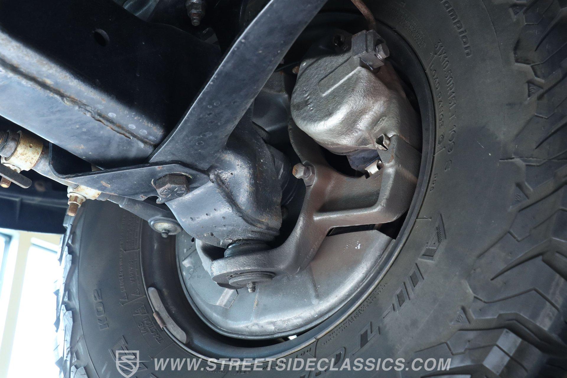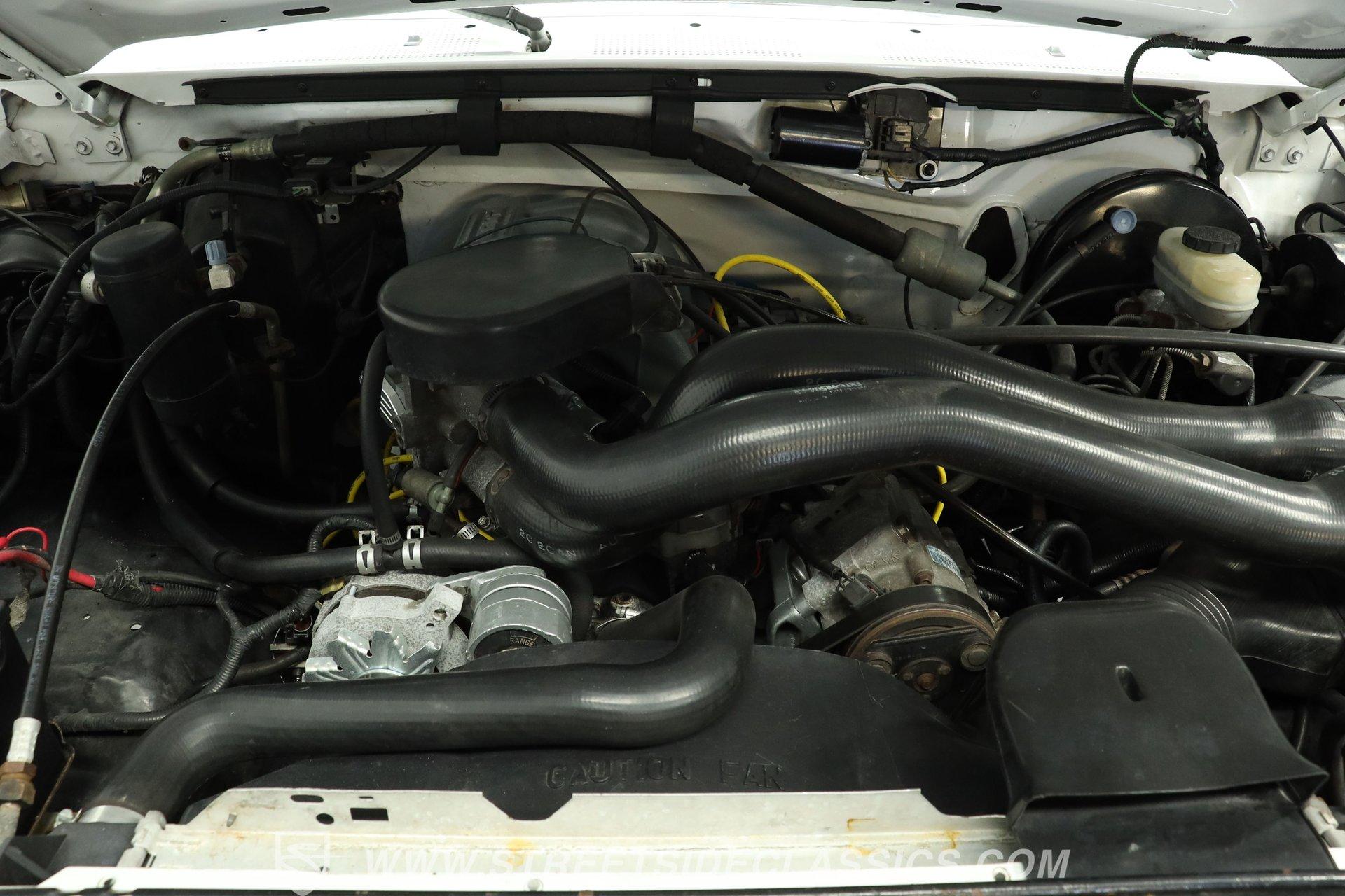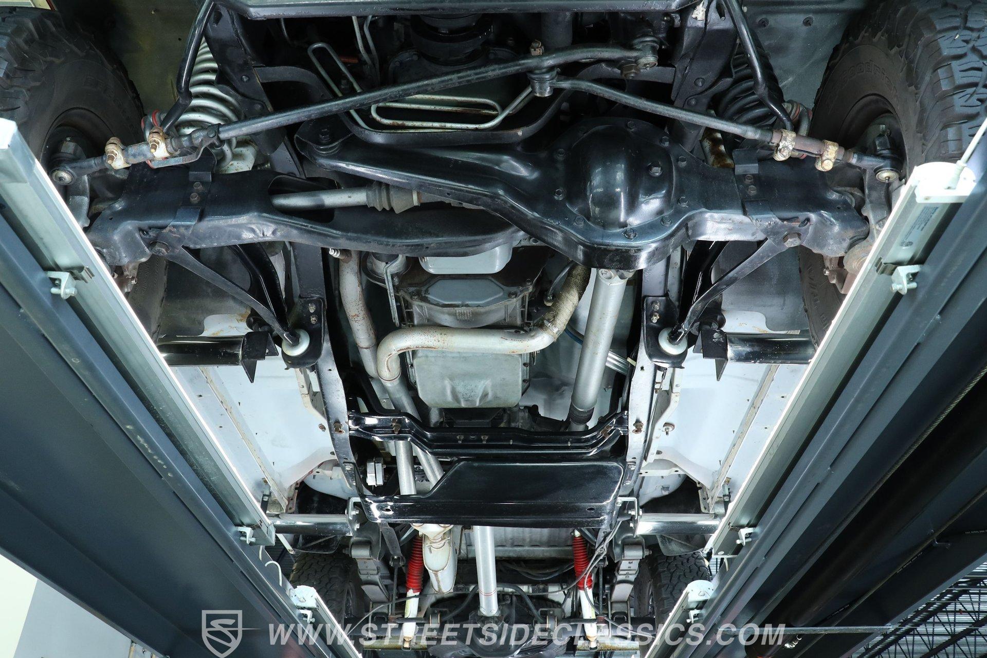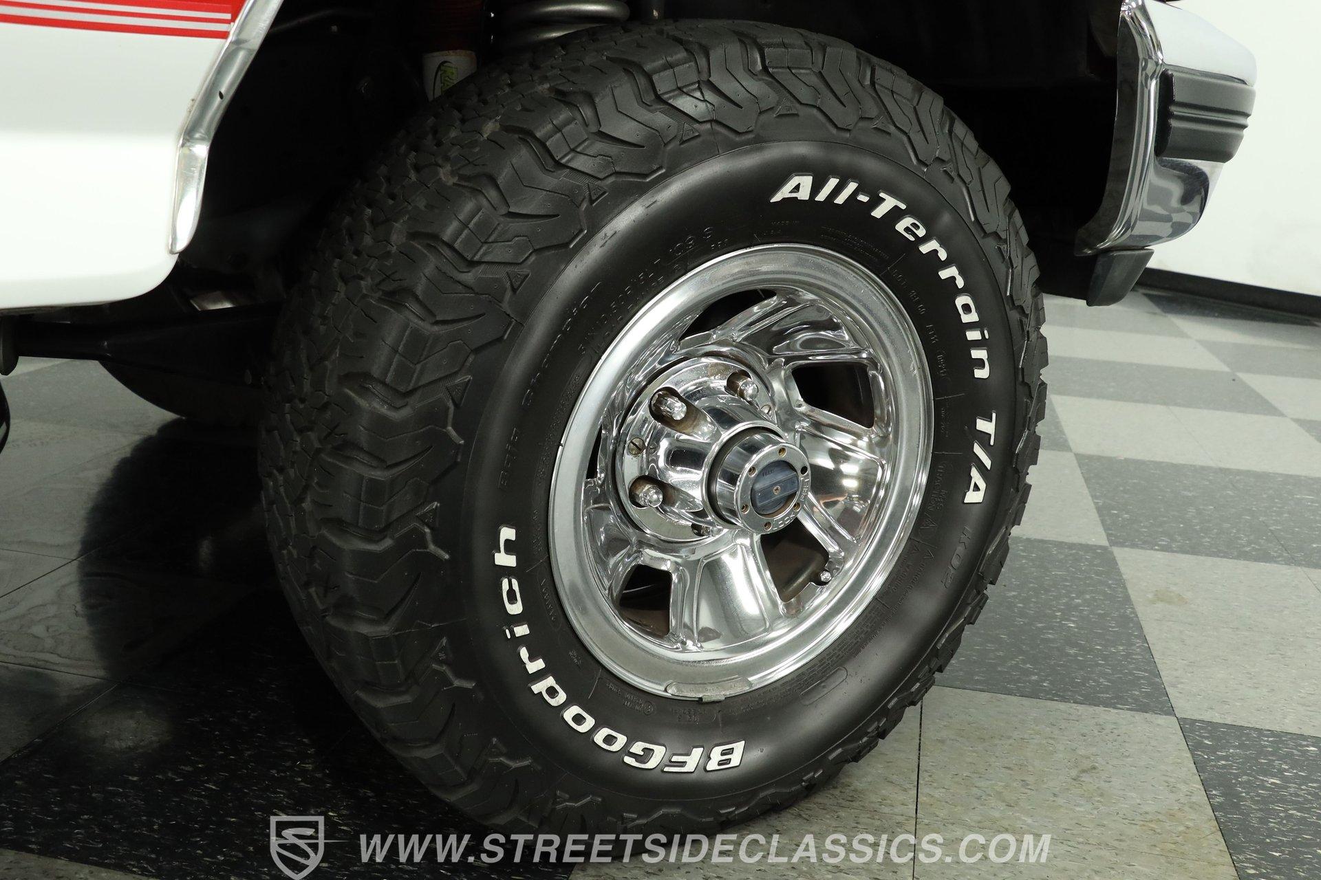 Power comes from the dependable 5.0-liter fuel-injected Windsor V8, paired with a 4-speed automatic transmission with overdrive. The factory-style suspension has been lifted, but still retains solid road manners. Anti-lock front power disc brakes and rear power drum brakes provide confident stopping. Chrome 15-inch wheels at all four corners are wrapped in 31x10.50R15LT tires, enhancing both the stance and drivability. To give the truck a deeper tone, shorty headers feed into a dual exhaust setup that transitions through an aftermarket muffler before exiting as a single outlet.