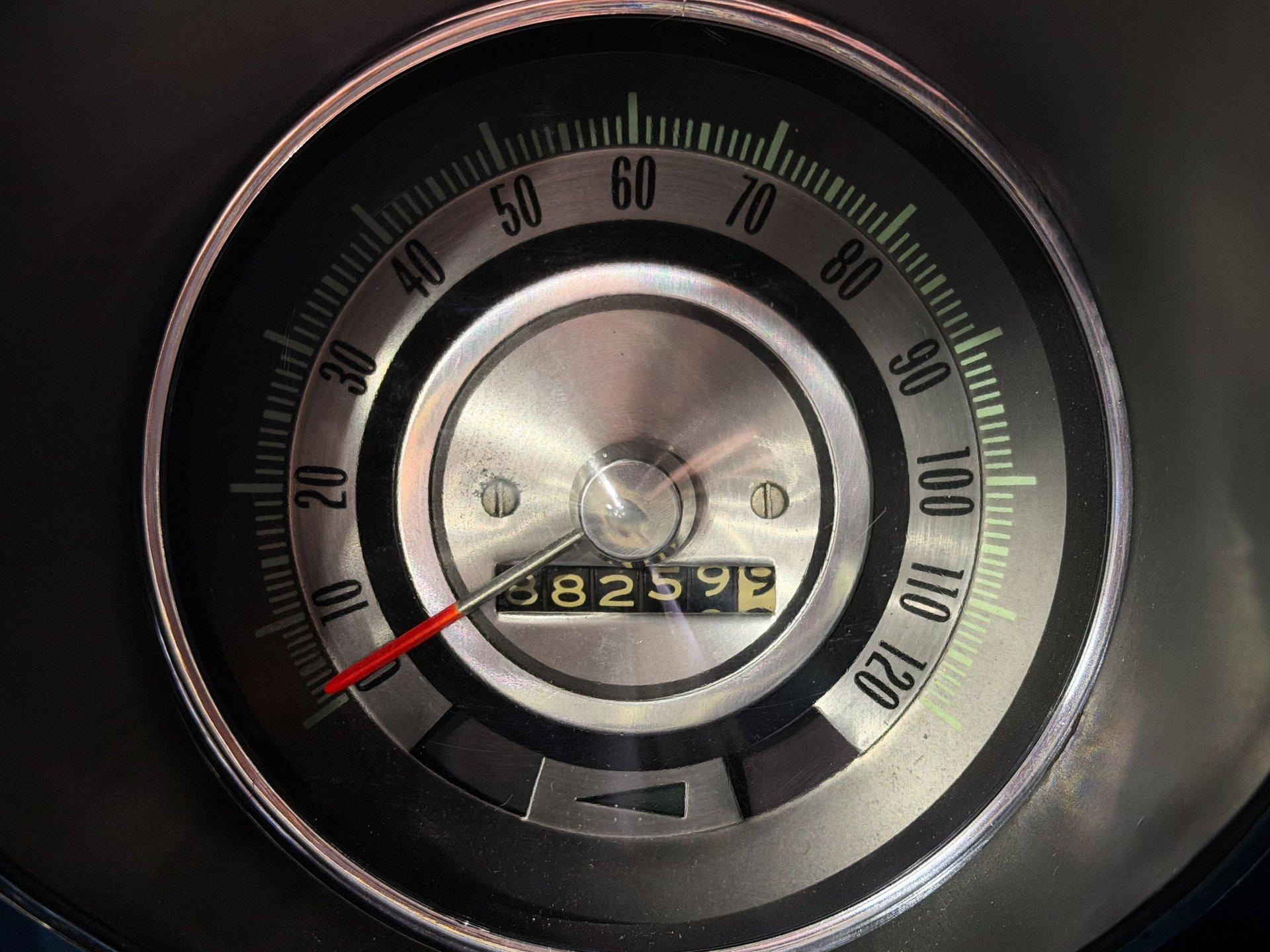 INTERIOR: The bright blue interior really pops in this car! It's a deluxe which includes molded door panels and upgraded upholstery. The front seats have TMI custom bolstered cushions that are really comfortable. The carpet has been replaced and also has embroidered mats. New dash pad and steering wheel. It has a factory tick tock tachometer and a center console with upgraded gauges. Upgraded with Vintage Air electric slide controls and a retro AM/FM stereo that looks original. The speakers also look factory in the kick panels.