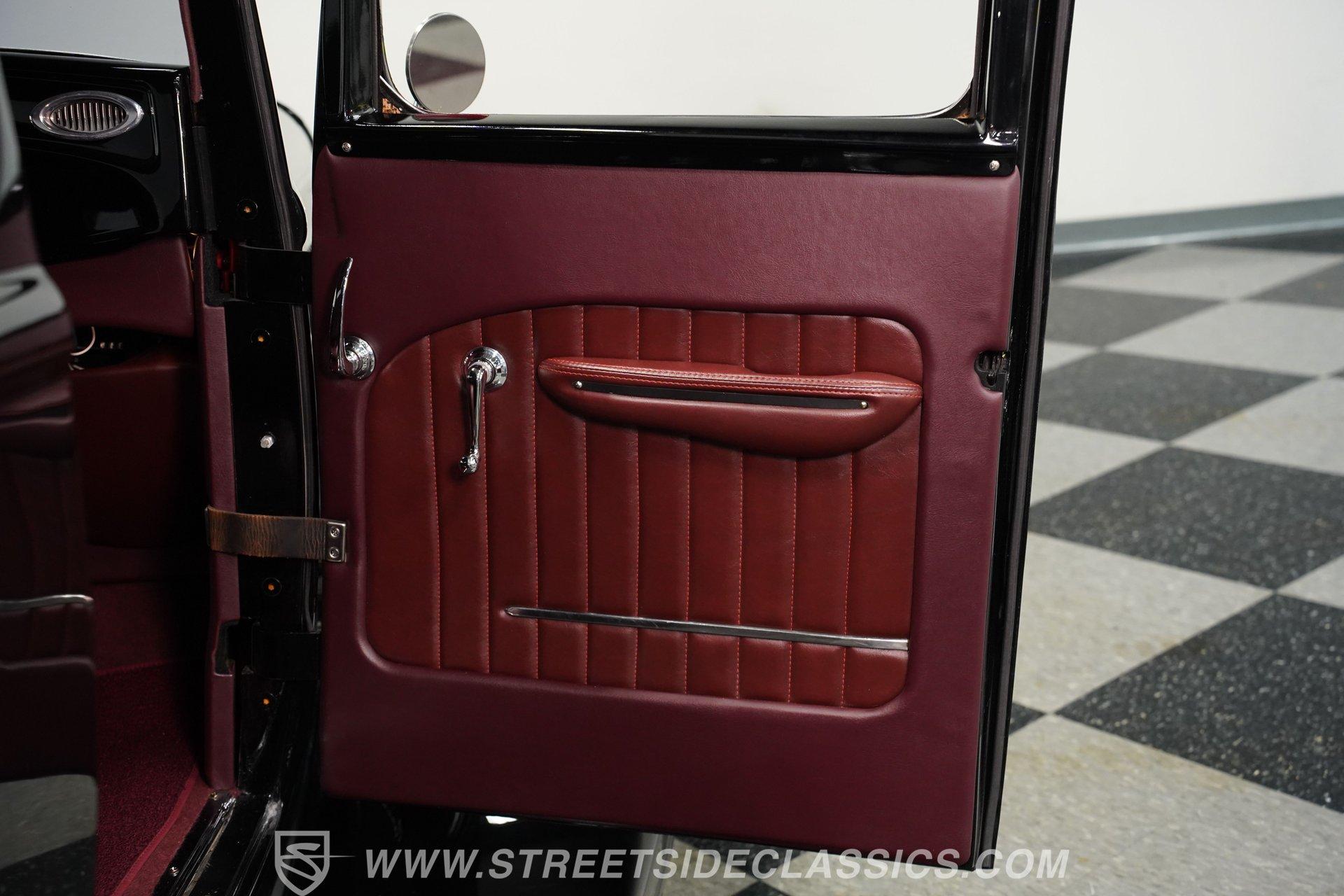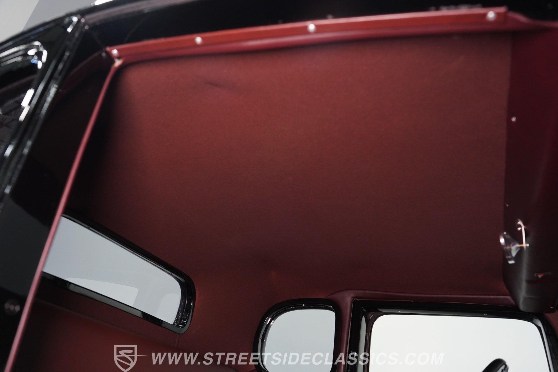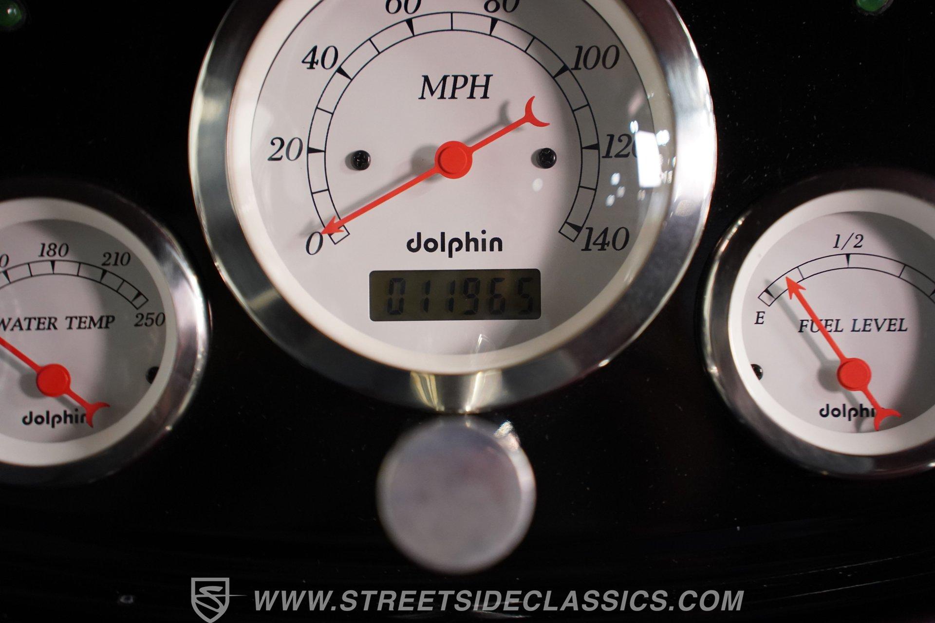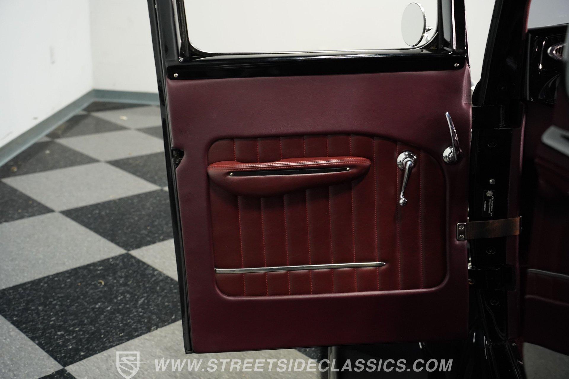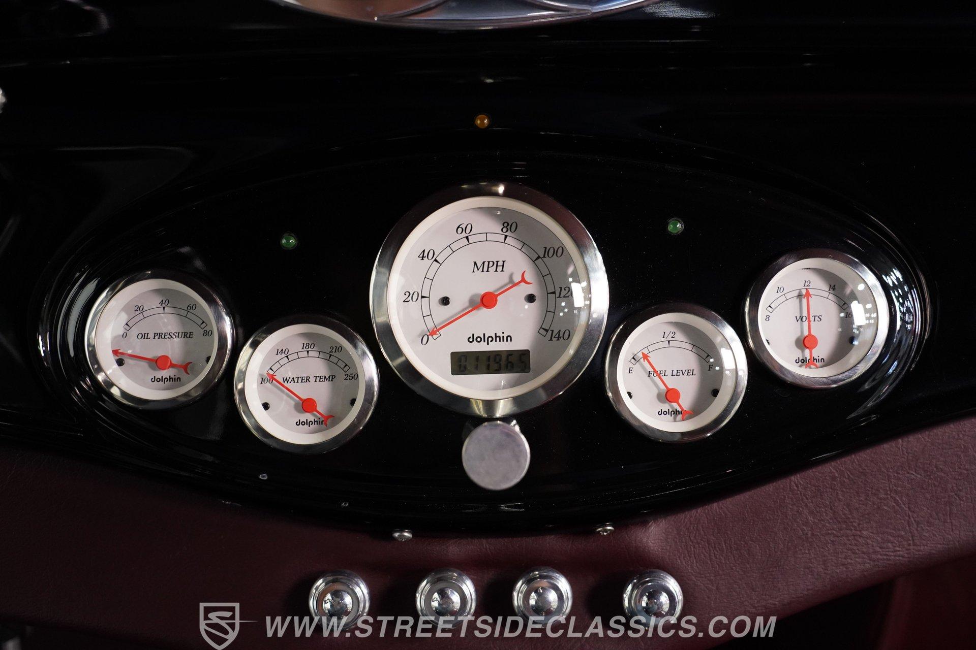 Step inside and you will find an interior that blends period charm with functional upgrades. The maroon vinyl bench seat and matching floor mats present very well, and the carpet is clean. The build includes a tilt column, Dolphin gauges, Tea's Seat, and custom cup holders in the floor for added convenience.