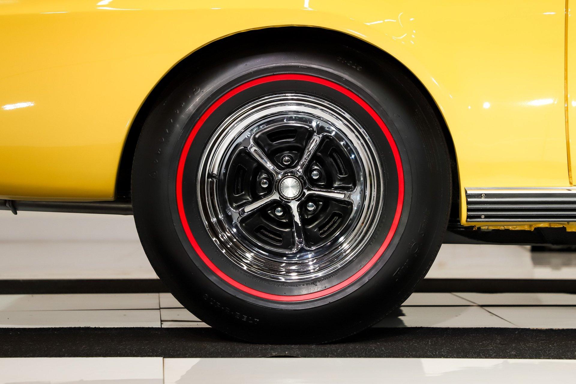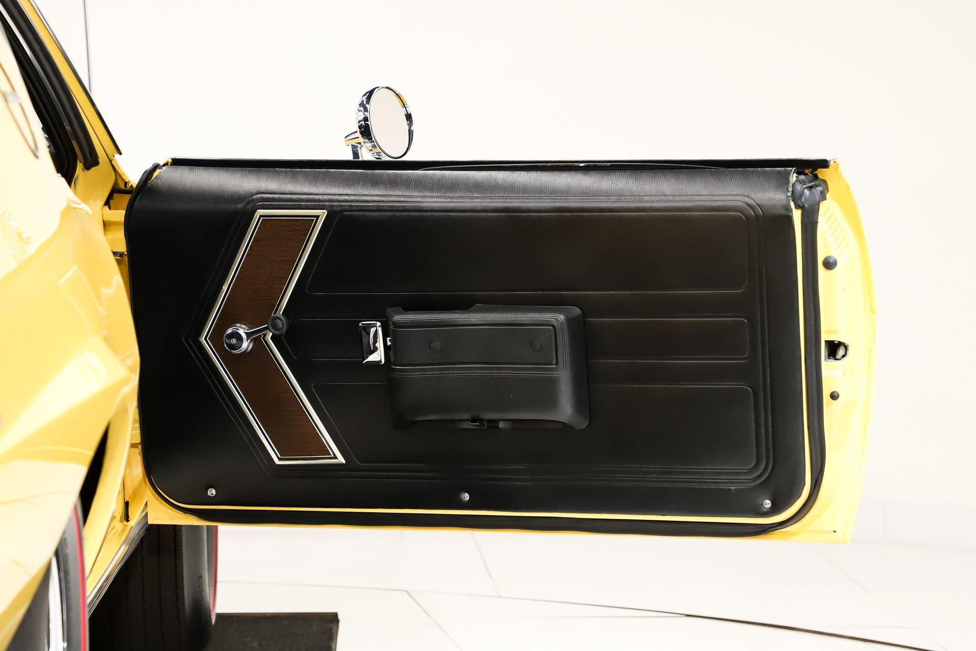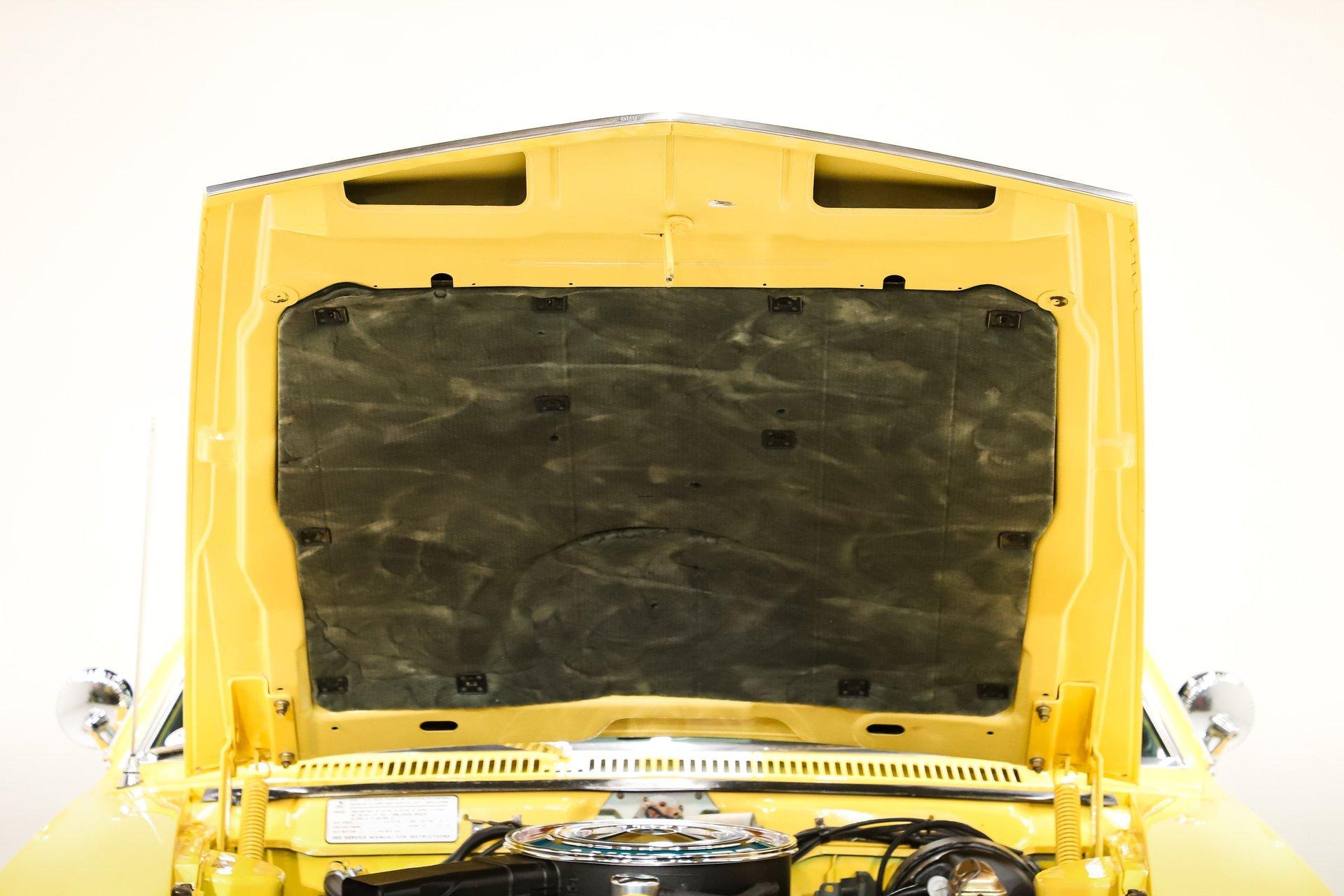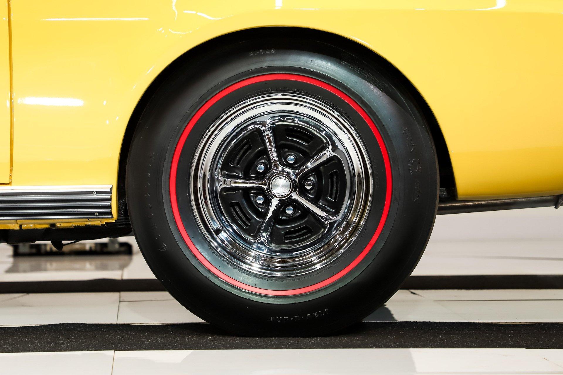 EXTERIOR: It has an unmistakable look, with its short wheelbase giving it a compact, aggressive stance. The long hood, fastback profile, and sculpted body lines deliver classic muscle car proportions with a sporty edge. Claimed to retain its original metal, the body is in amazing condition-laser straight with no rust or damage, and the fit is spot-on. It's a factory yellow car, refinished in a richer shade that looks even better, topped with a smooth, high-gloss finish. The white racing stripes really set it off. The chrome and trim add the perfect contrast-the stainless is straight and polished, and the chrome has been redone. The door handles look fresh and it has optional dual mirrors. The windshield appears new, the rear window is one of the best originals you'll find. It sits proudly on chrome Magnum 500 wheels wrapped in reproduction redline tires for the perfect finishing touch.