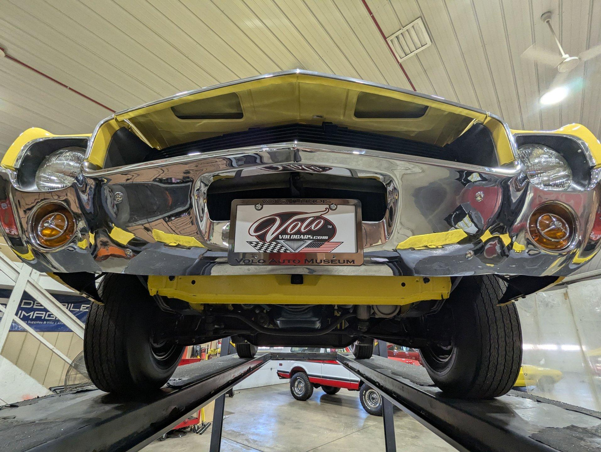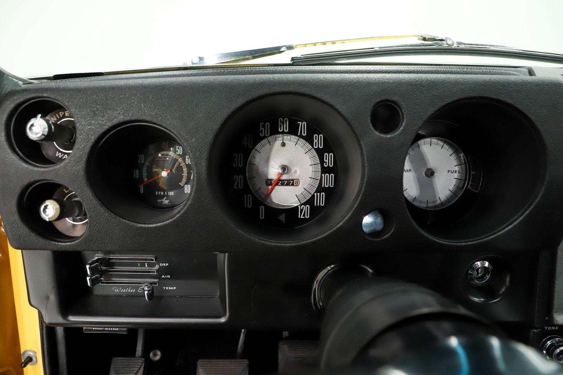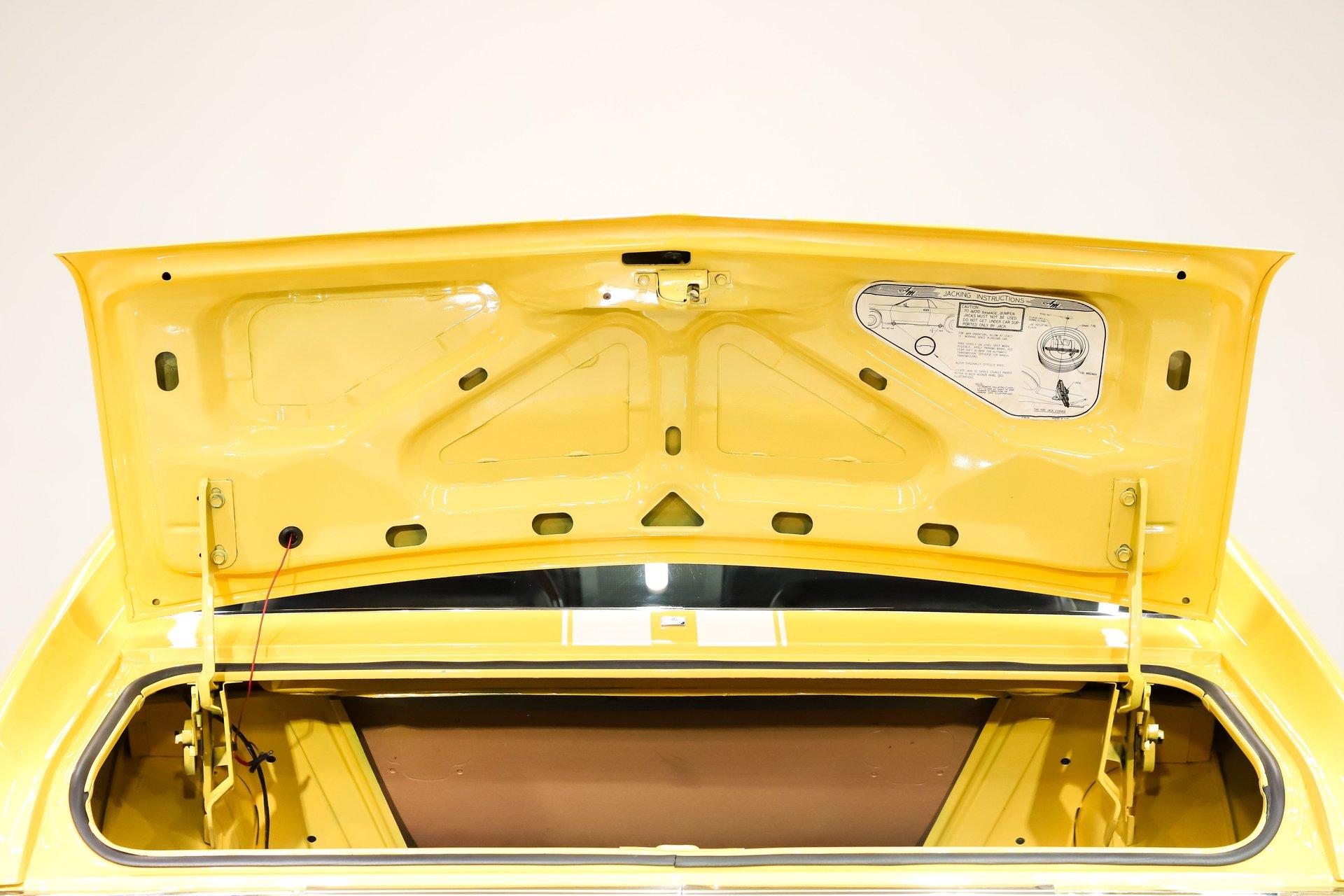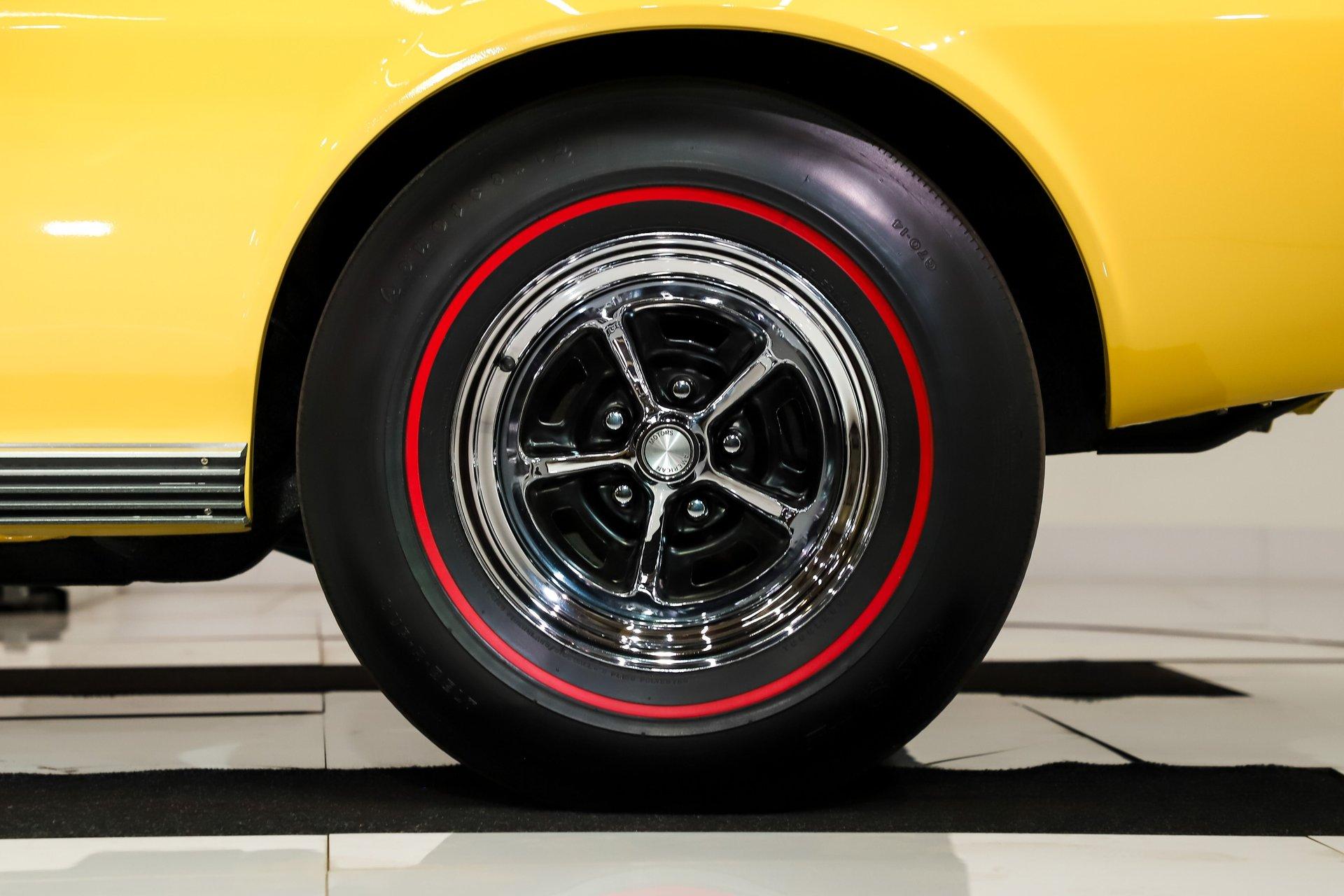 EXTERIOR: It has an unmistakable look, with its short wheelbase giving it a compact, aggressive stance. The long hood, fastback profile, and sculpted body lines deliver classic muscle car proportions with a sporty edge. Claimed to retain its original metal, the body is in amazing condition-laser straight with no rust or damage, and the fit is spot-on. It's a factory yellow car, refinished in a richer shade that looks even better, topped with a smooth, high-gloss finish. The white racing stripes really set it off. The chrome and trim add the perfect contrast-the stainless is straight and polished, and the chrome has been redone. The door handles look fresh and it has optional dual mirrors. The windshield appears new, the rear window is one of the best originals you'll find. It sits proudly on chrome Magnum 500 wheels wrapped in reproduction redline tires for the perfect finishing touch.