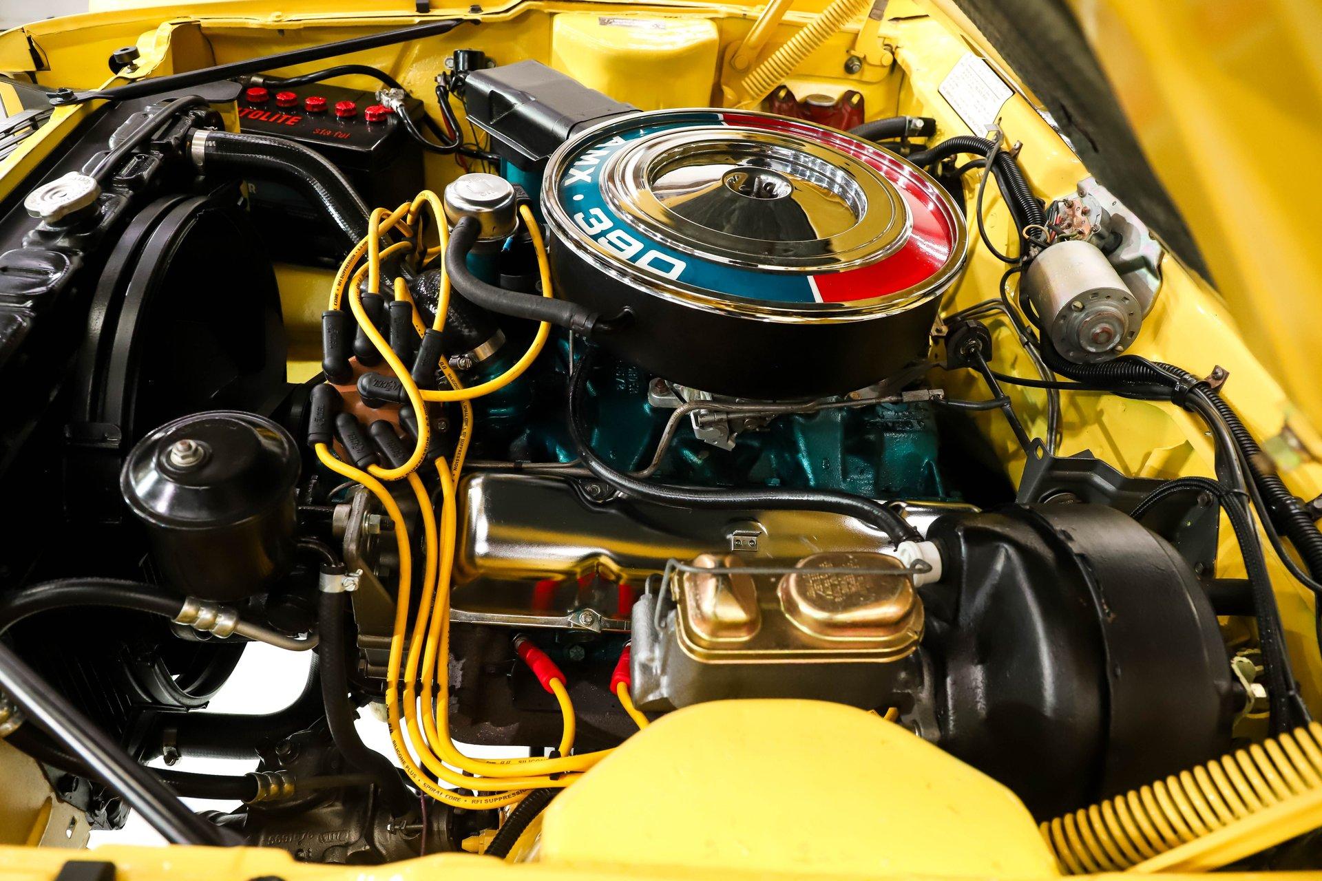 ENGINE COMPARTMENT: The engine compartment presents very nicely with a clean painted bay. At the heart of it is the correct 390 rated at 315 horsepower. It's proper with correct components, including valve covers with correct tag and the factory-style air cleaner with snorkel. It's also well equipped with power steering and power brakes, making it a pleasure to drive. Details like the washer fluid bag, Autolite battery topper, hood insulation, and electric wipers (part of the convenience group) are all in place. The 7-blade fan, included with the Go Pack, helps keep the engine running cool.