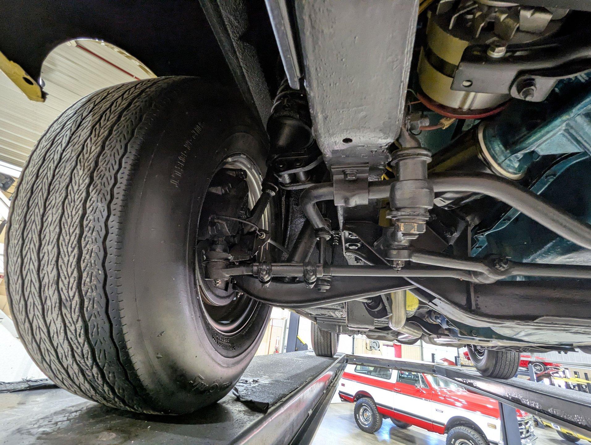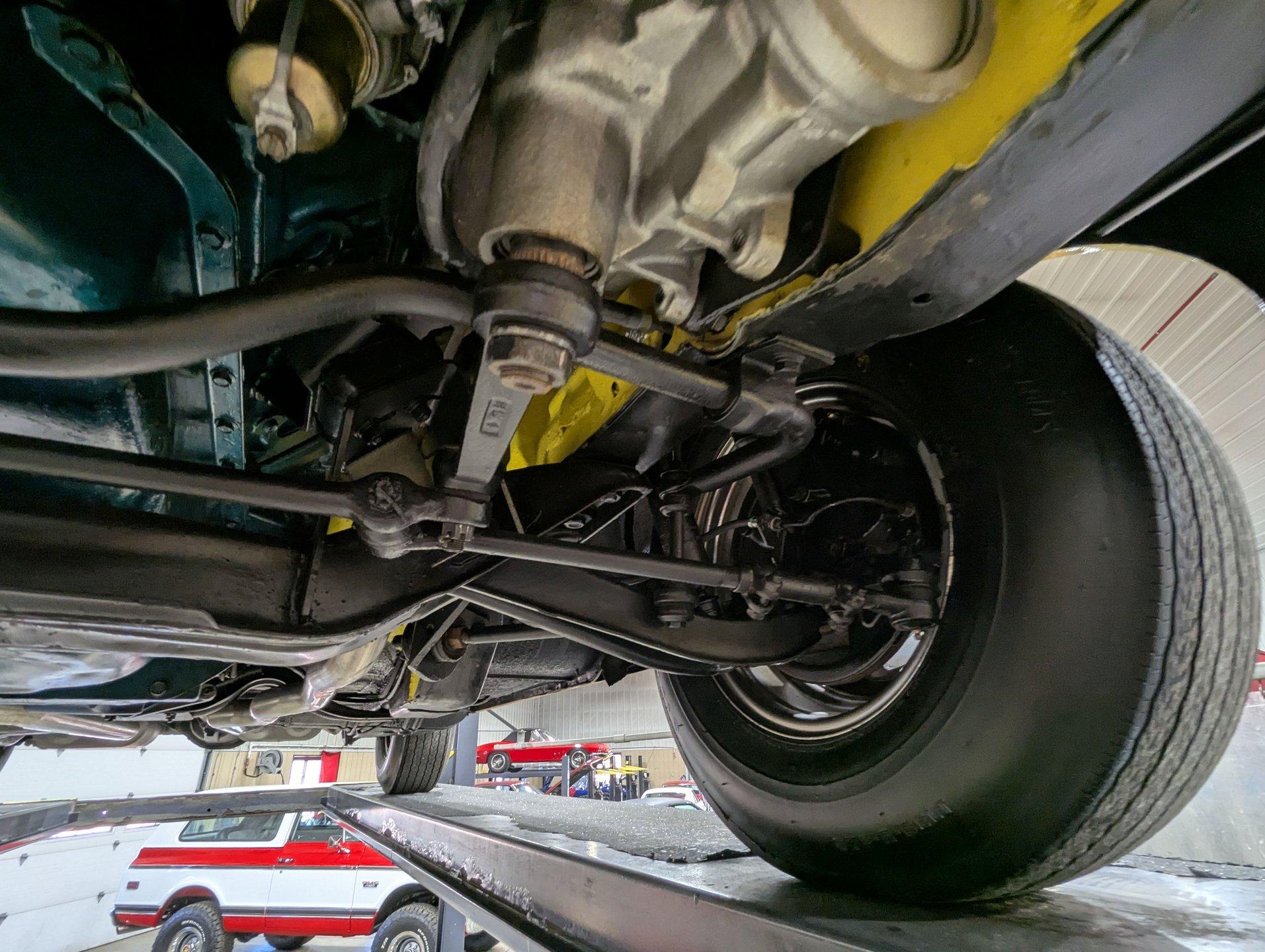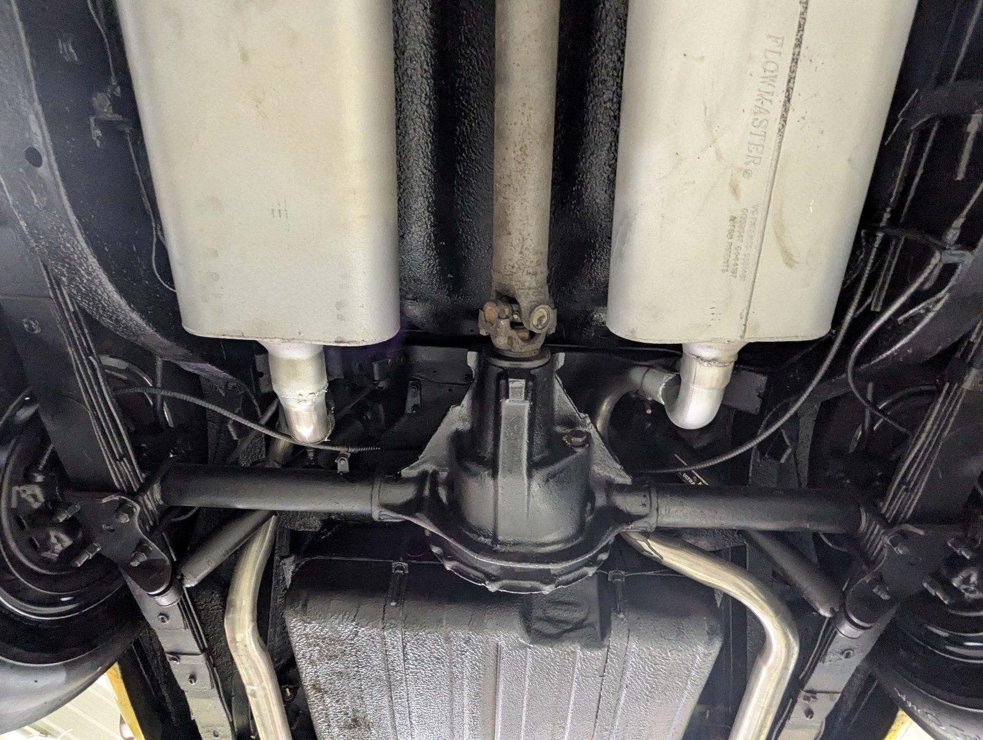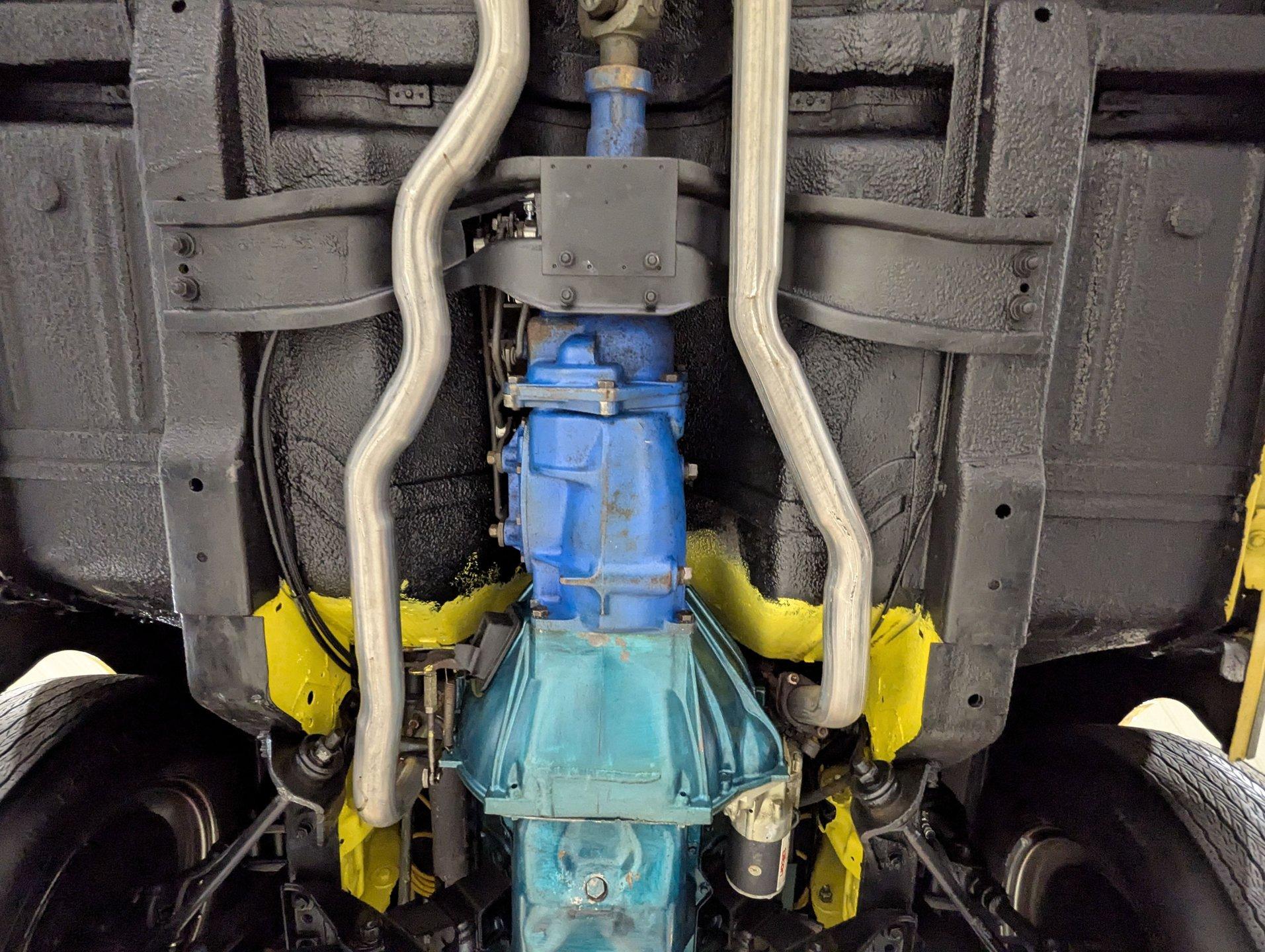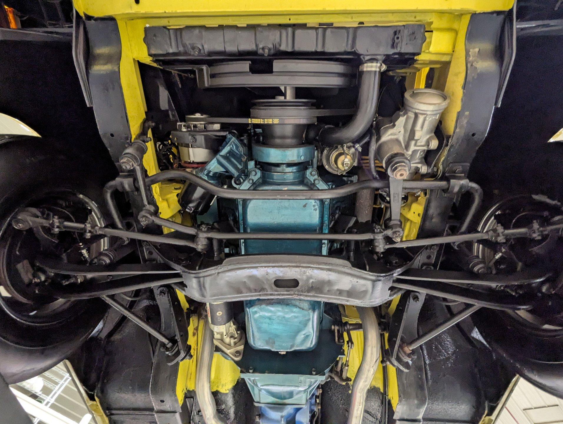 UNDERSIDE: It appears to be very solid and well sorted. Our shop has inspected and serviced the car, including underneath. It's equipped with optional front disc brakes, and the emergency brake is properly hooked up and functioning. The steering and suspension have been gone through to ensure it drives tight and confidently. A new dual exhaust system with Flowmaster mufflers gives it a strong, healthy sound. Looking up at the engine, it's clean and detailed, featuring a high-torque starter for reliable cranking. It's paired to a correct 1968 T10 4-speed trans, and out back it retains its 3.15 posi rear end. The floors and frame rails appear rock solid. They've been treated with fresh undercoating, giving the underside a clean, uniform black appearance while adding protection.