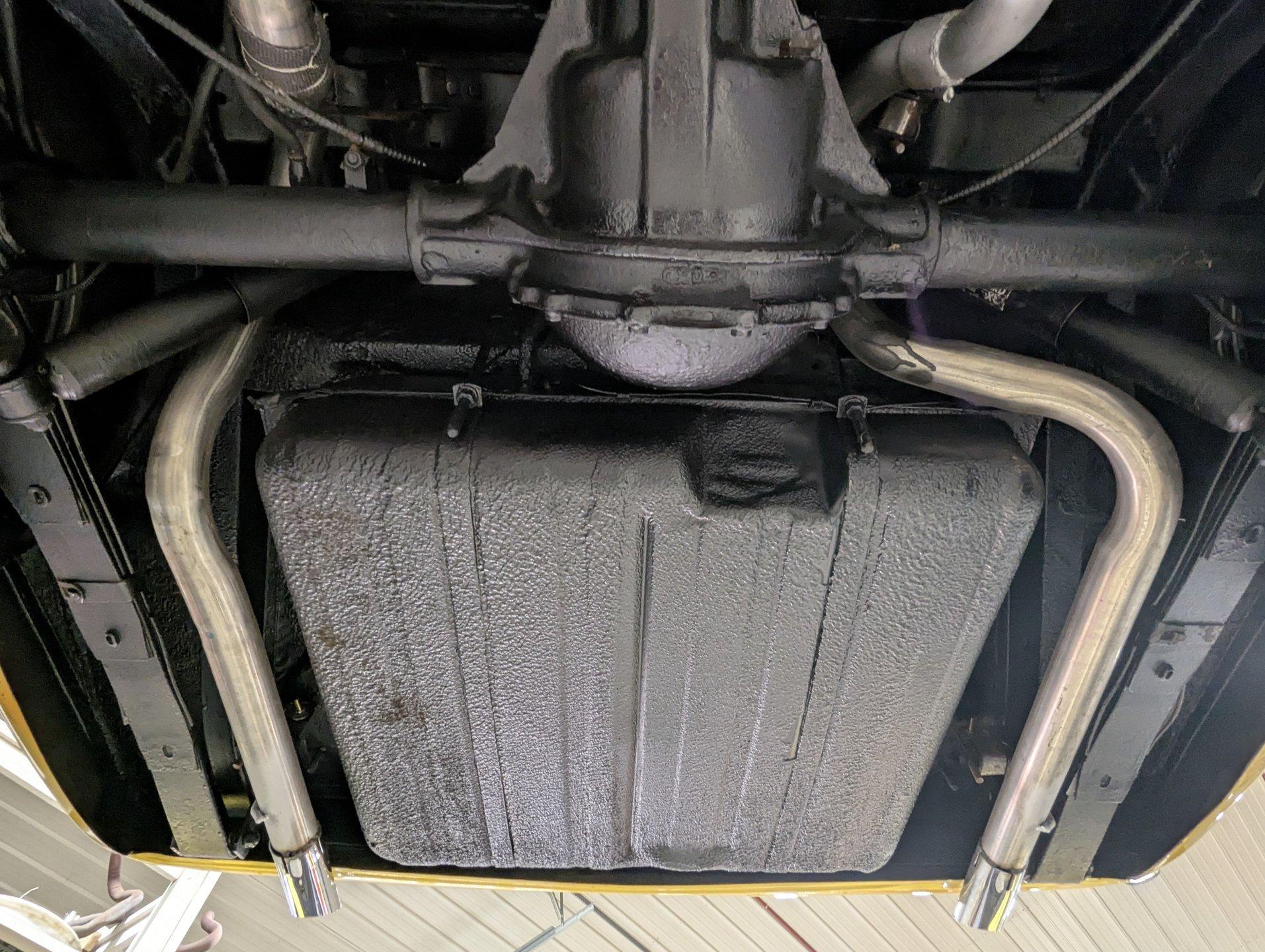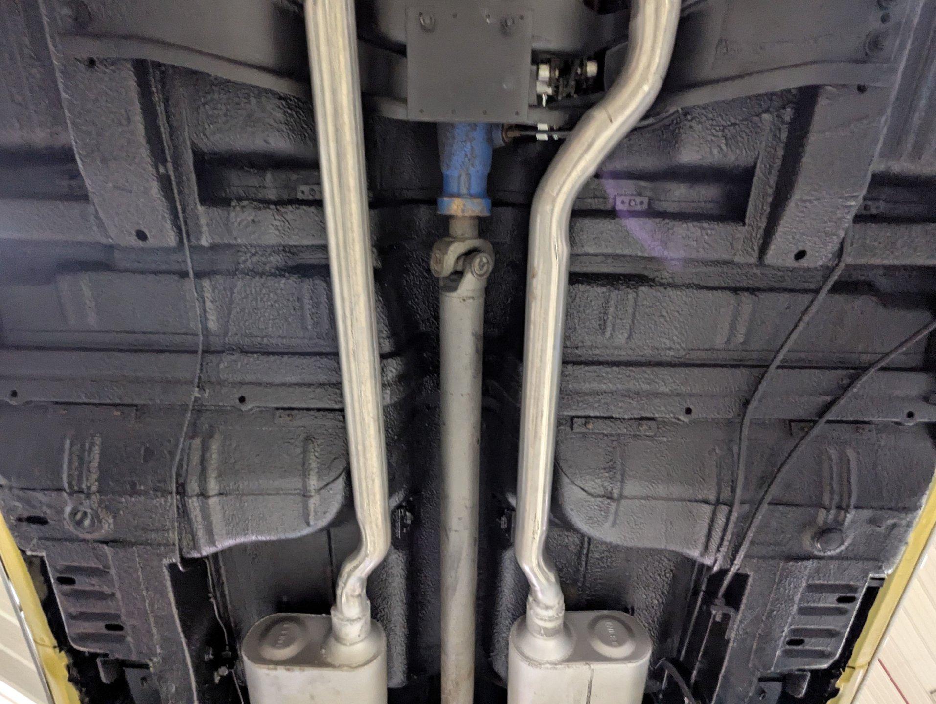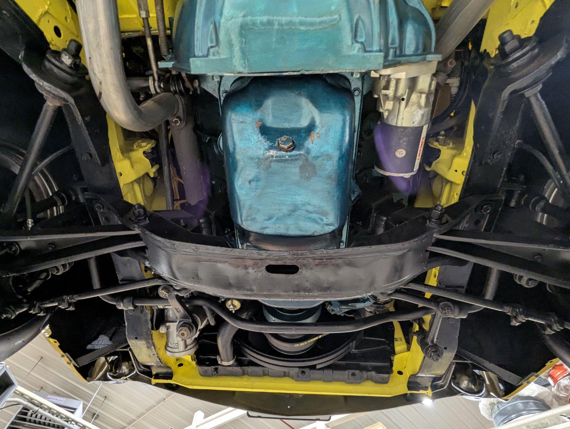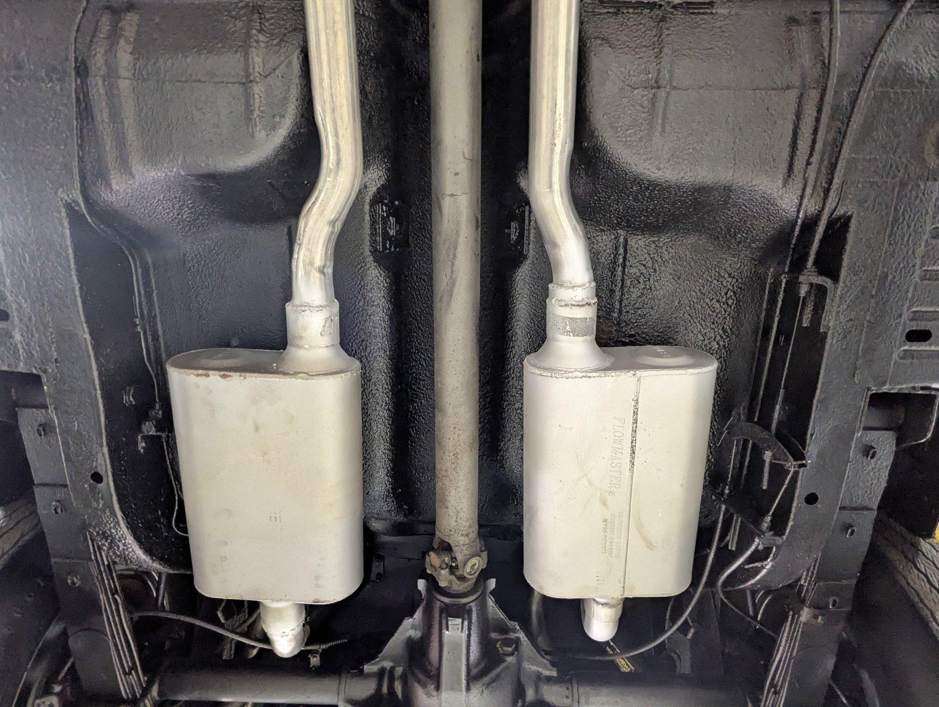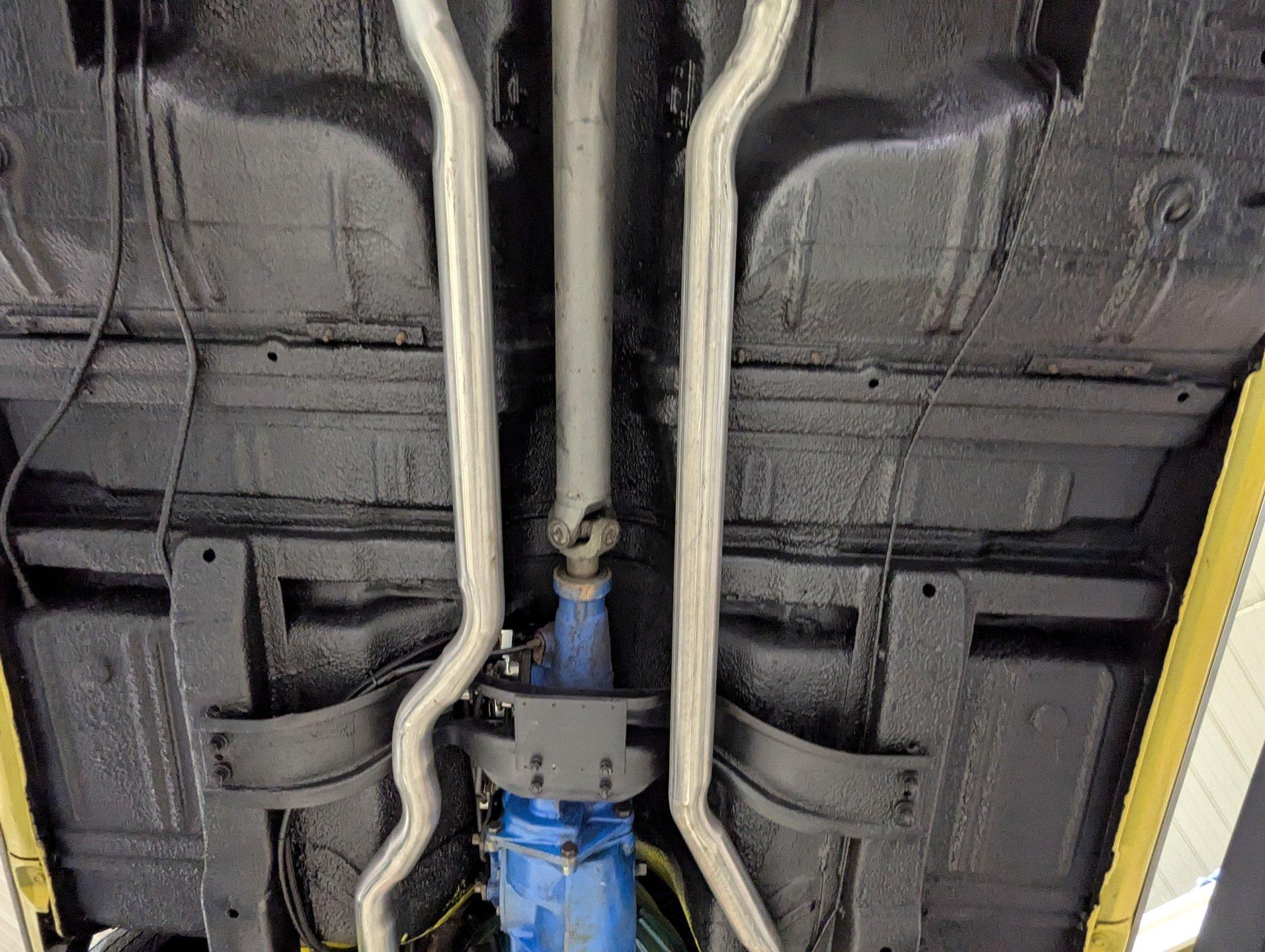 UNDERSIDE: It appears to be very solid and well sorted. Our shop has inspected and serviced the car, including underneath. It's equipped with optional front disc brakes, and the emergency brake is properly hooked up and functioning. The steering and suspension have been gone through to ensure it drives tight and confidently. A new dual exhaust system with Flowmaster mufflers gives it a strong, healthy sound. Looking up at the engine, it's clean and detailed, featuring a high-torque starter for reliable cranking. It's paired to a correct 1968 T10 4-speed trans, and out back it retains its 3.15 posi rear end. The floors and frame rails appear rock solid. They've been treated with fresh undercoating, giving the underside a clean, uniform black appearance while adding protection.