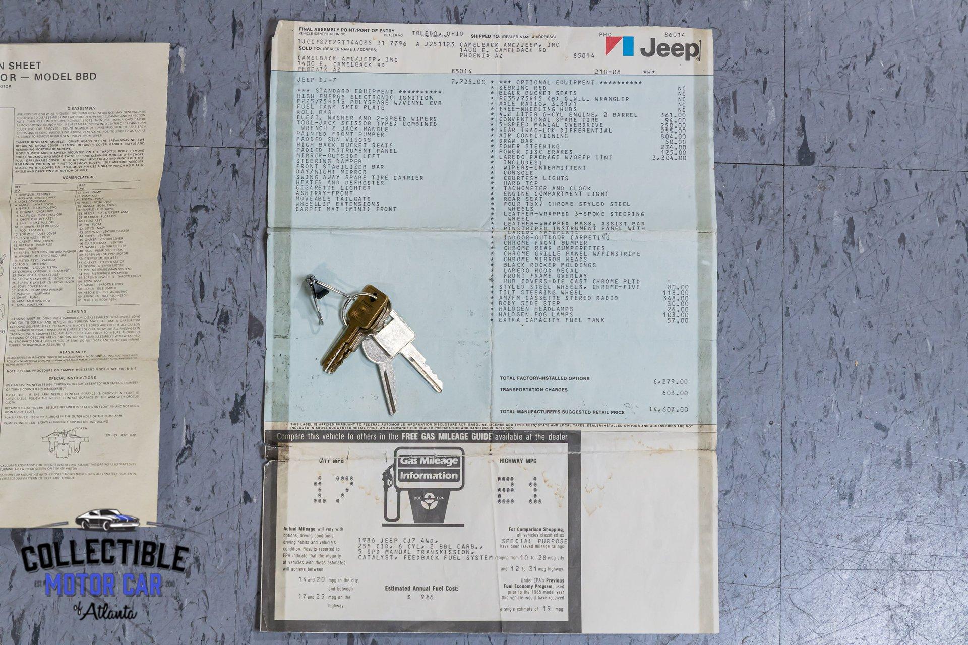 Powered by the legendary 4.2-liter inline-6 and backed by a 5-speed manual transmission, this CJ7 delivers the kind of straightforward, mechanical driving experience that modern SUVs simply cannot replicate. With 146,952 miles, original paint, cold air conditioning, and a long list of extras including the hard top, black bikini top, black rear tonneau cover, black wind jammer, Bluetooth radio box, and even the original window sticker, this is a very appealing example of one of Jeep's most beloved open-air 4x4s. This CJ also has the desireable Dana 44 Rear End which purist's look for. American Motors put Dana 44's towards the end 1985-mid 1986 of the CJ production before Chrysler changed the Body style to the Wrangler in 1987.