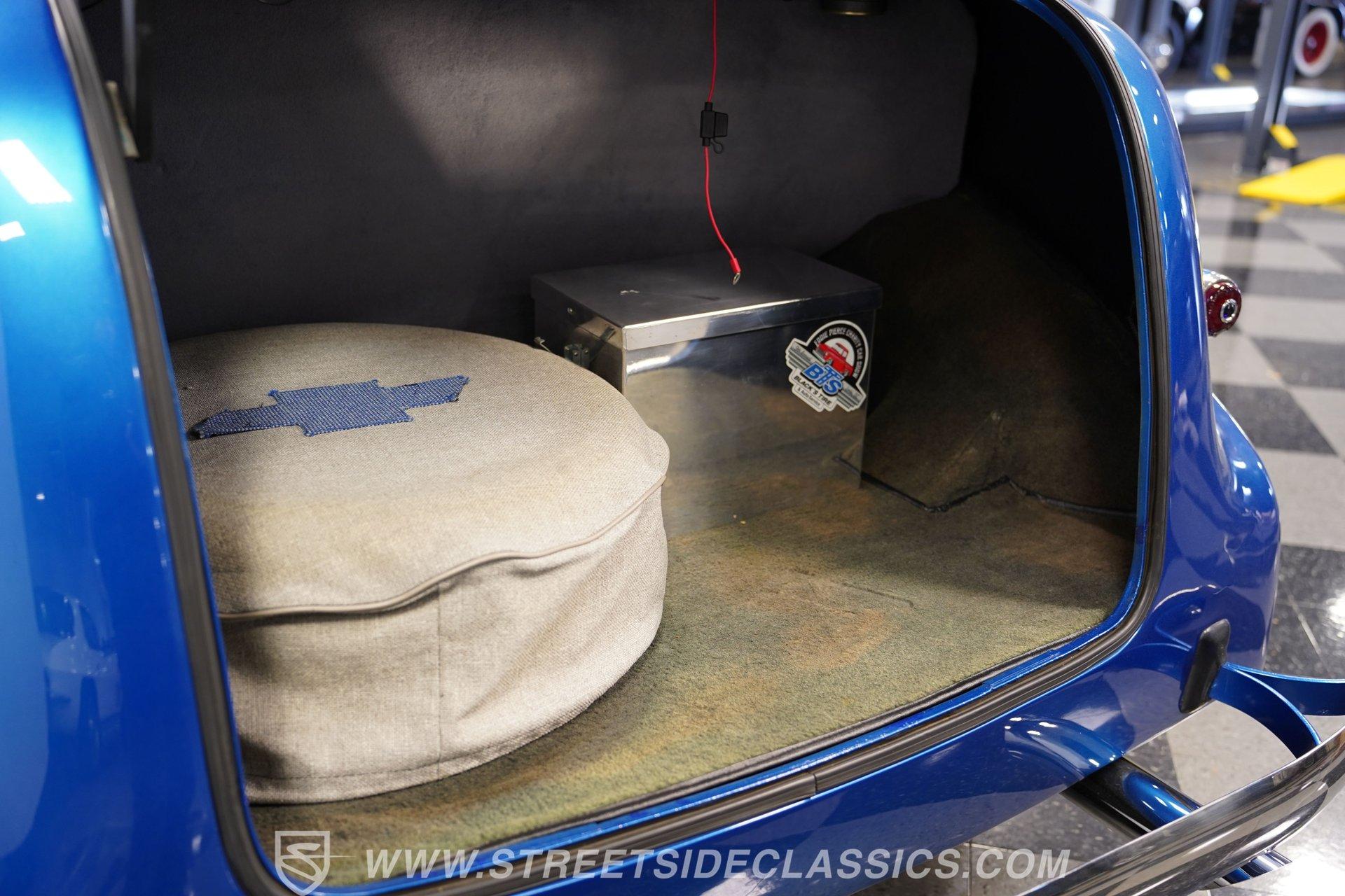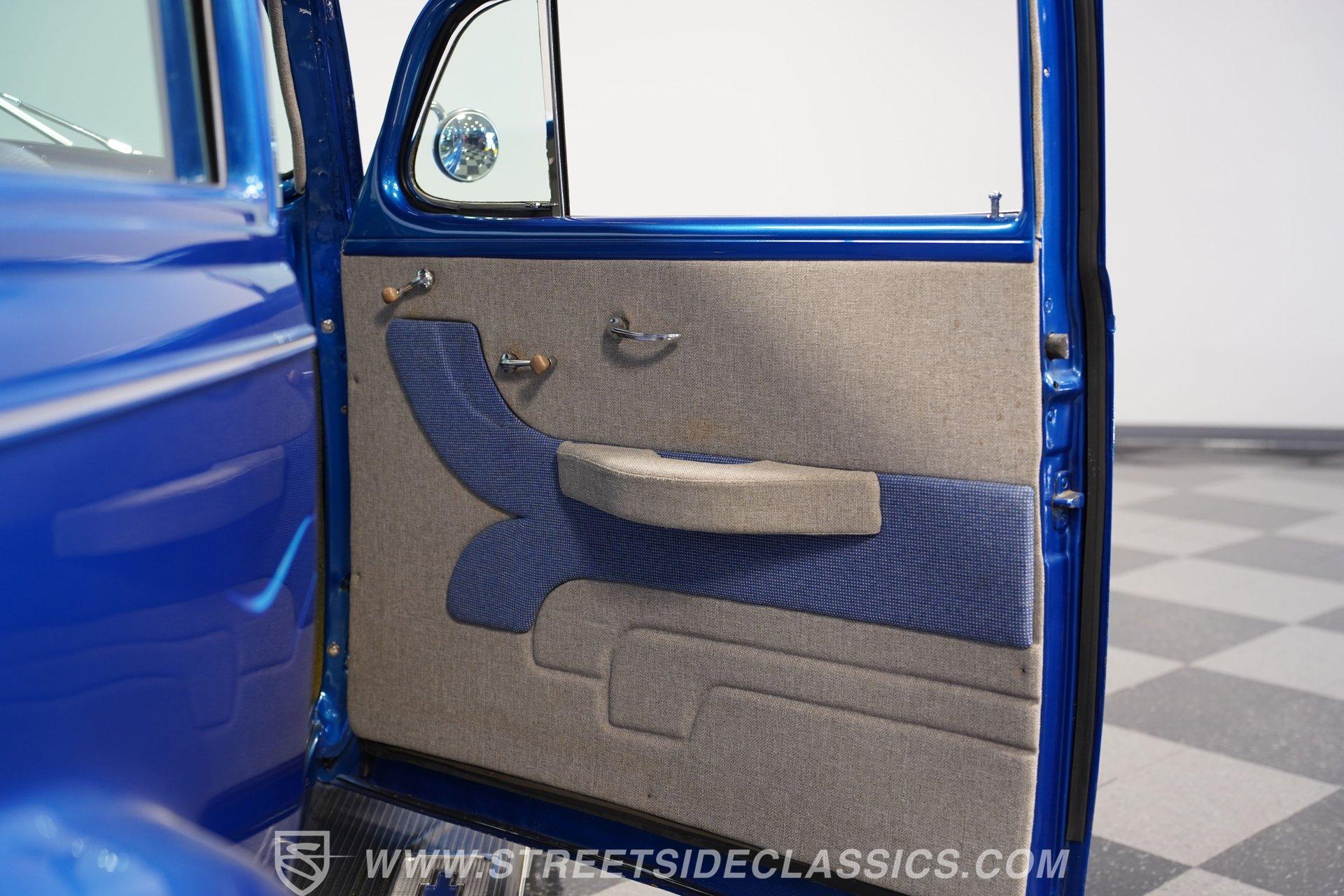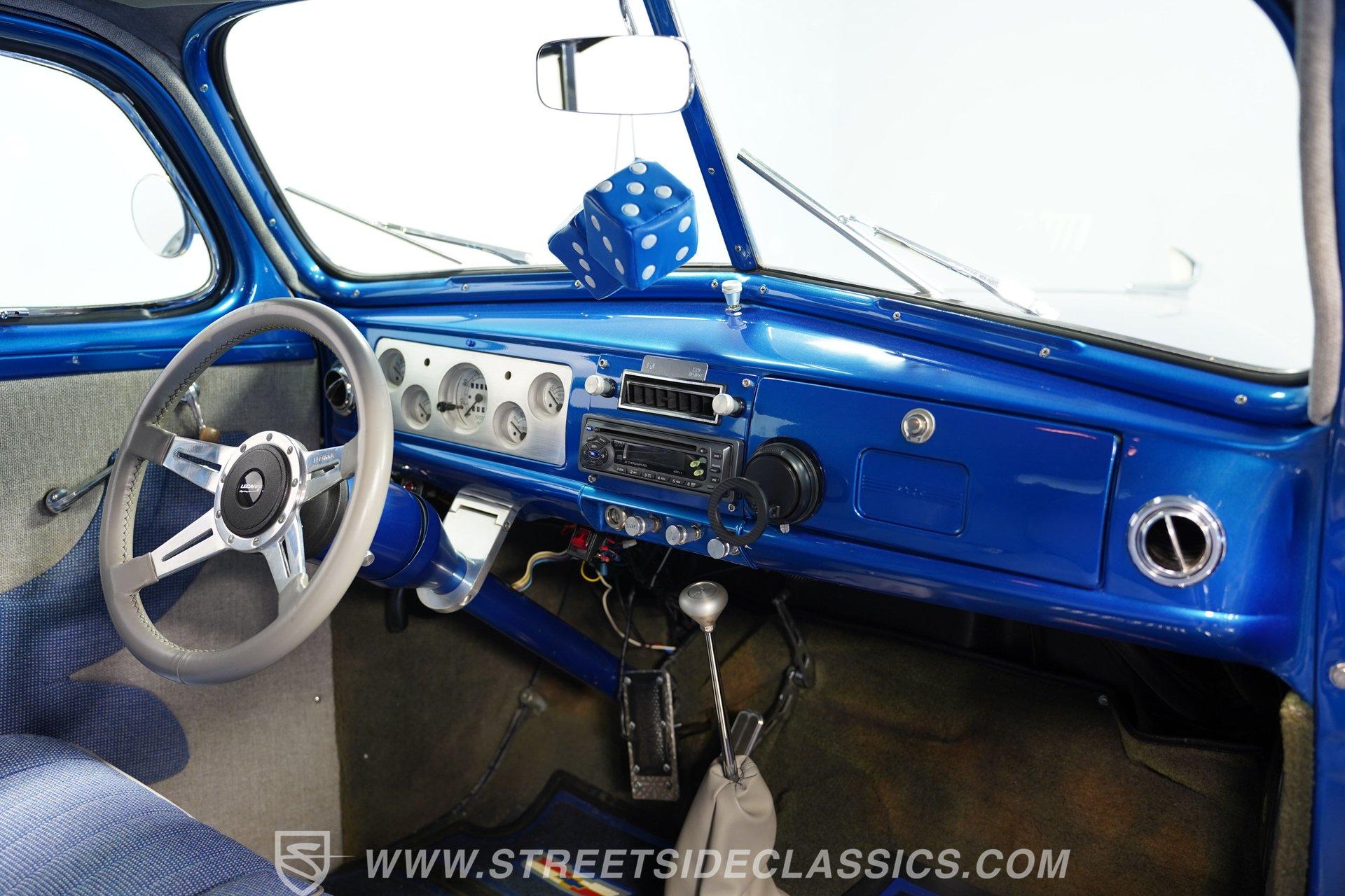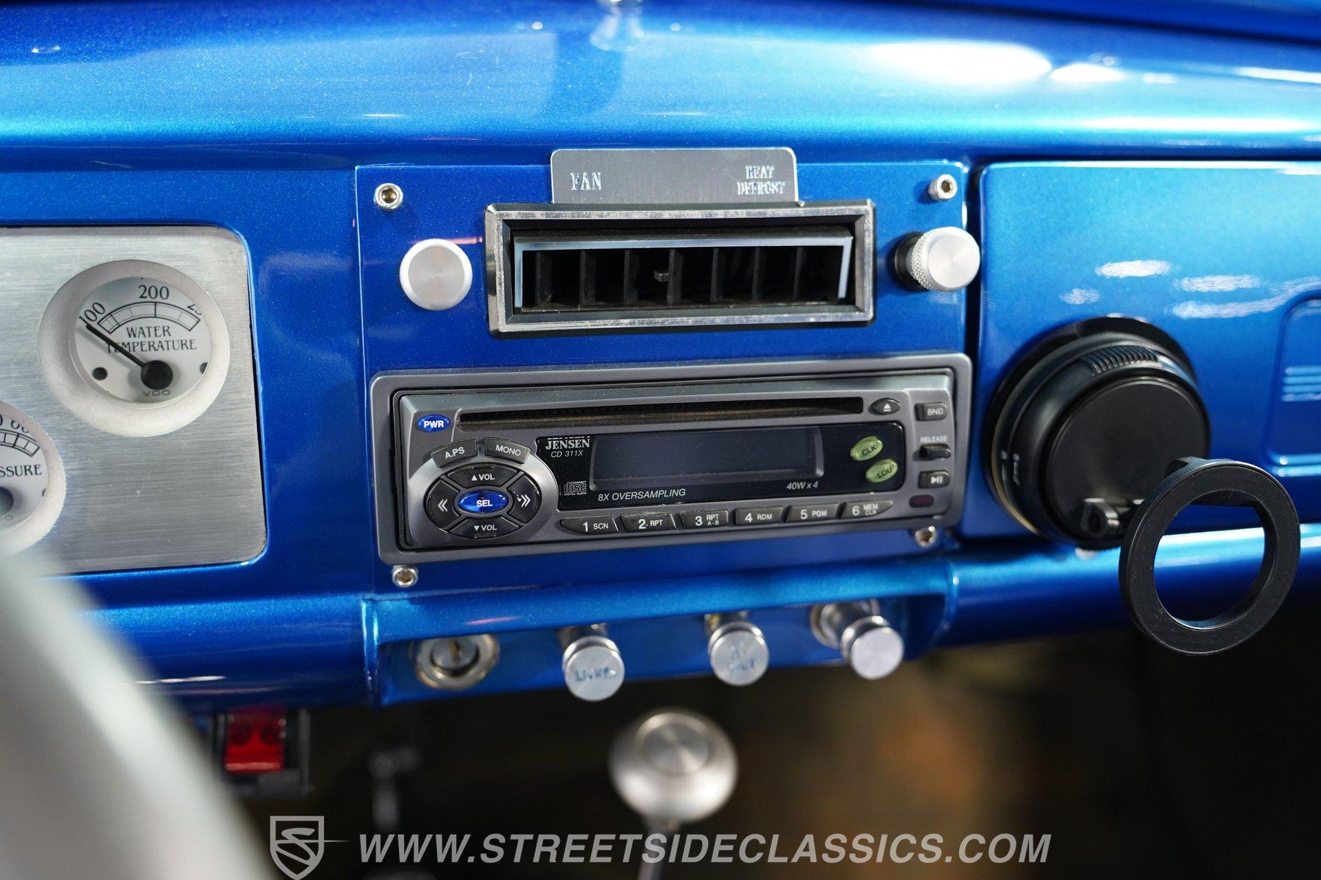 The blue cloth interior is in good shape, and you can see that it was configured with comfort in mind. Both rows of bench seating, sourced from a decidedly more modern car, are well-padded and because of its generous proportions, there's plenty of shoulder and leg room inside these doors. The carpeting below is in matching condition and is punctuated with a set of Chevrolet floor mats that add a nice finishing touch. Up front, the color-matched dash area harbors a set of VDO gauges in the instrument cluster with appropriately antique-style graphics, surrounded by an aluminum bezel that adds some contrast to its surroundings. An aftermarket Jensen AM/FM/CD stereo has been added to provide the soundtrack for your journeys.