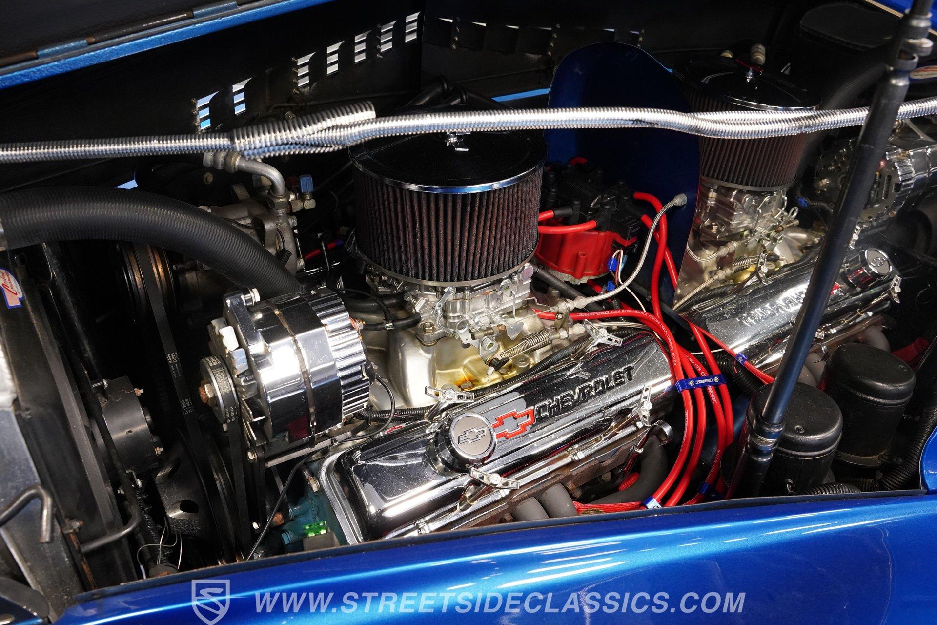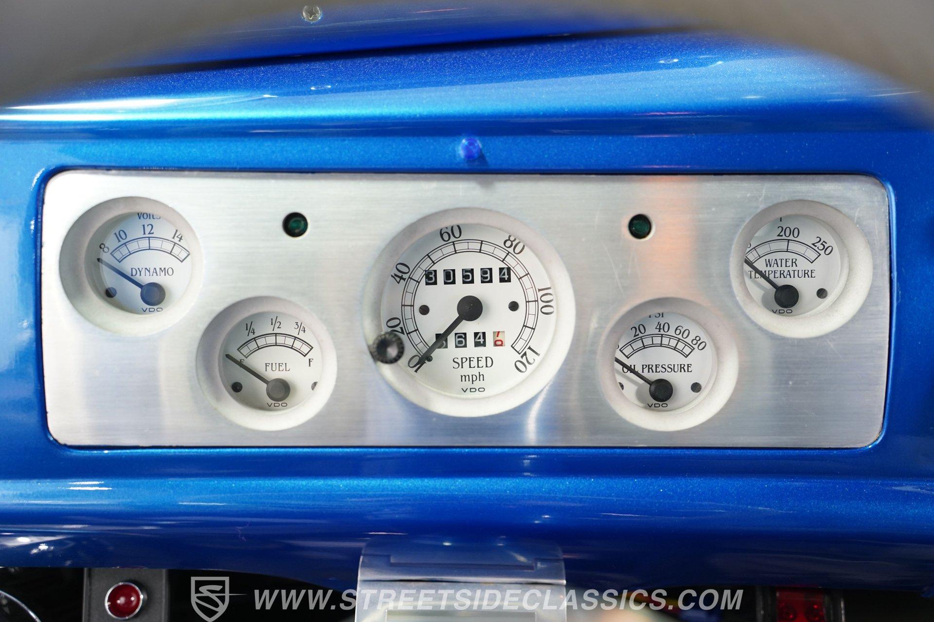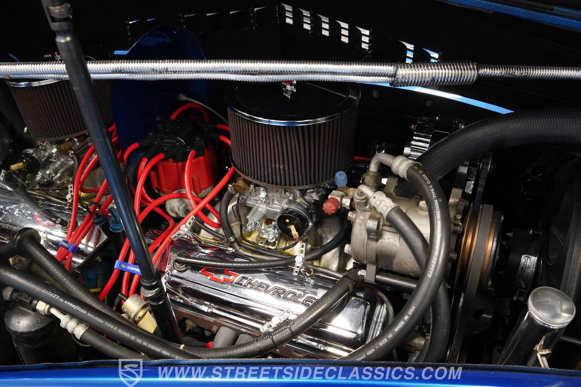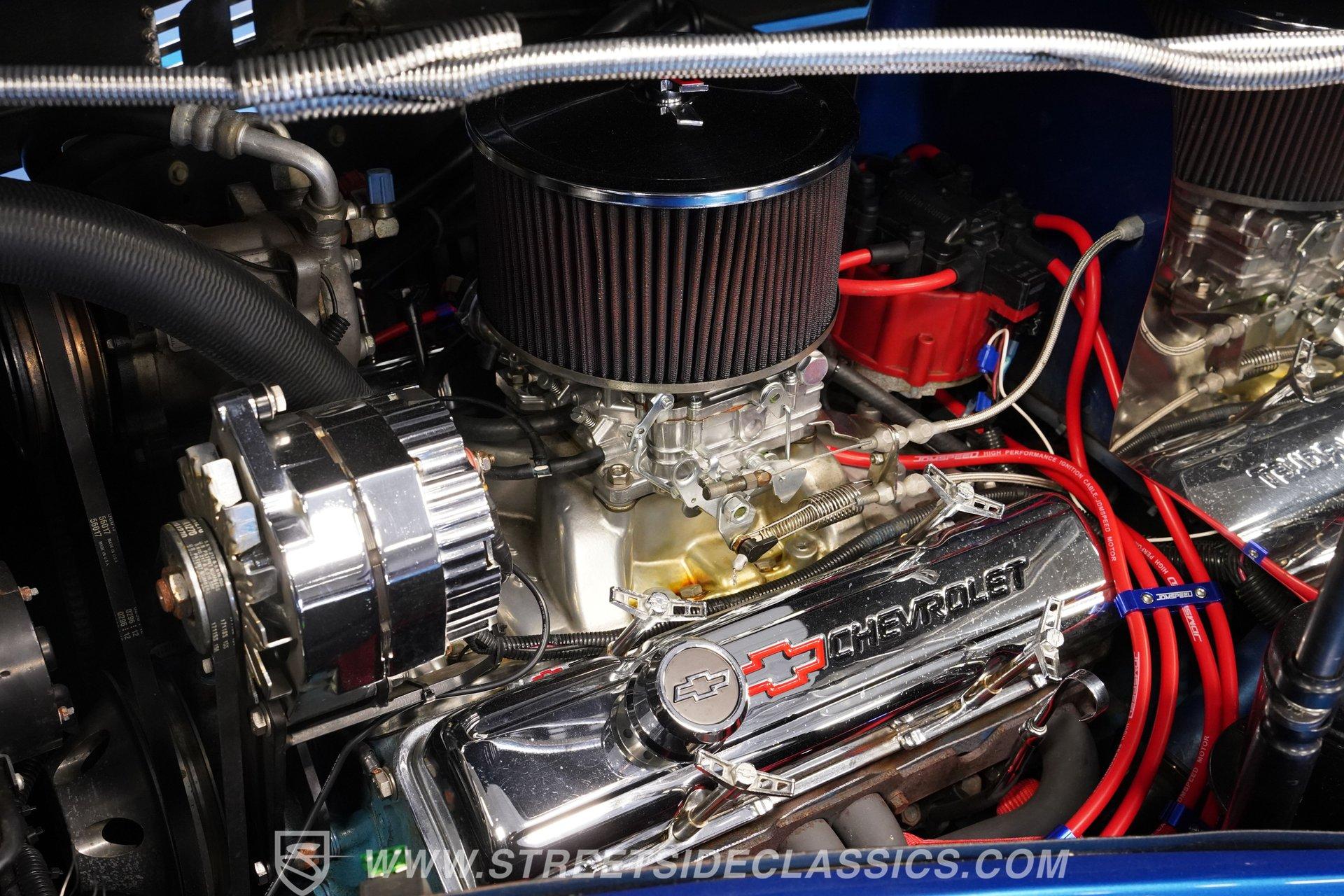 The blue cloth interior is in good shape, and you can see that it was configured with comfort in mind. Both rows of bench seating, sourced from a decidedly more modern car, are well-padded and because of its generous proportions, there's plenty of shoulder and leg room inside these doors. The carpeting below is in matching condition and is punctuated with a set of Chevrolet floor mats that add a nice finishing touch. Up front, the color-matched dash area harbors a set of VDO gauges in the instrument cluster with appropriately antique-style graphics, surrounded by an aluminum bezel that adds some contrast to its surroundings. An aftermarket Jensen AM/FM/CD stereo has been added to provide the soundtrack for your journeys.