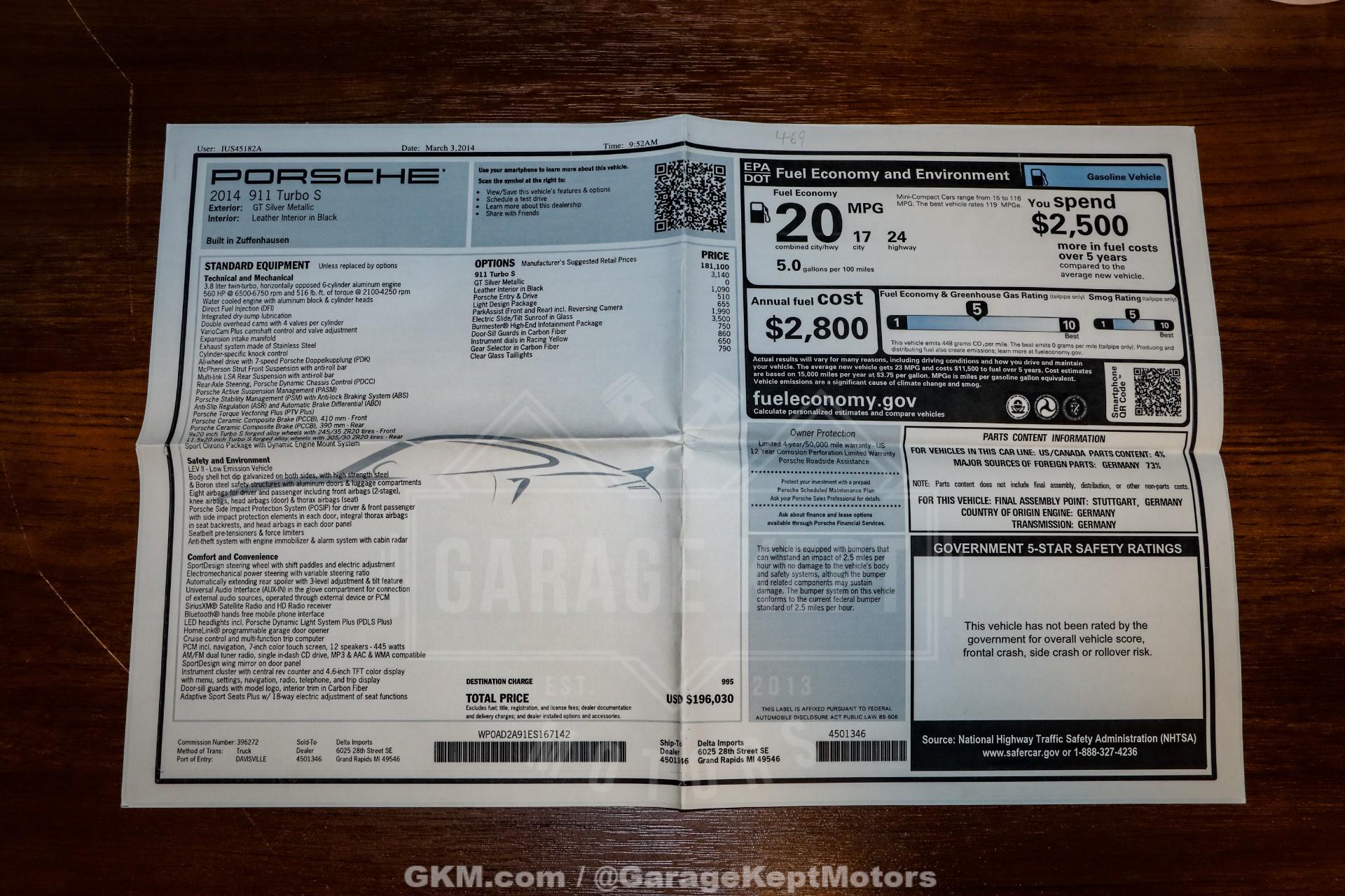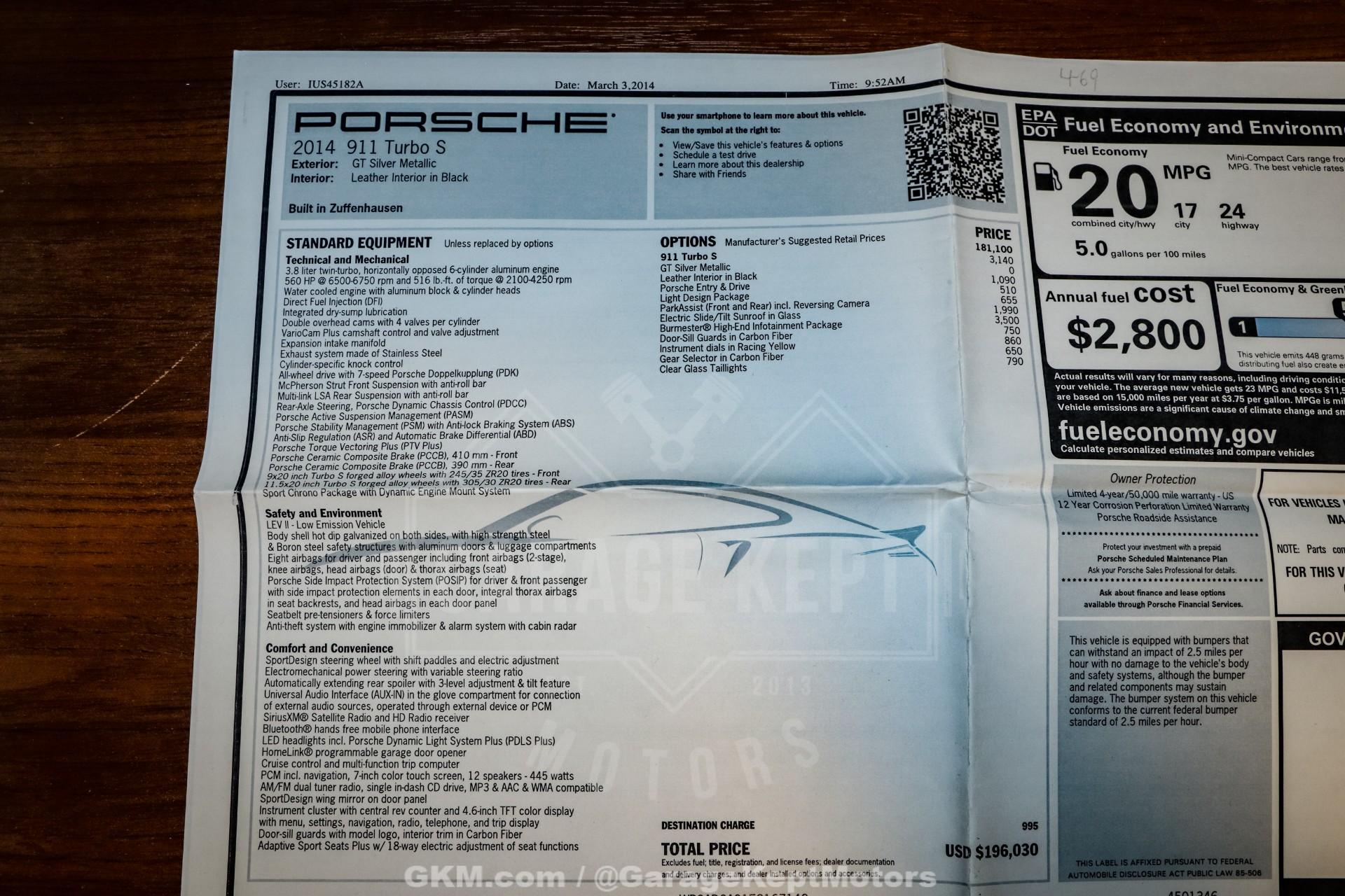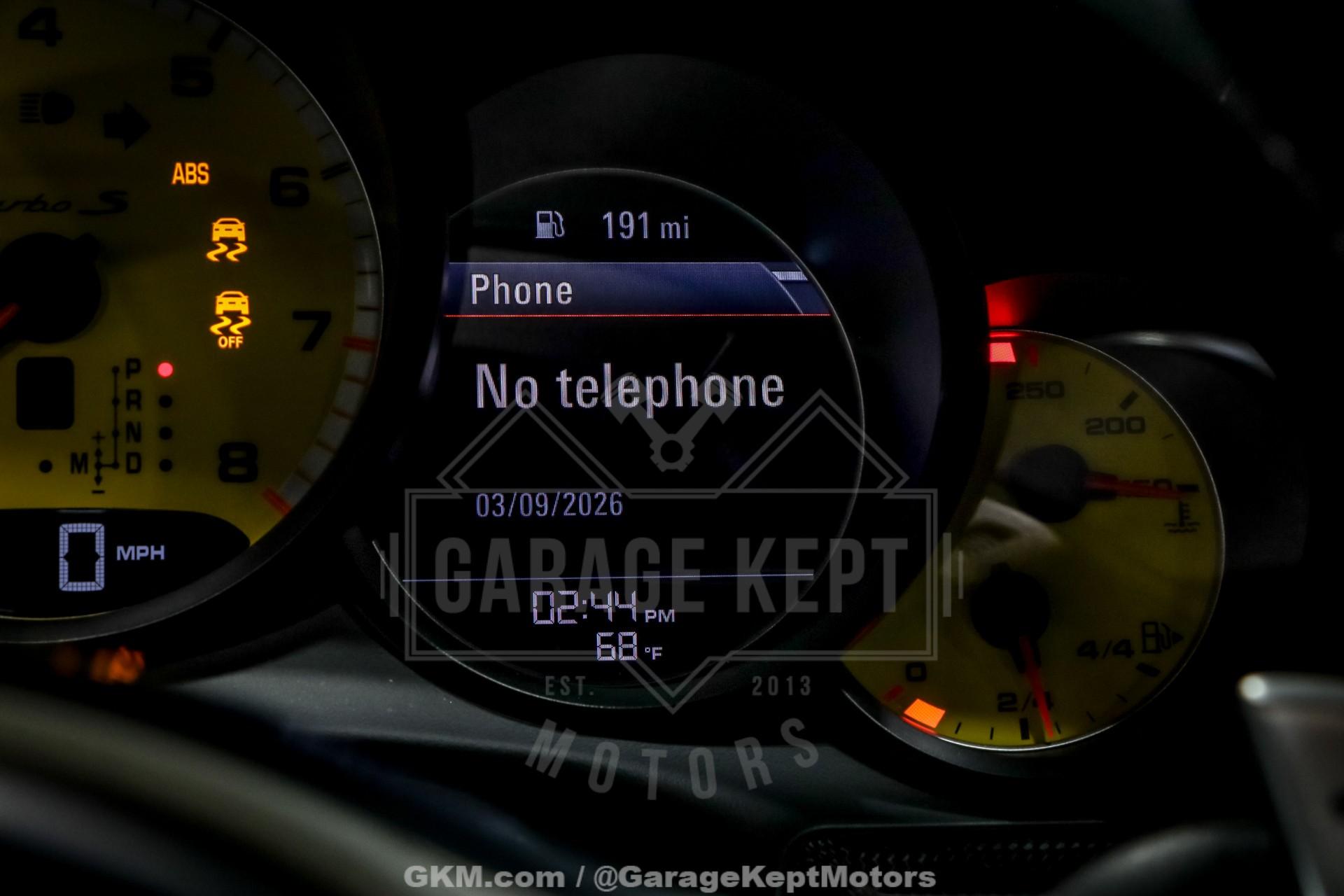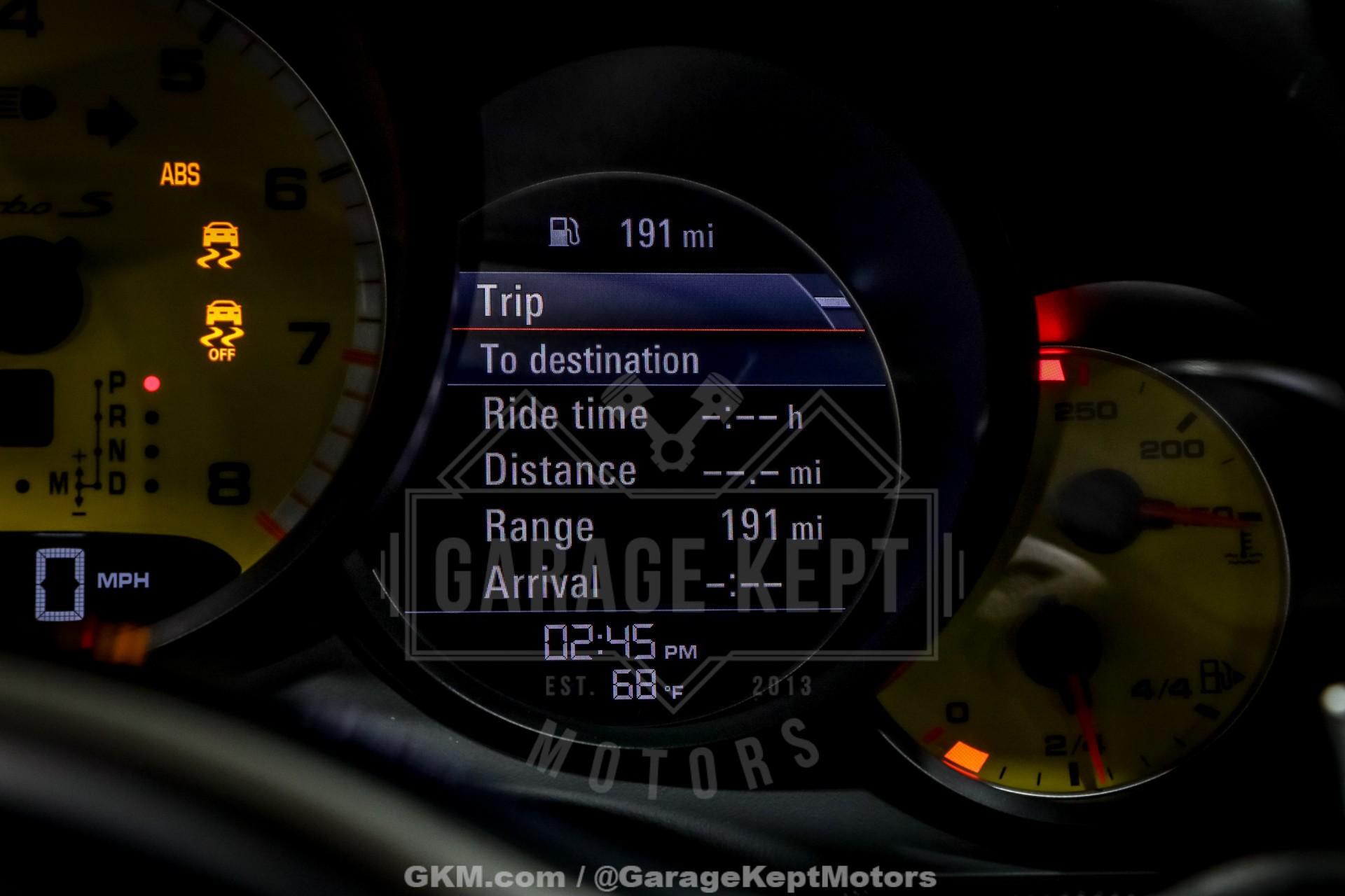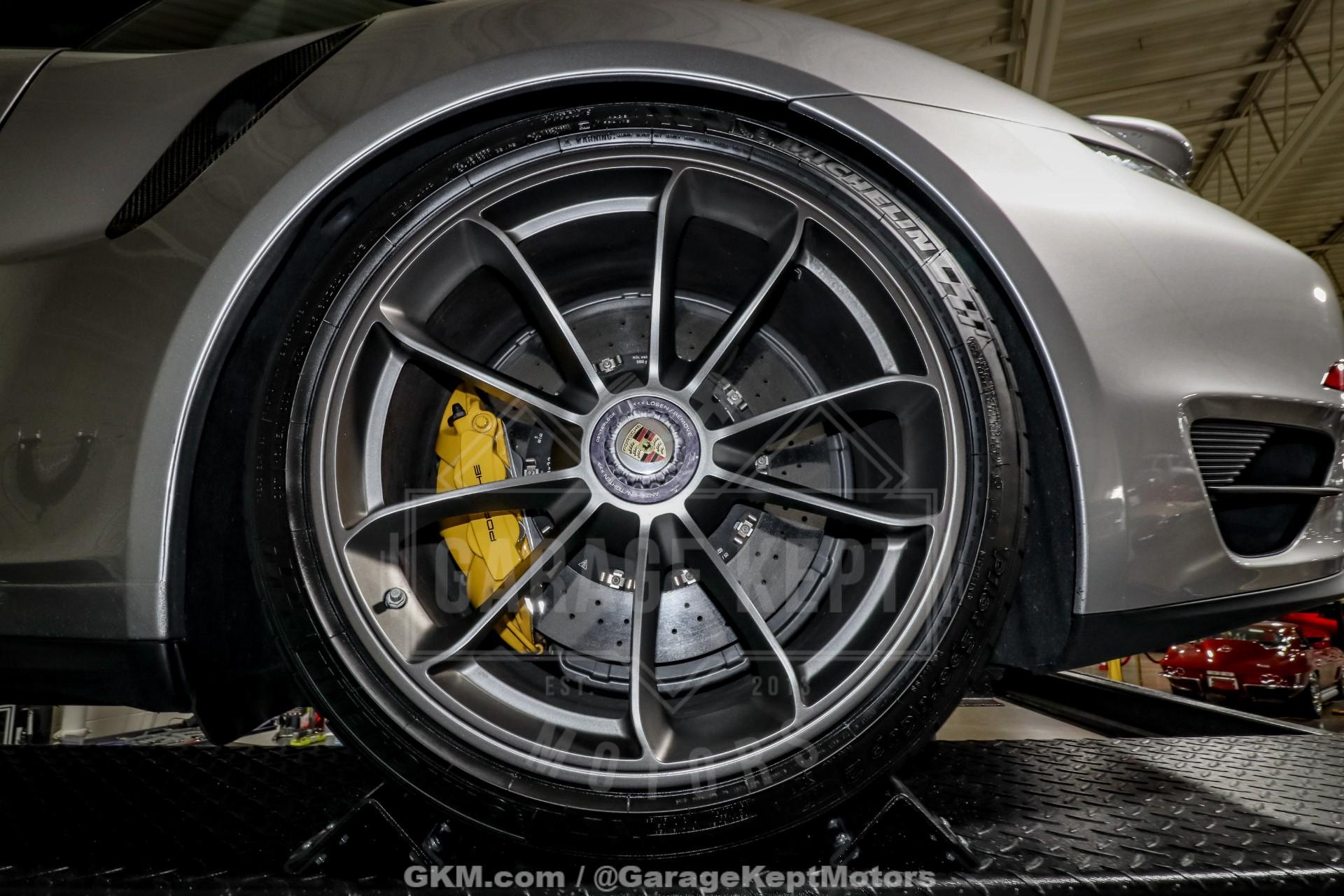 2014 Porsche 911 Turbo S - One Owner- 3.8L Twin Turbo H6- 7 Speed PDK Automatic Transmission- 25,898 Miles- GT Silver Metallic - Black Leather Interior- GT3 Center Lock Wheels- Titanium ExhaustThe 2014 Porsche 911 Turbo S represents the pinnacle of Porsche engineering, combining everyday usability with supercar-level performance. As part of the 991 generation, the Turbo S delivers breathtaking acceleration, advanced all-wheel-drive capability, and precision handling that has made the 911 one of the most respected sports cars in the world.Powered by a 3.8-liter twin-turbocharged flat-six engine and paired with Porsche's lightning-fast 7-speed PDK transmission, this Turbo S offers explosive performance with seamless gear changes and exceptional control. Known for its ability to launch from 060 mph in under three seconds, the Turbo S blends raw power with remarkable stability and confidence in all driving conditions.Finished in GT Silver Metallic over a Black leather interior, this one-owner example presents a timeless and sophisticated color combination. The addition of GT3 center lock wheels enhances both the visual appeal and performance pedigree, while the titanium exhaust system delivers a sharper, more aggressive tone that complements the car's dynamic capabilities.With just 25,898 miles, this Turbo S stands as a well-preserved example of one of Porsche's most advanced and capable road cars. Whether you're seeking a high-performance daily driver or a collector-quality modern supercar, this 911 Turbo S offers an unmatched combination of speed, refinement, and iconic design.