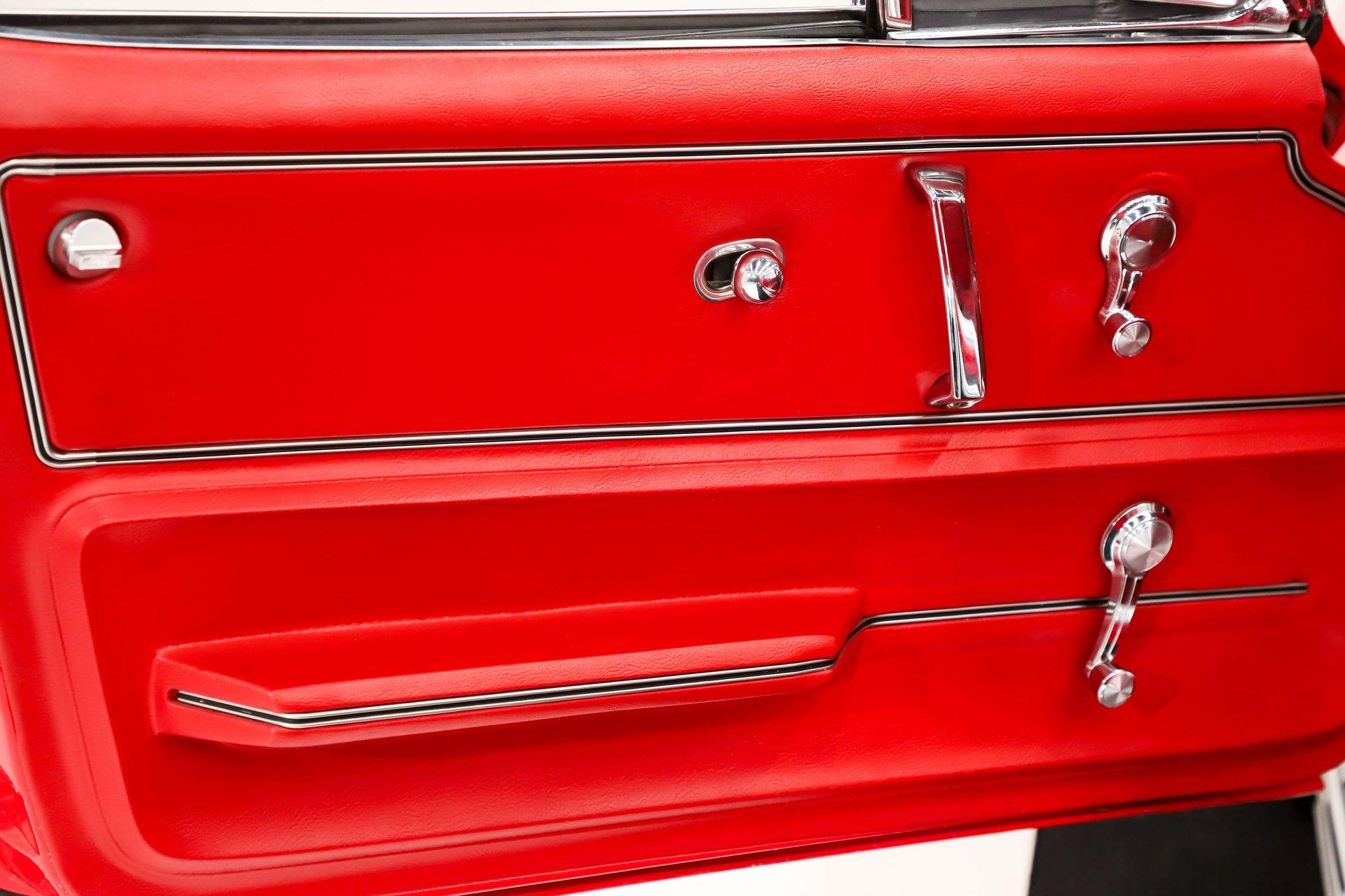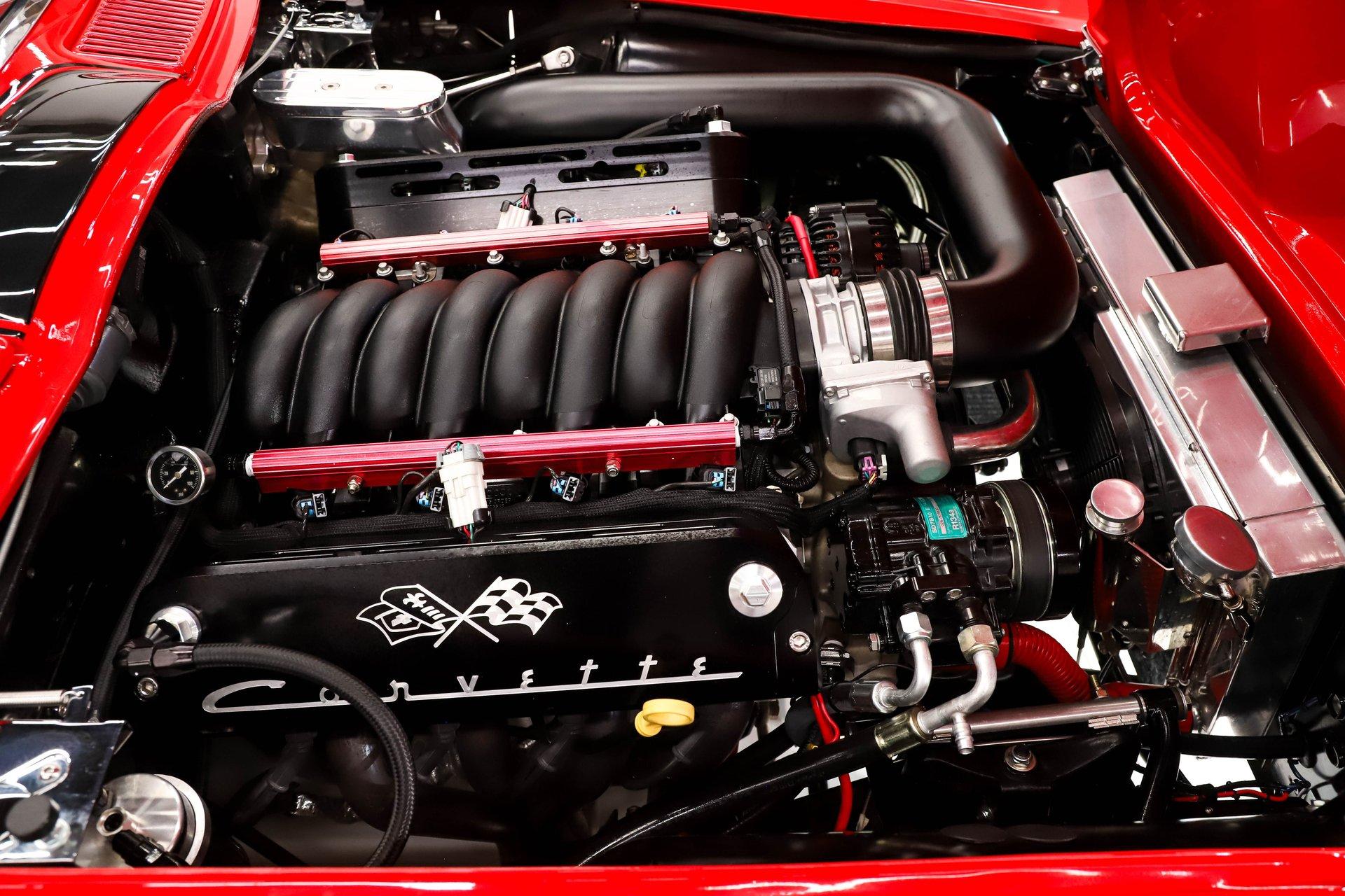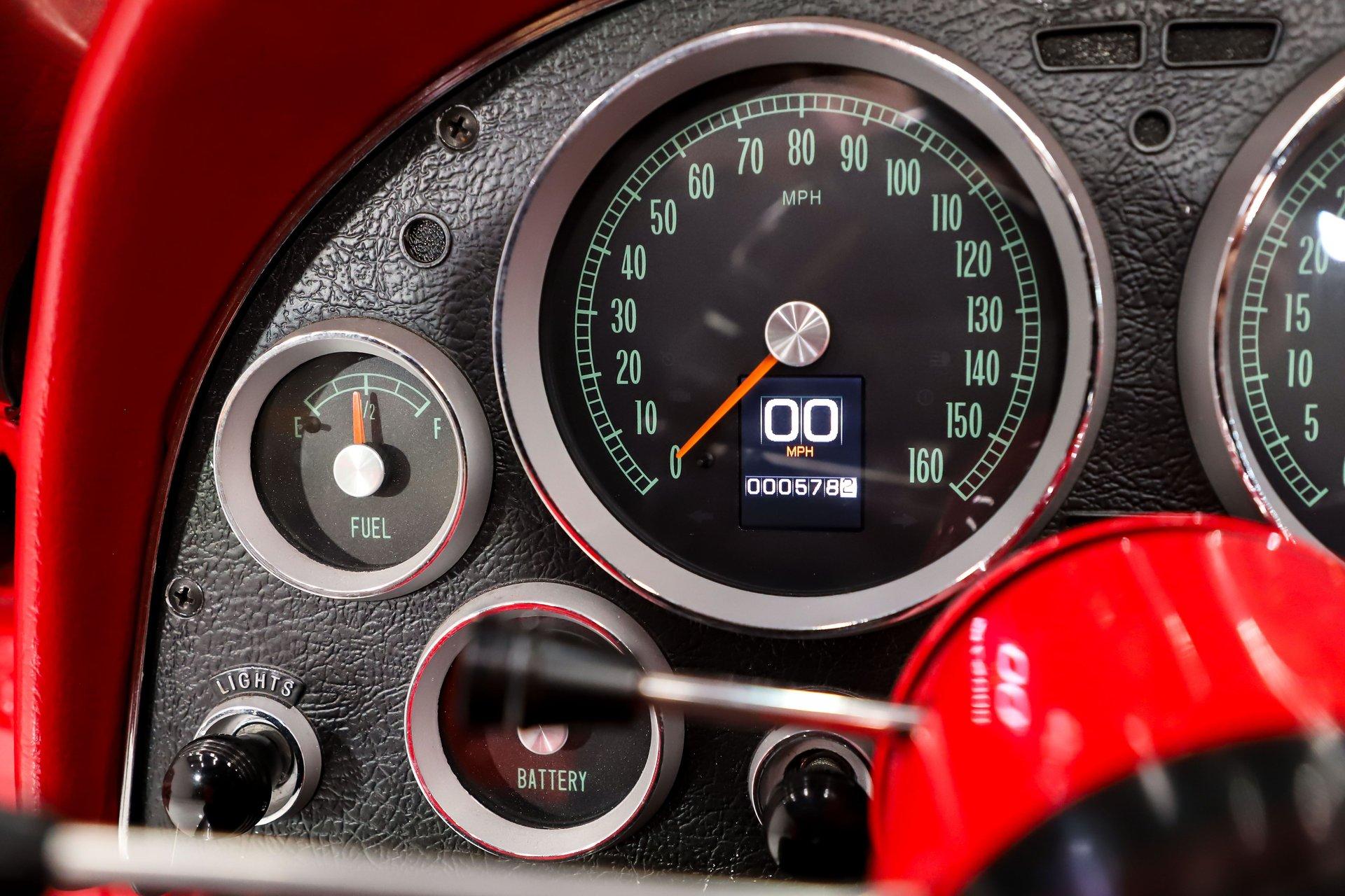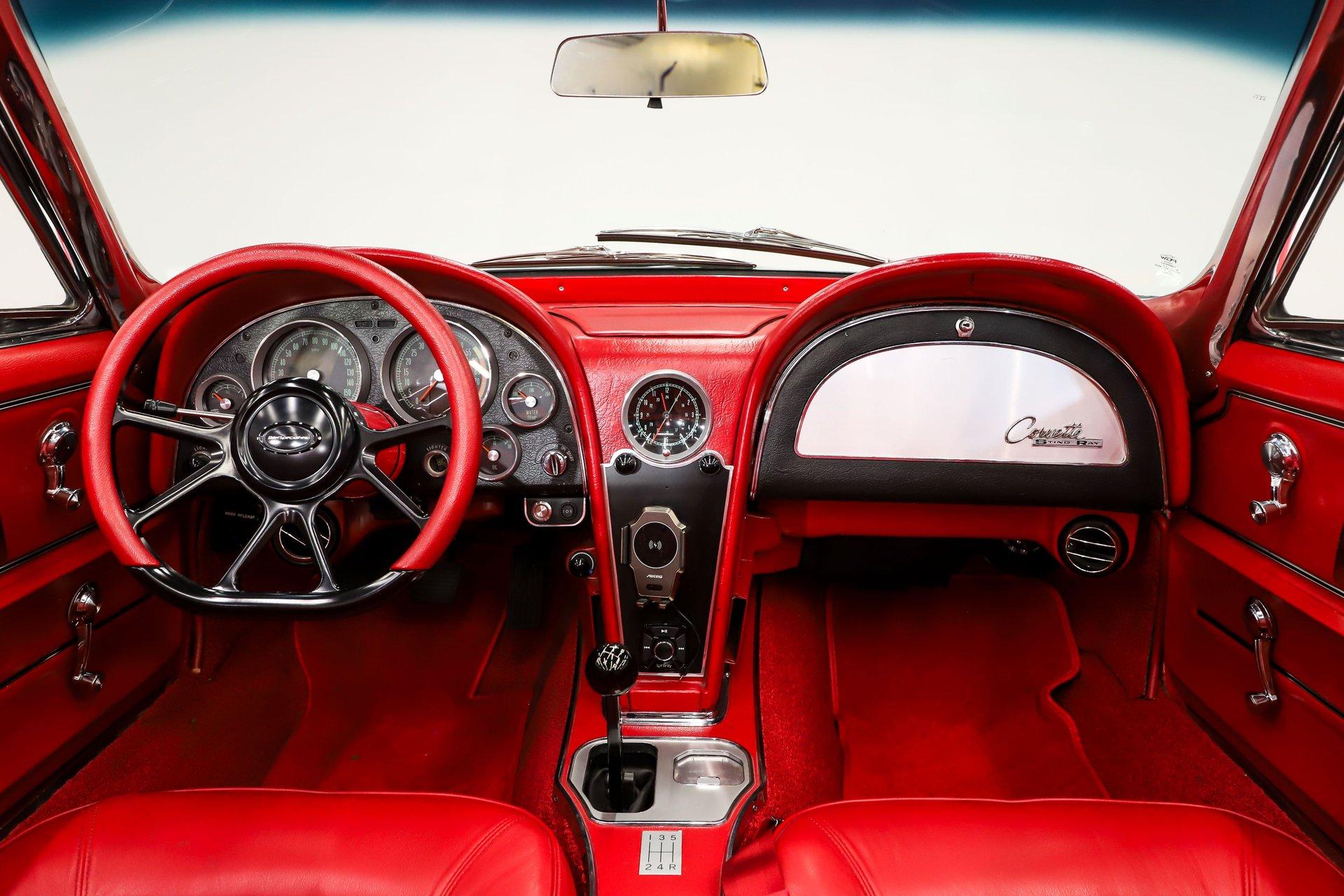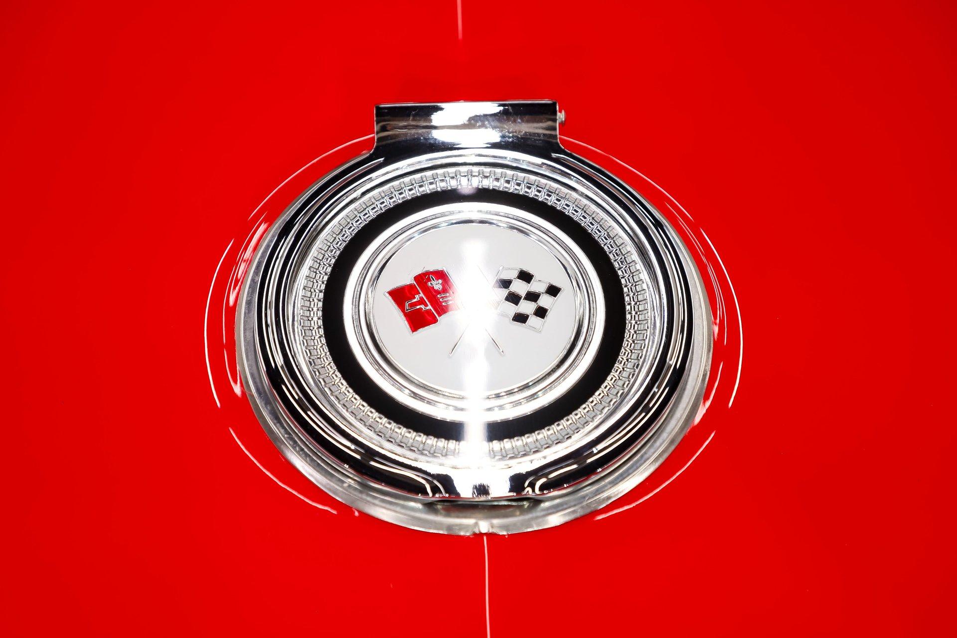 INTERIOR: You can't have enough red in a Corvette, and this interior absolutely delivers! It looks like new-if not better in some areas. It was lined with Dynamat sound deadener then fresh red carpet was installed front to back and some premium mats. The seats have been re-cushioned and upholstered in glove-soft leather, and the entire dash area has been beautifully restored.It's upgraded with RetroGauges that look stock at a glance but feature modern analog/digital functionality, along with a quartz clock. There's a Bluetooth stereo system, and the console is in excellent shape with a billet 5-speed shifter rising from it. It also features a tilt column and a Billet Specialties steering wheel. The door panels have been replaced, and it has new red seat belts. All the finishing details are in excellent condition, making this interior truly stand out.