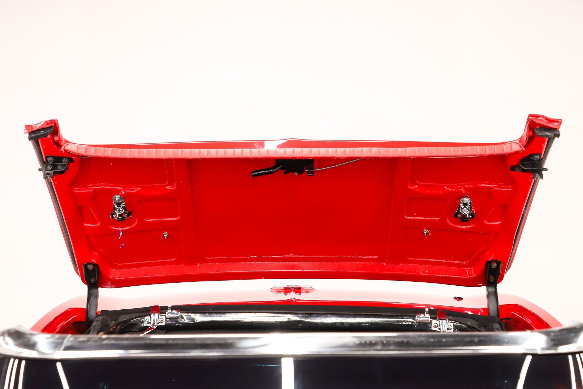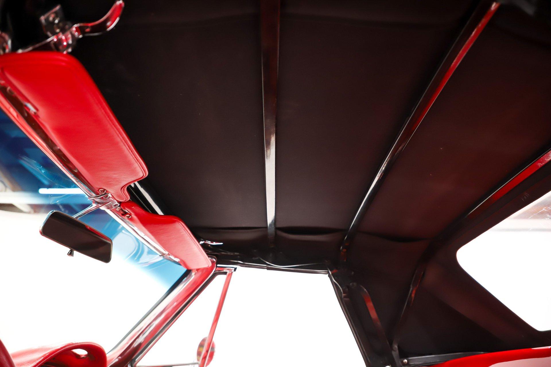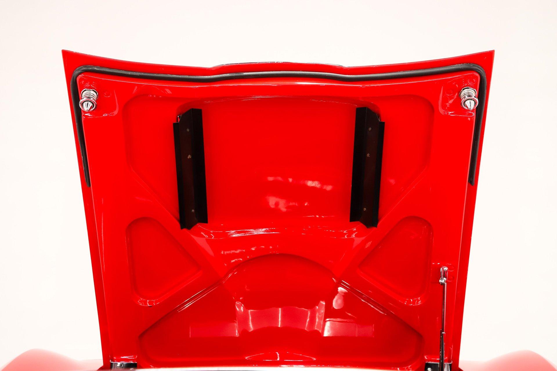 EXTERIOR: This paint is about as awesome as it gets! The body is pristine with precise gaps and excellent fitment, the headlights open and close properly. The red finish is laid out like glass and has been ceramic coated. It's topped off with a black metallic stinger stripe on the big block hood, giving it the perfect aggressive contrast. The trim, stainless, and chrome have been replaced, and it features bowtie mirrors along with a rich black cloth convertible top. The factory side exhaust looks incredible and sounds even better. It's sitting on BFGoodrich redline radial tires wrapped around reproduction knock-off wheels.