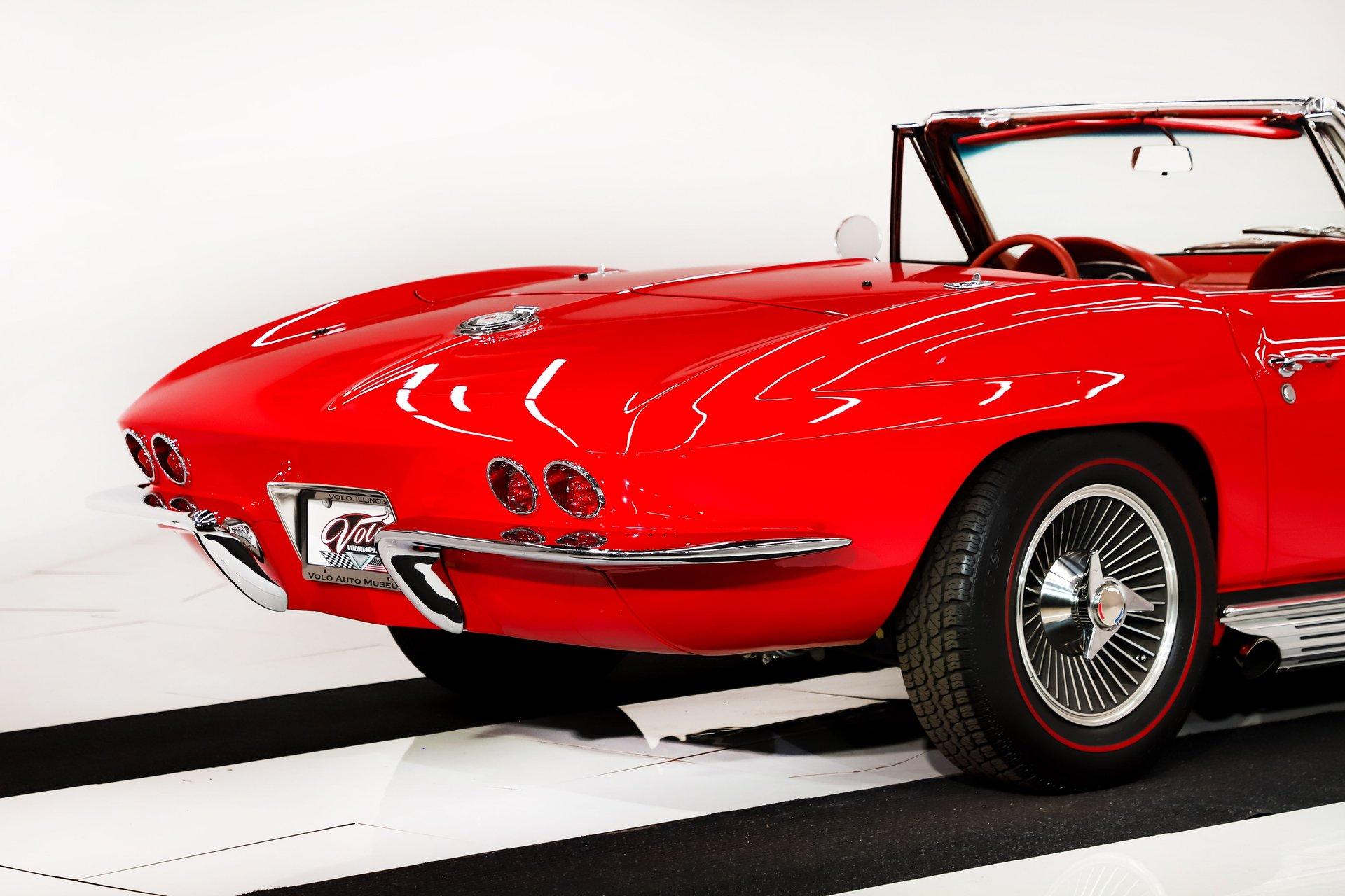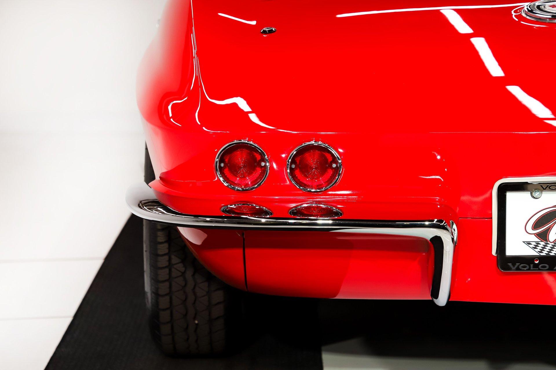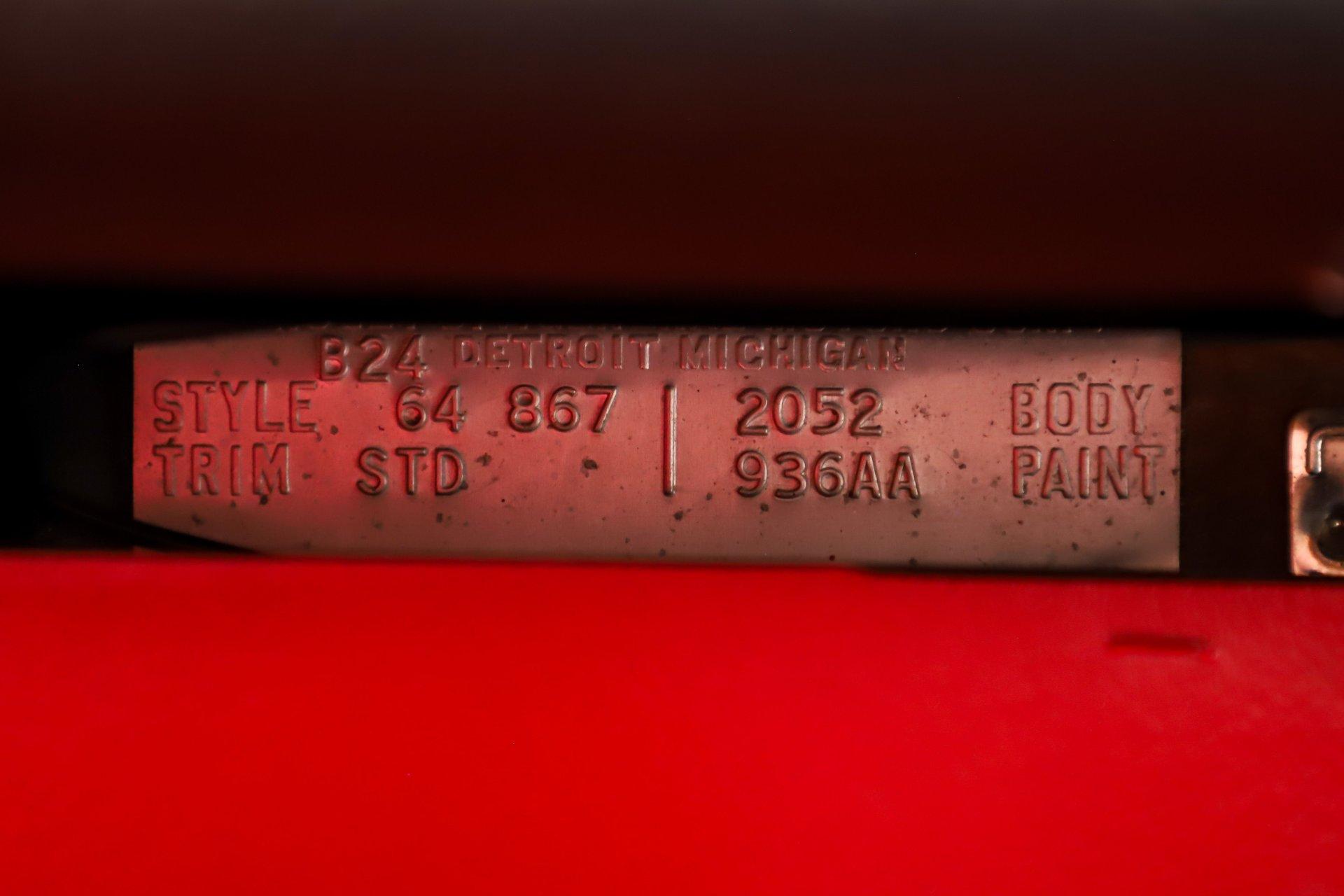 EXTERIOR: This paint is about as awesome as it gets! The body is pristine with precise gaps and excellent fitment, the headlights open and close properly. The red finish is laid out like glass and has been ceramic coated. It's topped off with a black metallic stinger stripe on the big block hood, giving it the perfect aggressive contrast. The trim, stainless, and chrome have been replaced, and it features bowtie mirrors along with a rich black cloth convertible top. The factory side exhaust looks incredible and sounds even better. It's sitting on BFGoodrich redline radial tires wrapped around reproduction knock-off wheels.