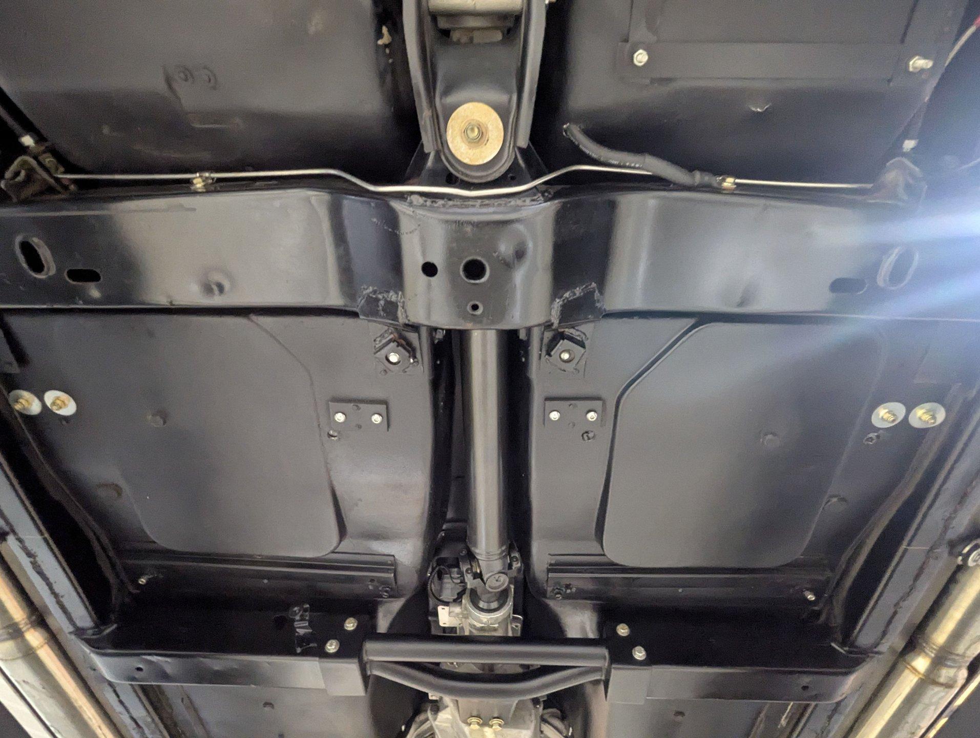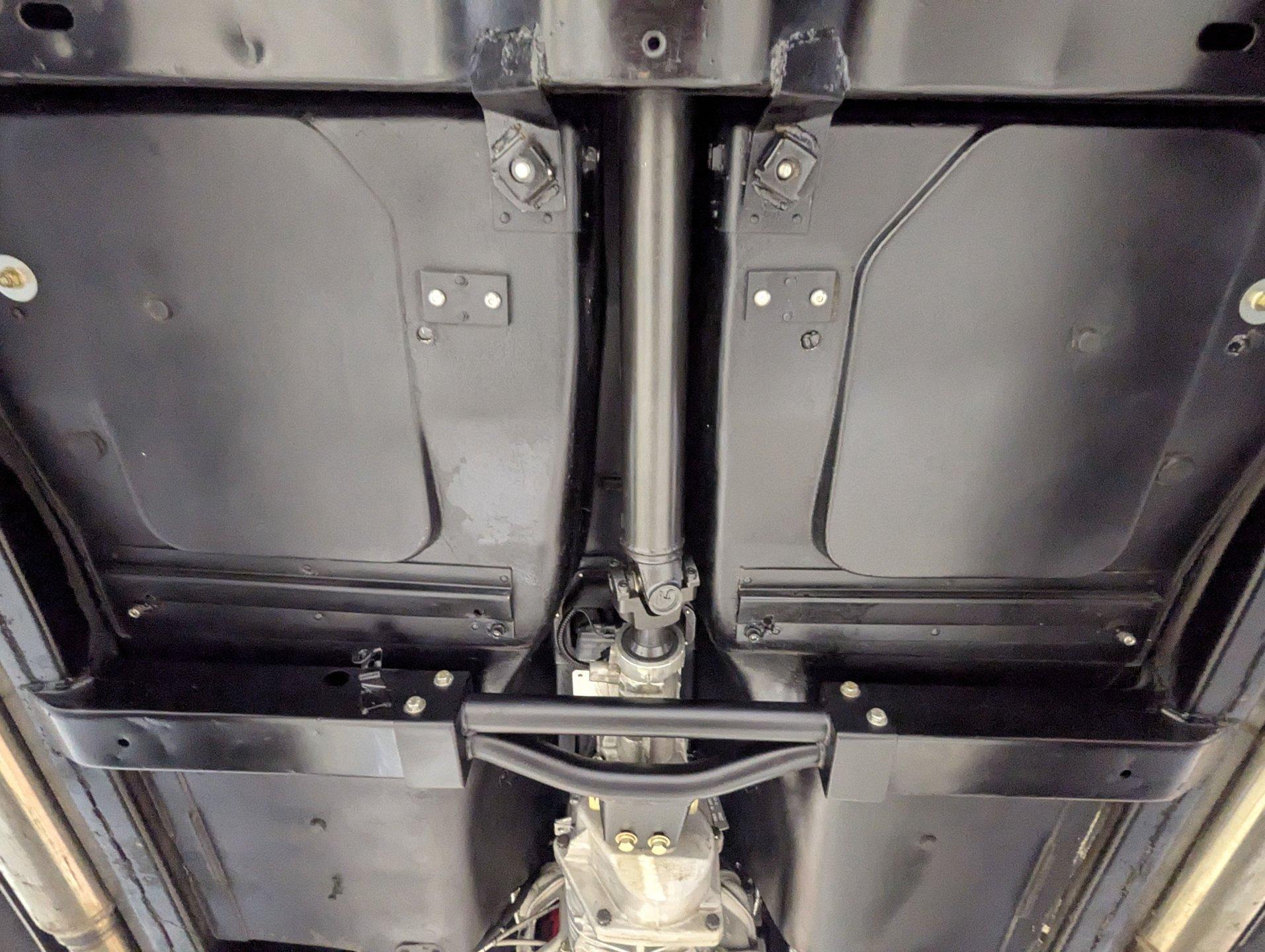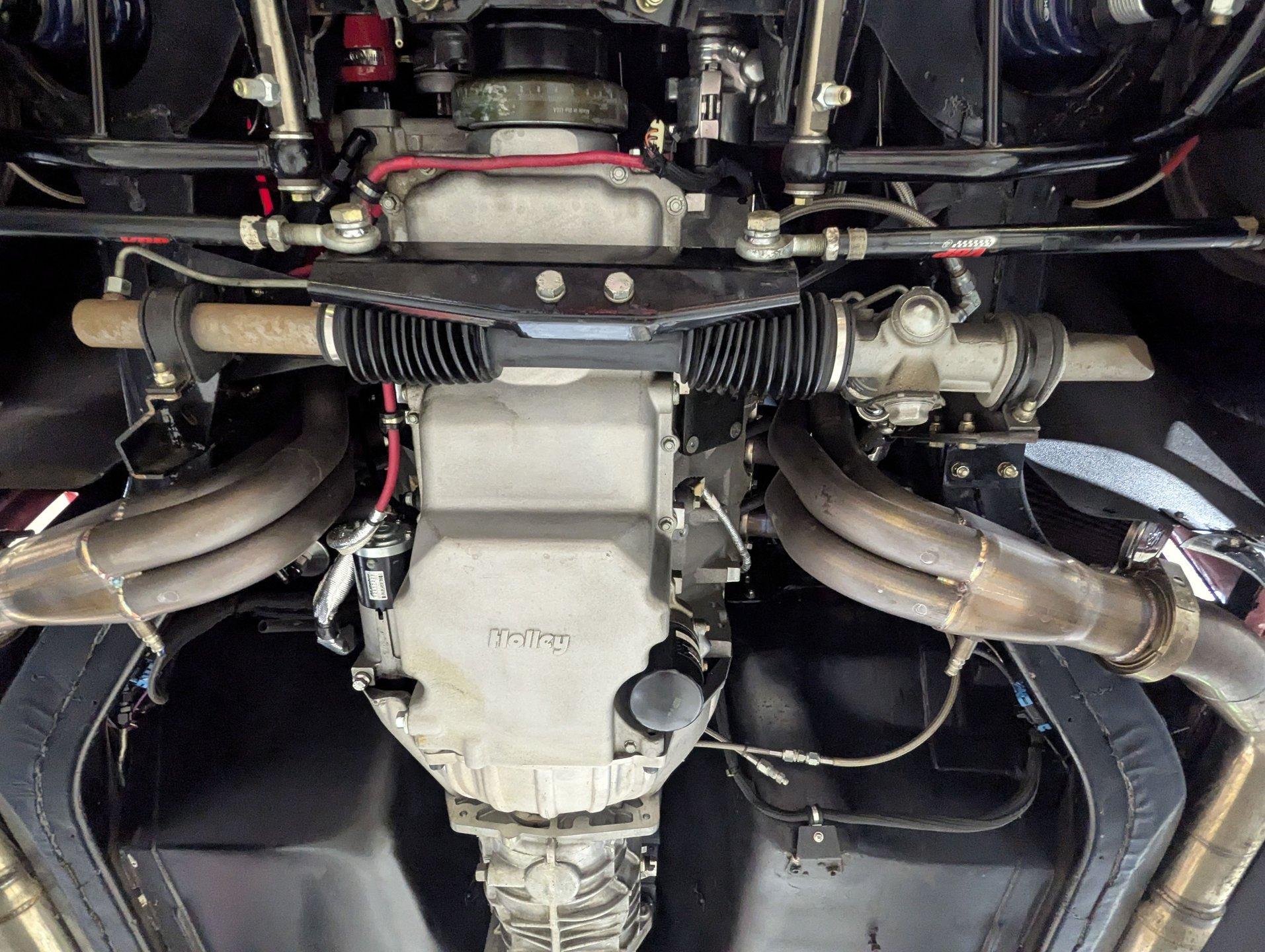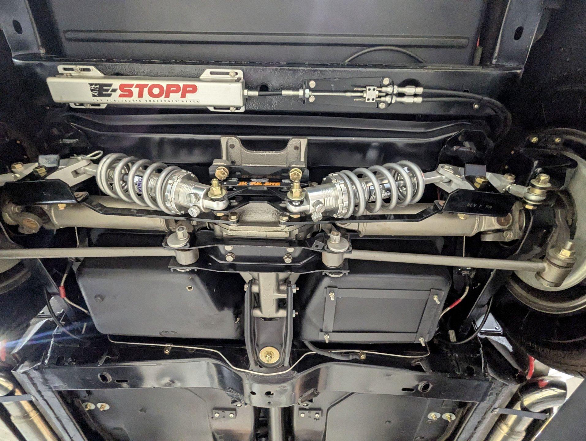 UNDERSIDE: The body was off the frame, and the underside has been thoroughly upgraded and detailed. Up front, it features a Van Steel suspension with tubular control arms and tie rods, coilover adjustable gas shocks, a sway bar, and rack-and-pinion steering. In back, it's upgraded with a SharkBite coilover suspension with double-adjustable gas shocks. The brake system has been completely replaced, it has disc brakes at all four wheels and an E-Stopp electric emergency brake. Looking up at the motor, it has an aluminum oil pan and a high-torque starter. It's equipped with a new Tremec 5-speed transmission with a hydraulic clutch, and a custom driveshaft leads back to the 3.42 posi rear end. The fuel system has been replaced and upgraded for fuel injection, featuring premium AN fittings. The side exhaust system is all new. The frame and suspension components are all freshly painted, and the fiberglass floors are finished as well. It looks new underneath-because it practically is!