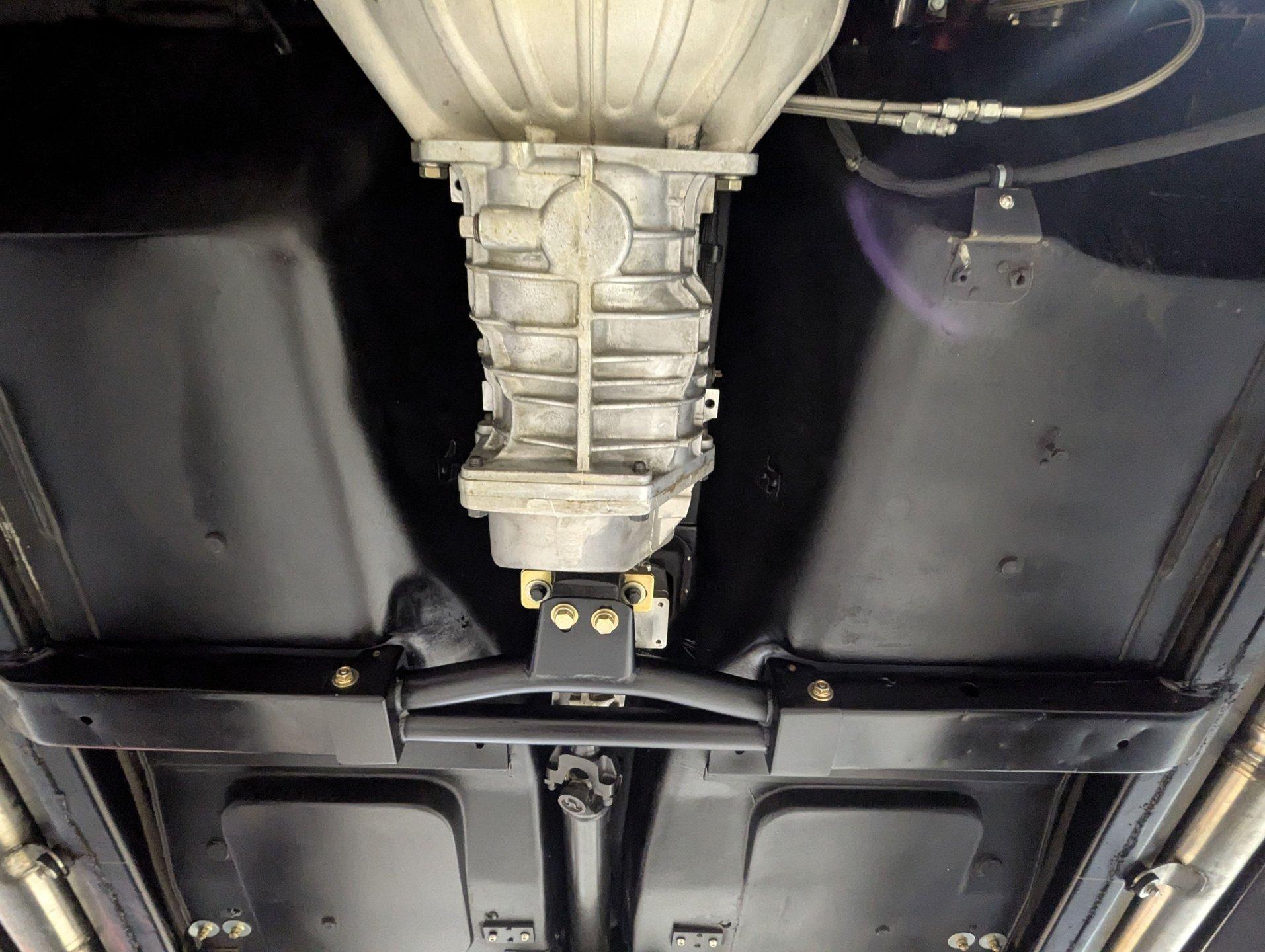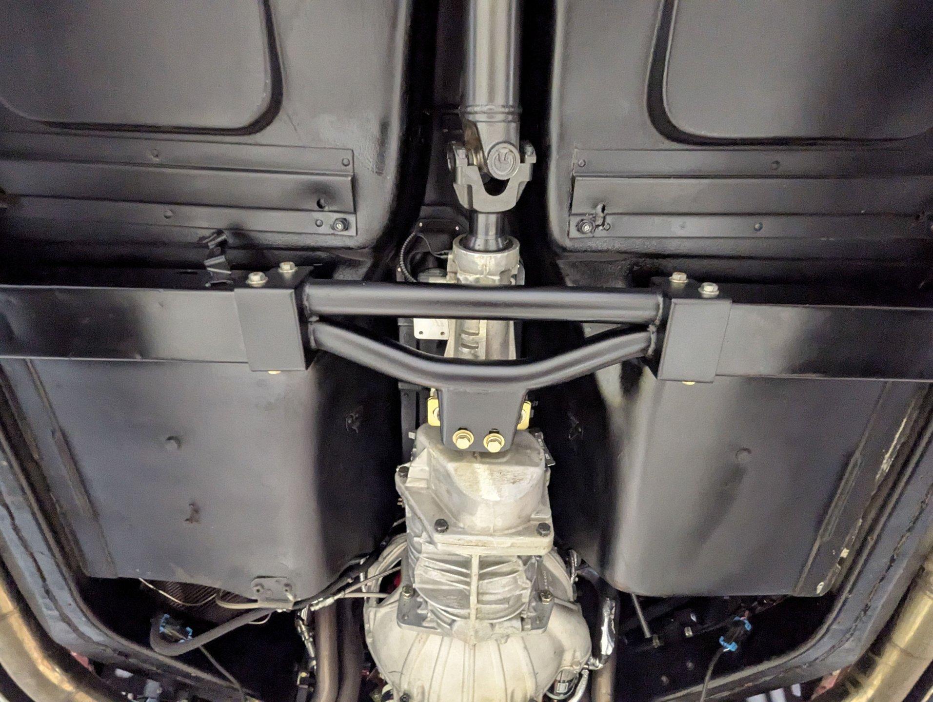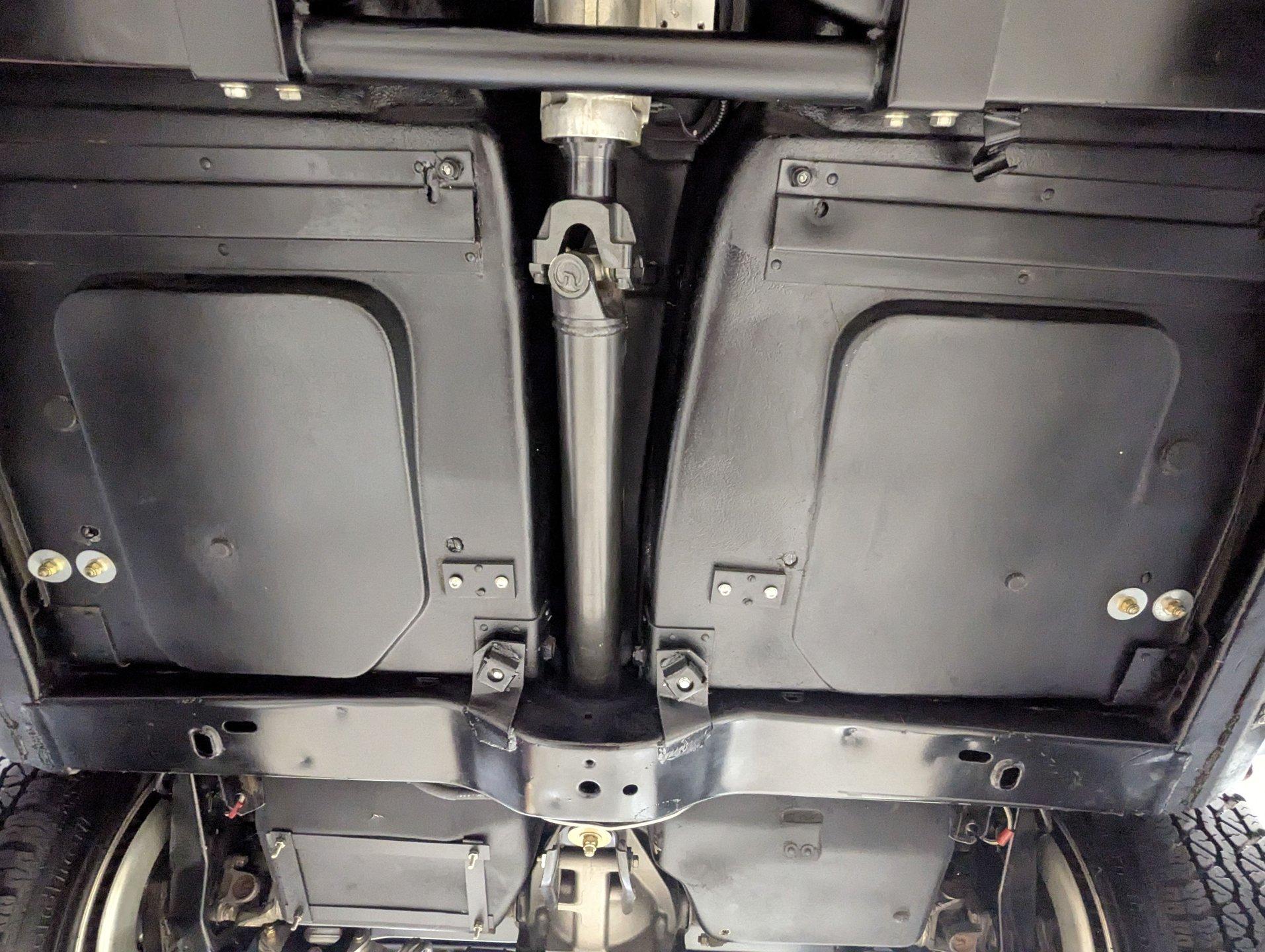UNDERSIDE: The body was off the frame, and the underside has been thoroughly upgraded and detailed. Up front, it features a Van Steel suspension with tubular control arms and tie rods, coilover adjustable gas shocks, a sway bar, and rack-and-pinion steering. In back, it's upgraded with a SharkBite coilover suspension with double-adjustable gas shocks. The brake system has been completely replaced, it has disc brakes at all four wheels and an E-Stopp electric emergency brake. Looking up at the motor, it has an aluminum oil pan and a high-torque starter. It's equipped with a new Tremec 5-speed transmission with a hydraulic clutch, and a custom driveshaft leads back to the 3.42 posi rear end. The fuel system has been replaced and upgraded for fuel injection, featuring premium AN fittings. The side exhaust system is all new. The frame and suspension components are all freshly painted, and the fiberglass floors are finished as well. It looks new underneath-because it practically is!