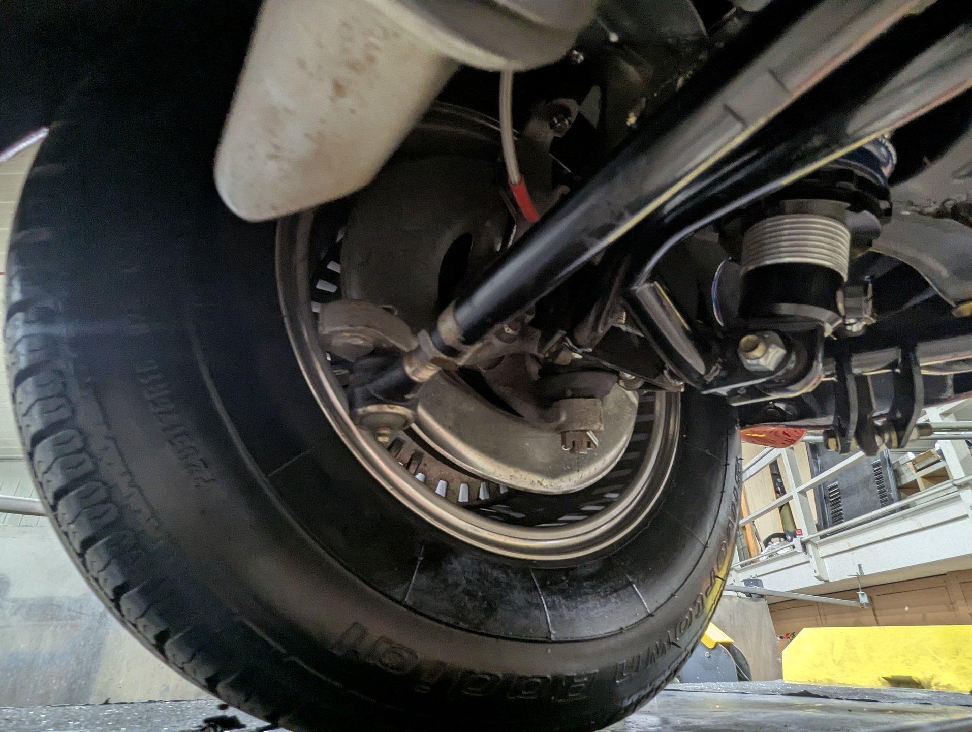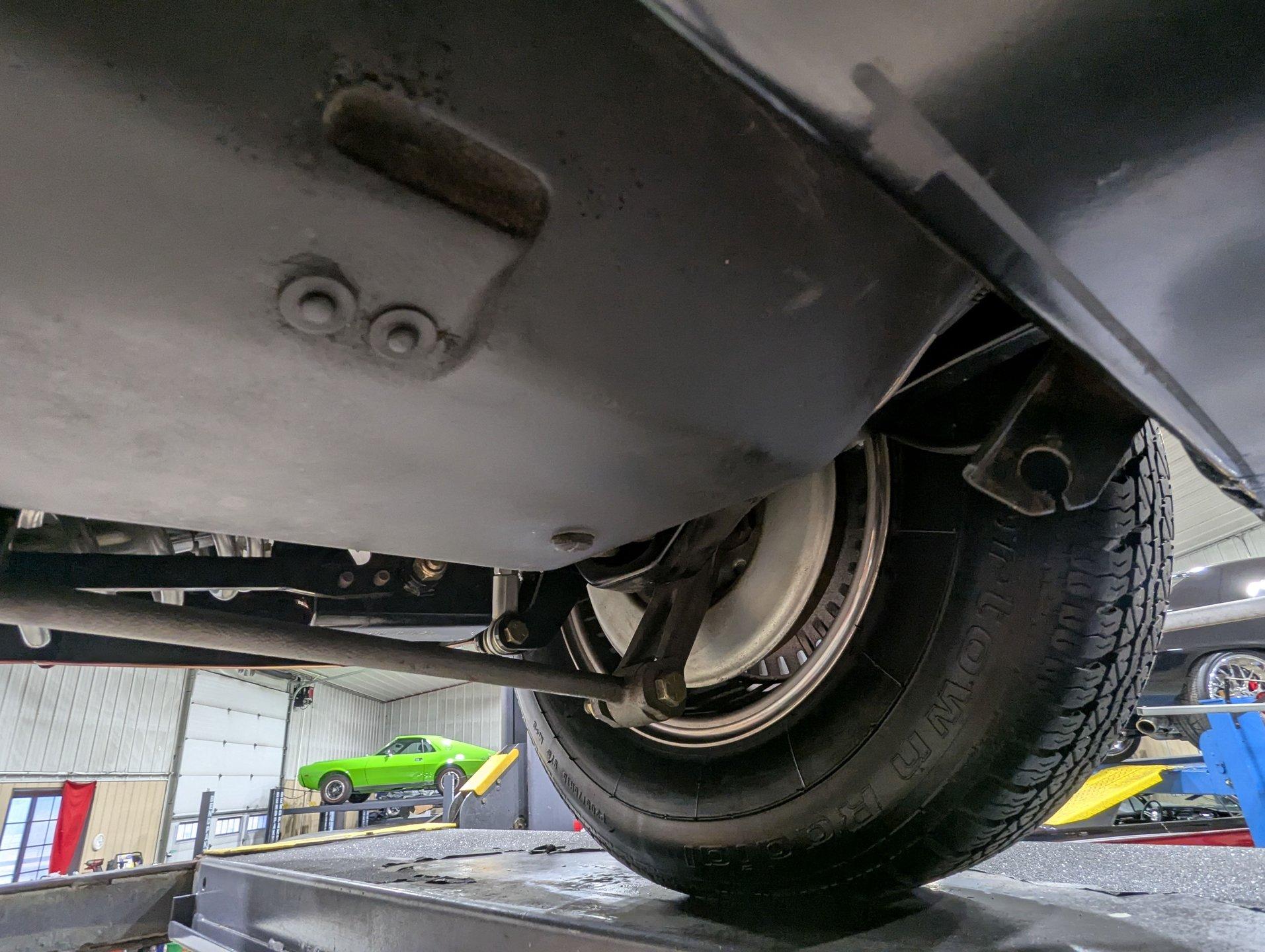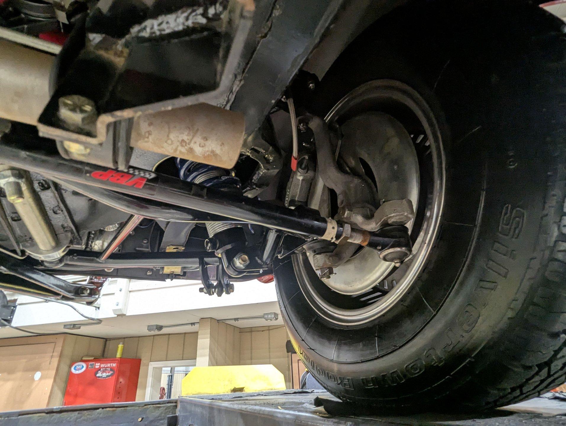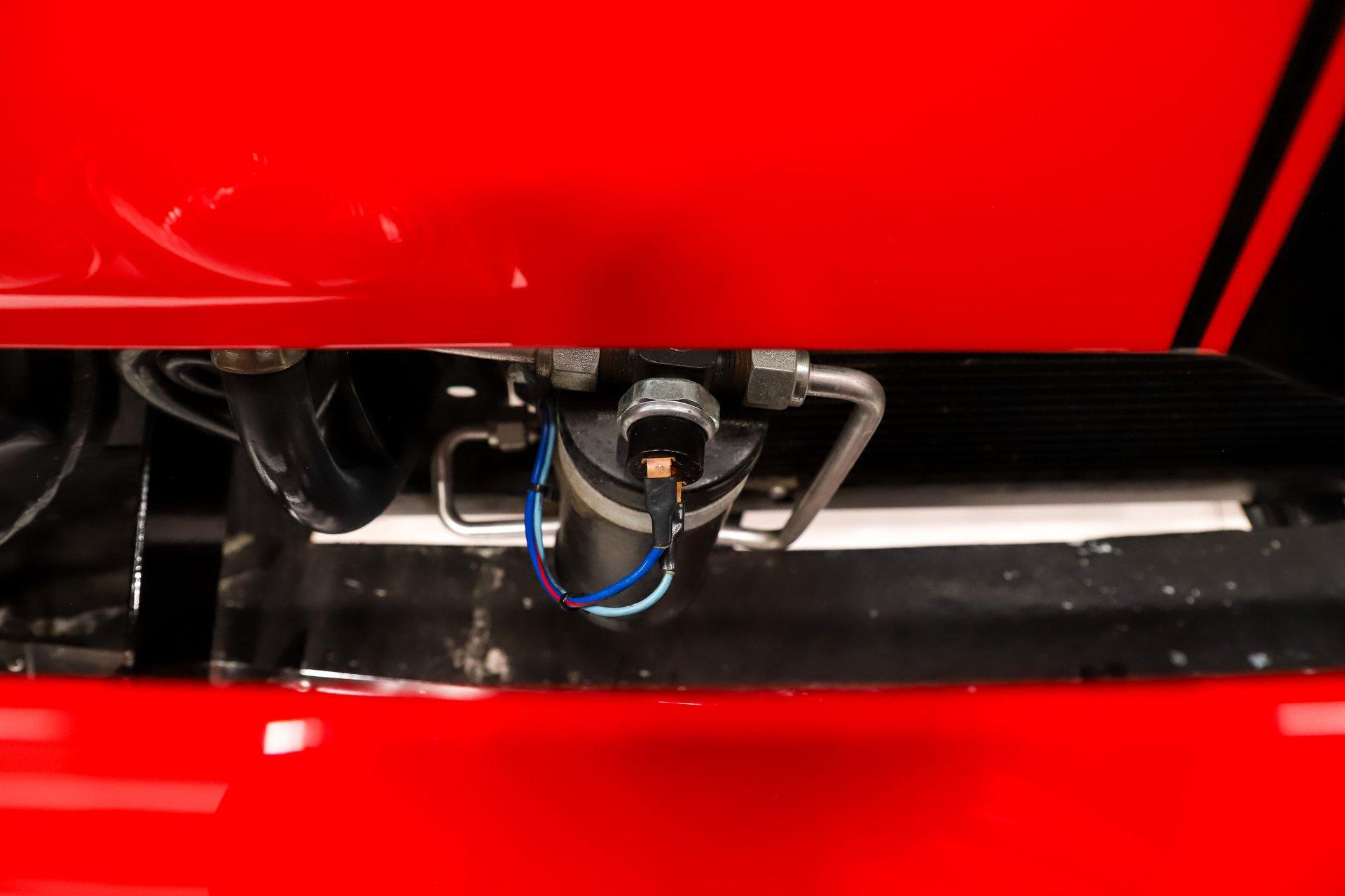UNDERSIDE: The body was off the frame, and the underside has been thoroughly upgraded and detailed. Up front, it features a Van Steel suspension with tubular control arms and tie rods, coilover adjustable gas shocks, a sway bar, and rack-and-pinion steering. In back, it's upgraded with a SharkBite coilover suspension with double-adjustable gas shocks. The brake system has been completely replaced, it has disc brakes at all four wheels and an E-Stopp electric emergency brake. Looking up at the motor, it has an aluminum oil pan and a high-torque starter. It's equipped with a new Tremec 5-speed transmission with a hydraulic clutch, and a custom driveshaft leads back to the 3.42 posi rear end. The fuel system has been replaced and upgraded for fuel injection, featuring premium AN fittings. The side exhaust system is all new. The frame and suspension components are all freshly painted, and the fiberglass floors are finished as well. It looks new underneath-because it practically is!