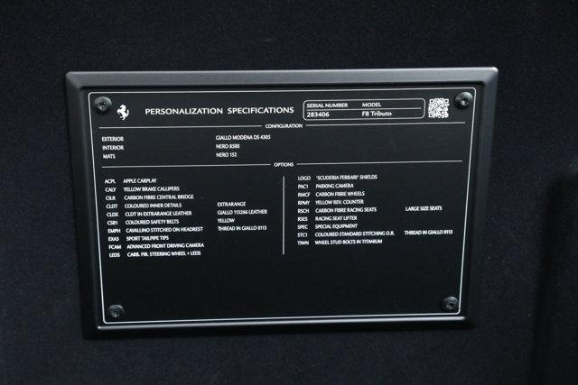 Ferrari F8 Tributo- FERRARI CERTIFIED PRE-OWNED - AVAILABLE EXTENDED FERRARI WARRANTY -- Giallo Modena over Nero - Two Owners - Low Miles - Pristine Condition - Many Fine Options - Expertly Maintained by Our Factory Trained Technicians - Available Extended Ferrari Warranty - Complimentary Ferrari Genuine Maintenance Service to 11/4/29 -Factory Options:- Carbon Fiber Wheels- Carbon Fiber LED Steering Wheel- Carbon Fiber Central Bridge- Carbon Fiber Racing Seats- Titanium Wheel Bolts- Yellow Brake Calipers- Scuderia Ferrari Shields- Racing Seat Lifter- Cavallino Stitched to Headrests in Giallo- Stitching in Giallo- Colored Inner Details in Giallo- Seatbelts in Giallo- Apple CarPlay- Sport Tailpipe Tips- Advanced Front Driving Camera- Parking Camera- Yellow Rev CounterIf you are in the market for a Ferrari F8 Tributo, please call or email us today.This Ferrari has passed a multi-point inspection performed by our factory trained technicians, and has been enrolled in the Ferrari Approved Certified Pre-Owned Program. The Certified program makes available up to two years of additional Ferrari Power Approved Warranty coverage. Please see dealer for more details.