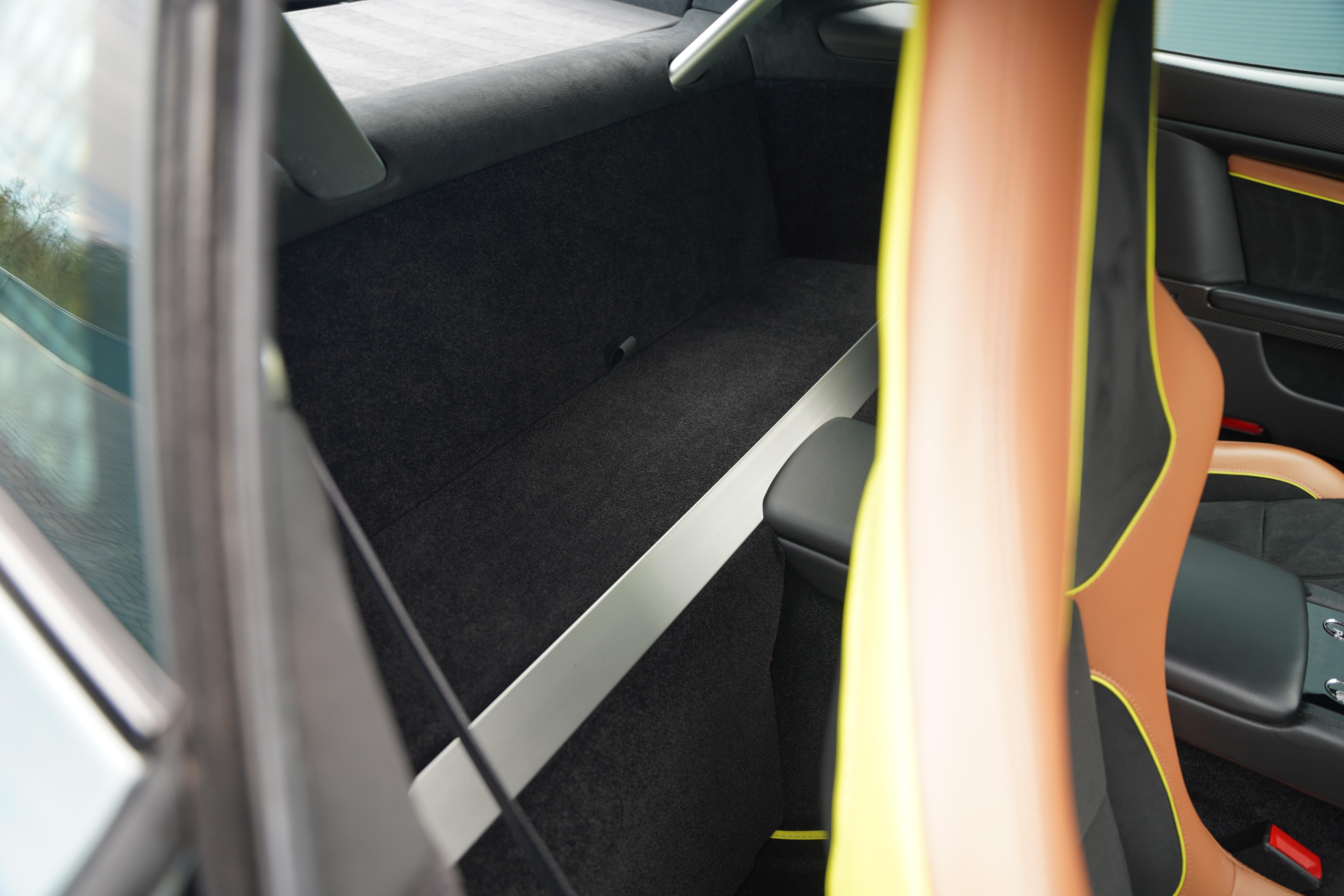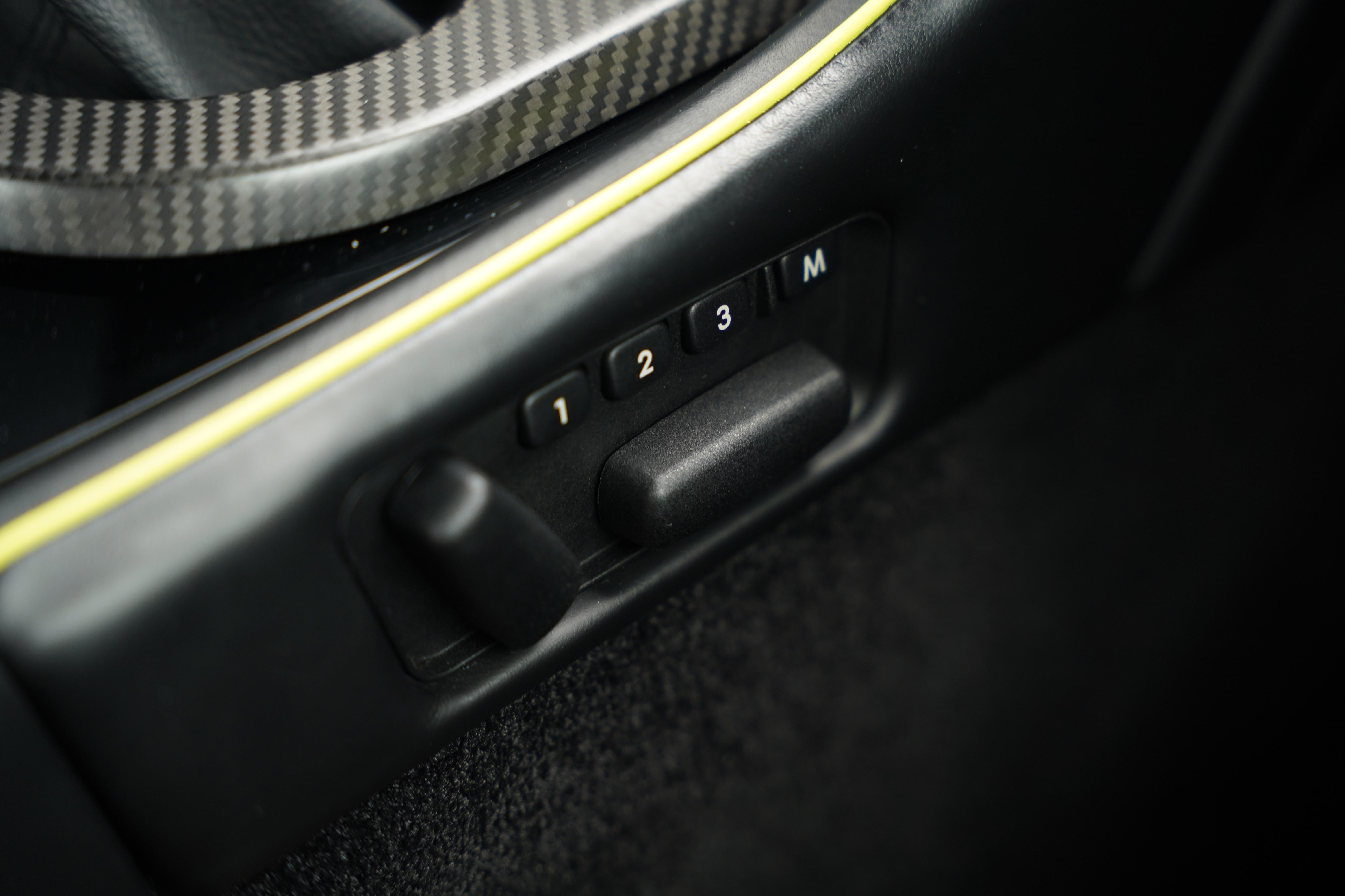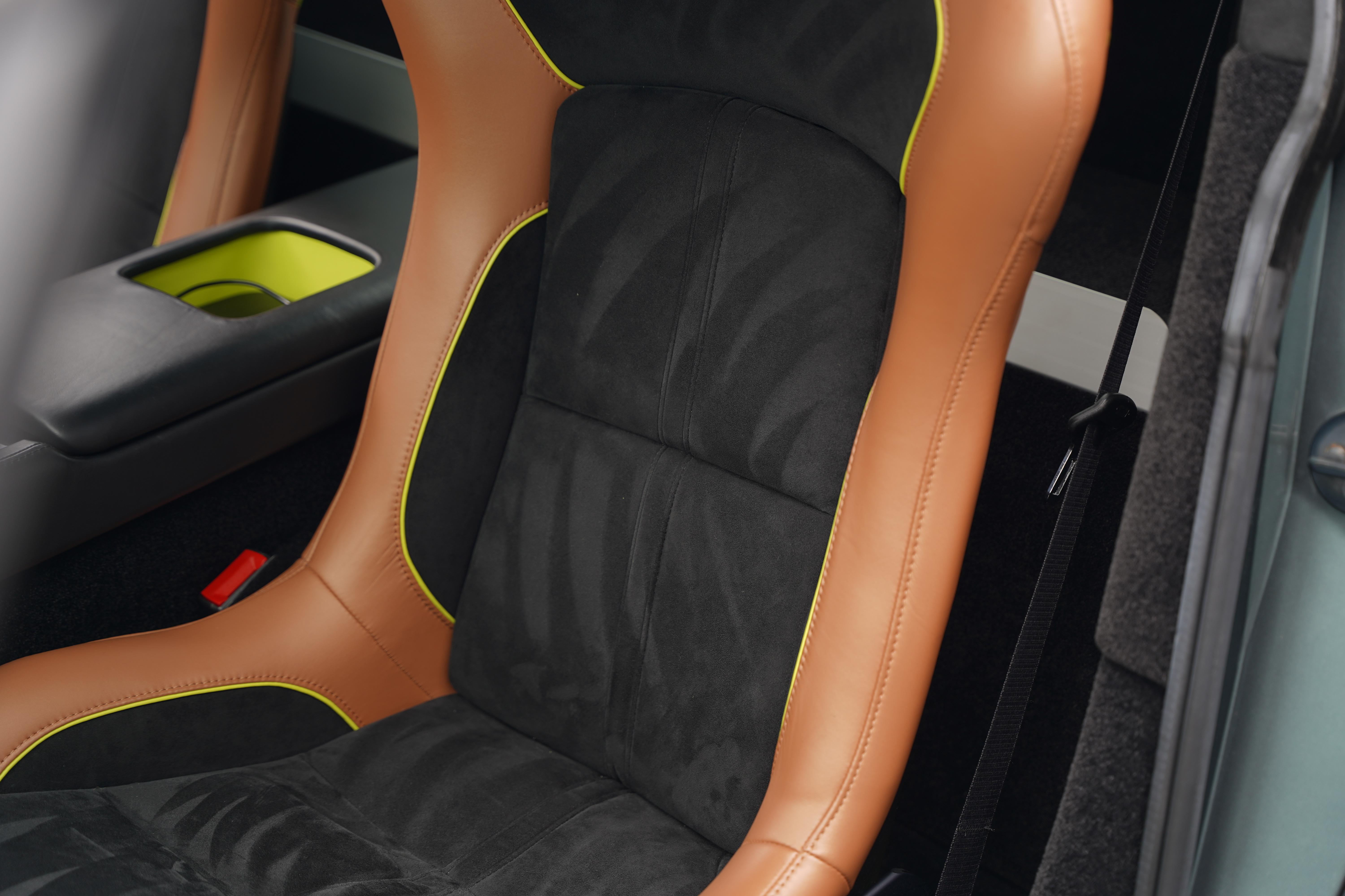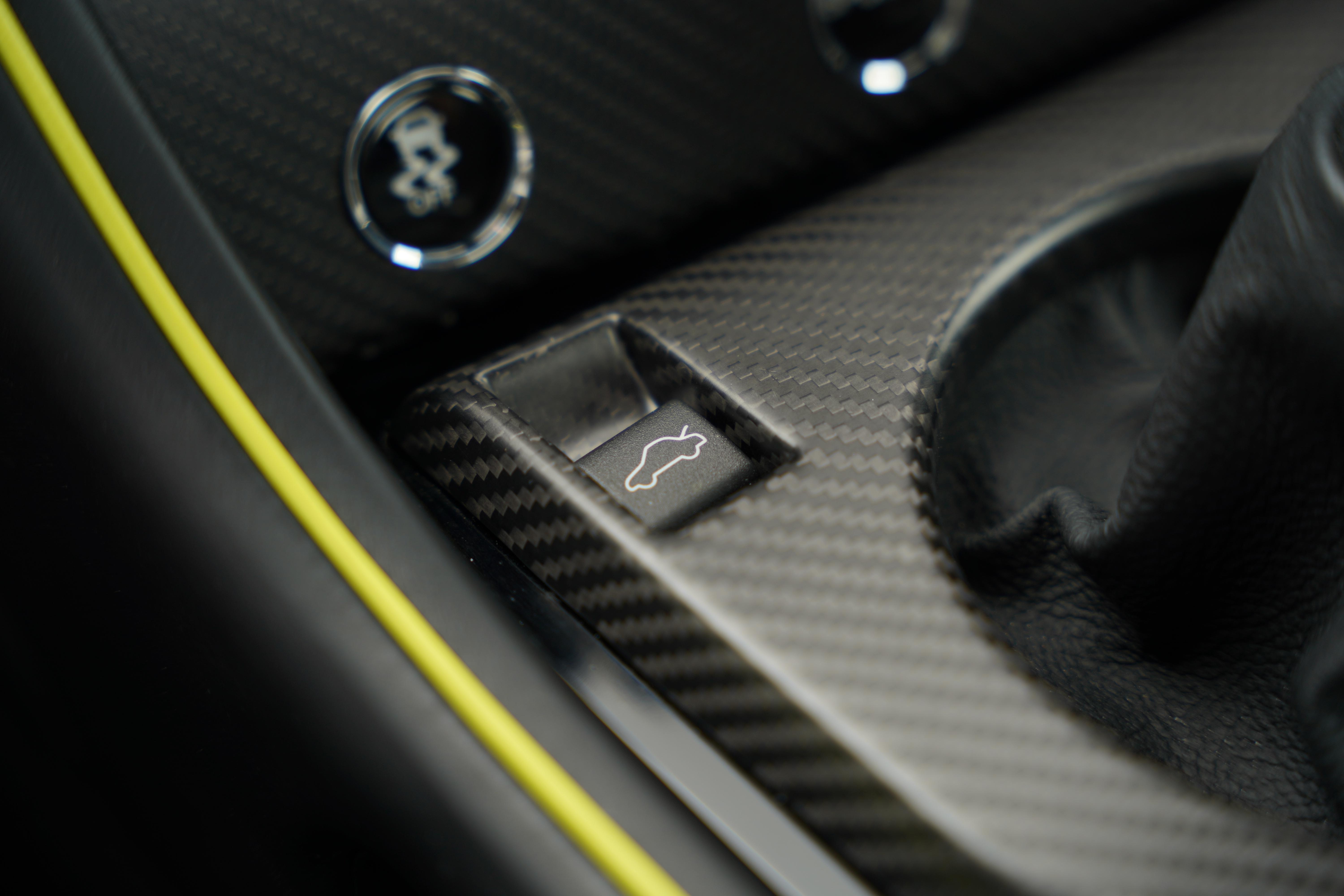 The interior follows the exterior styling perfectly, with the glorious Halo Pack colourway. The lightweight carbon seats feature Copper Tan bolsters with Pure Black Alcantara centre panels, highlighted by Lime Green piping and rear panels. The Alcantara steering wheel and dash house the carbon fibre ski slope, again highlighted with Lime Green accent and the all-important gearstick takes centre stage with its carbon surround. The door cards follow suit again, completing the aesthetic.