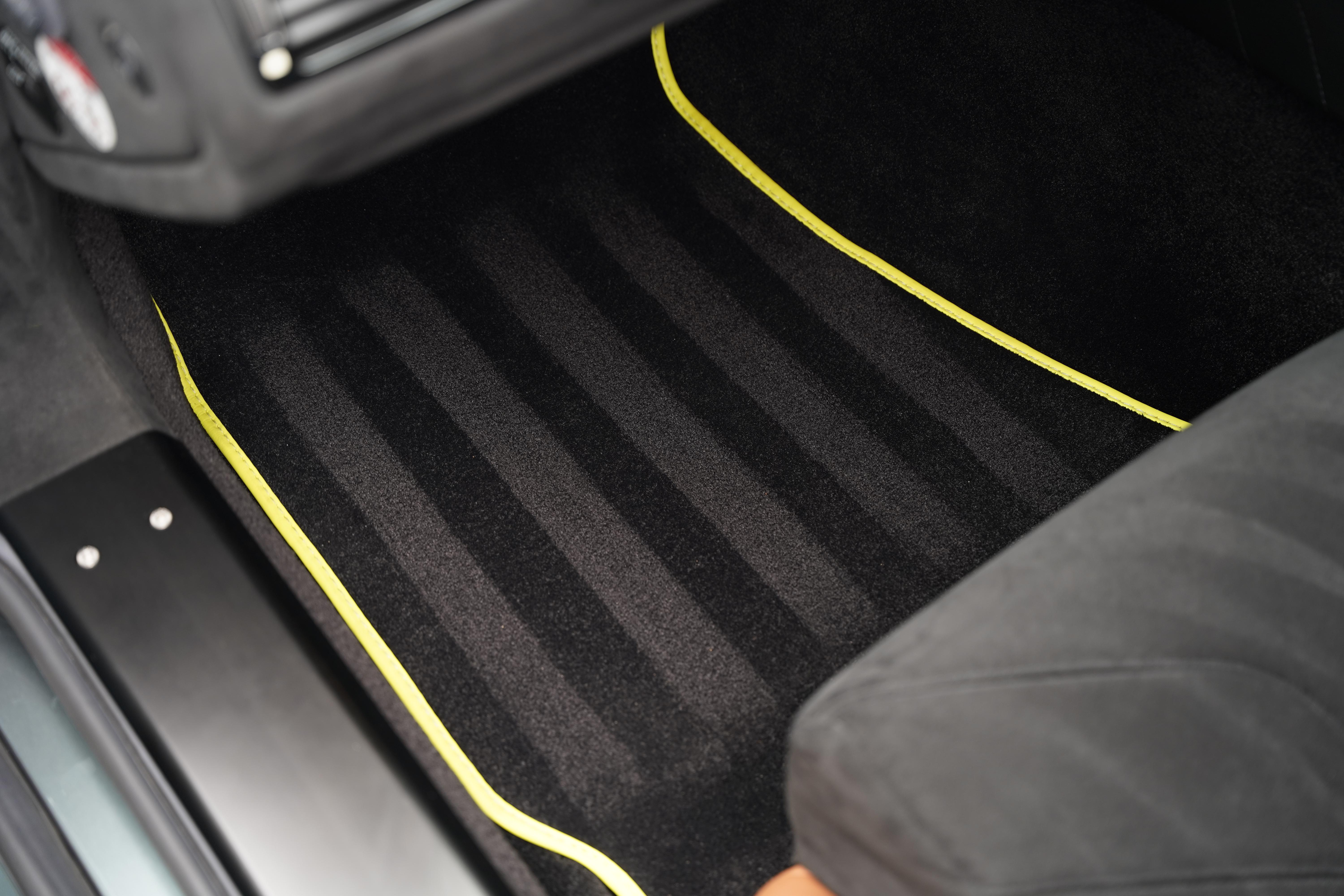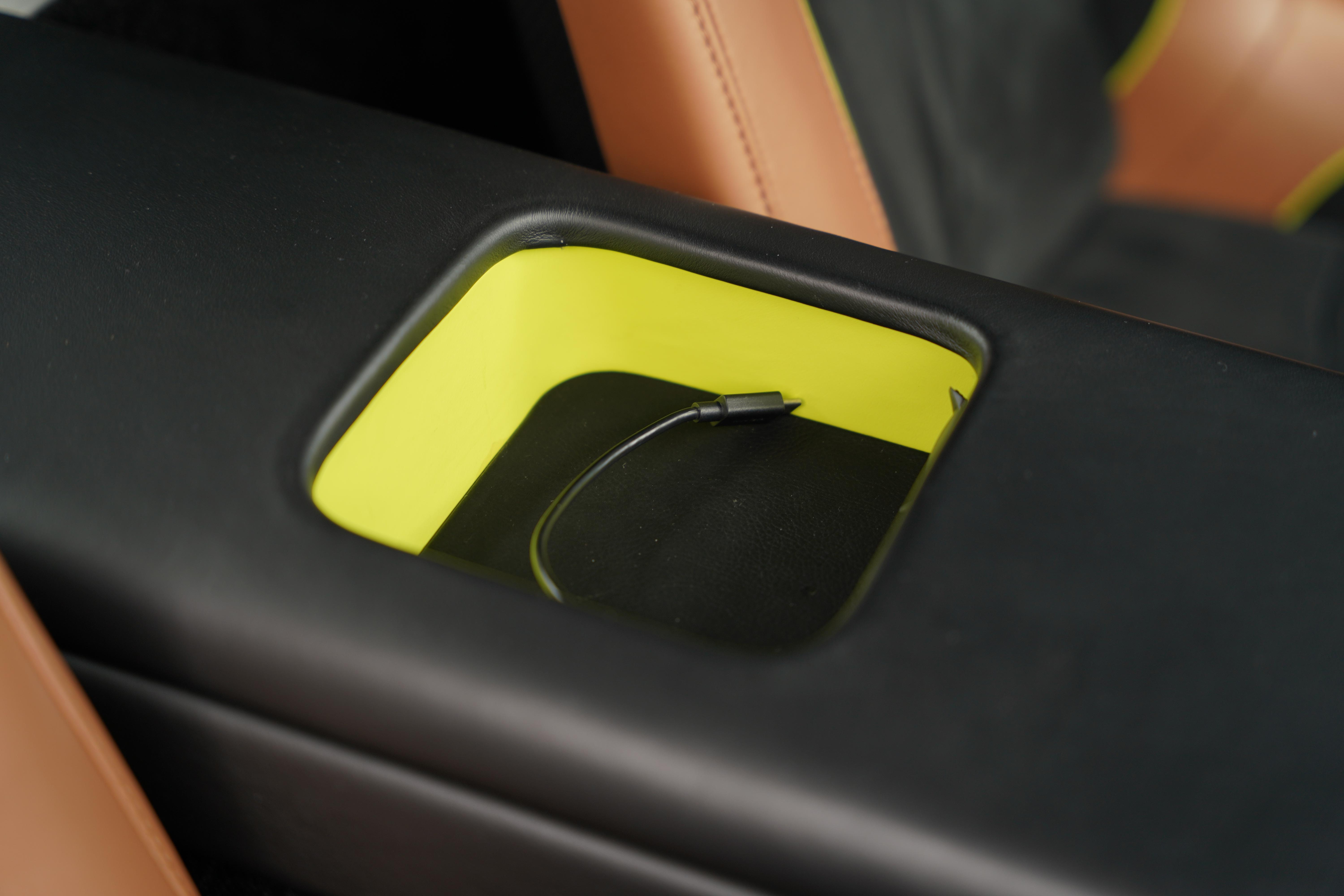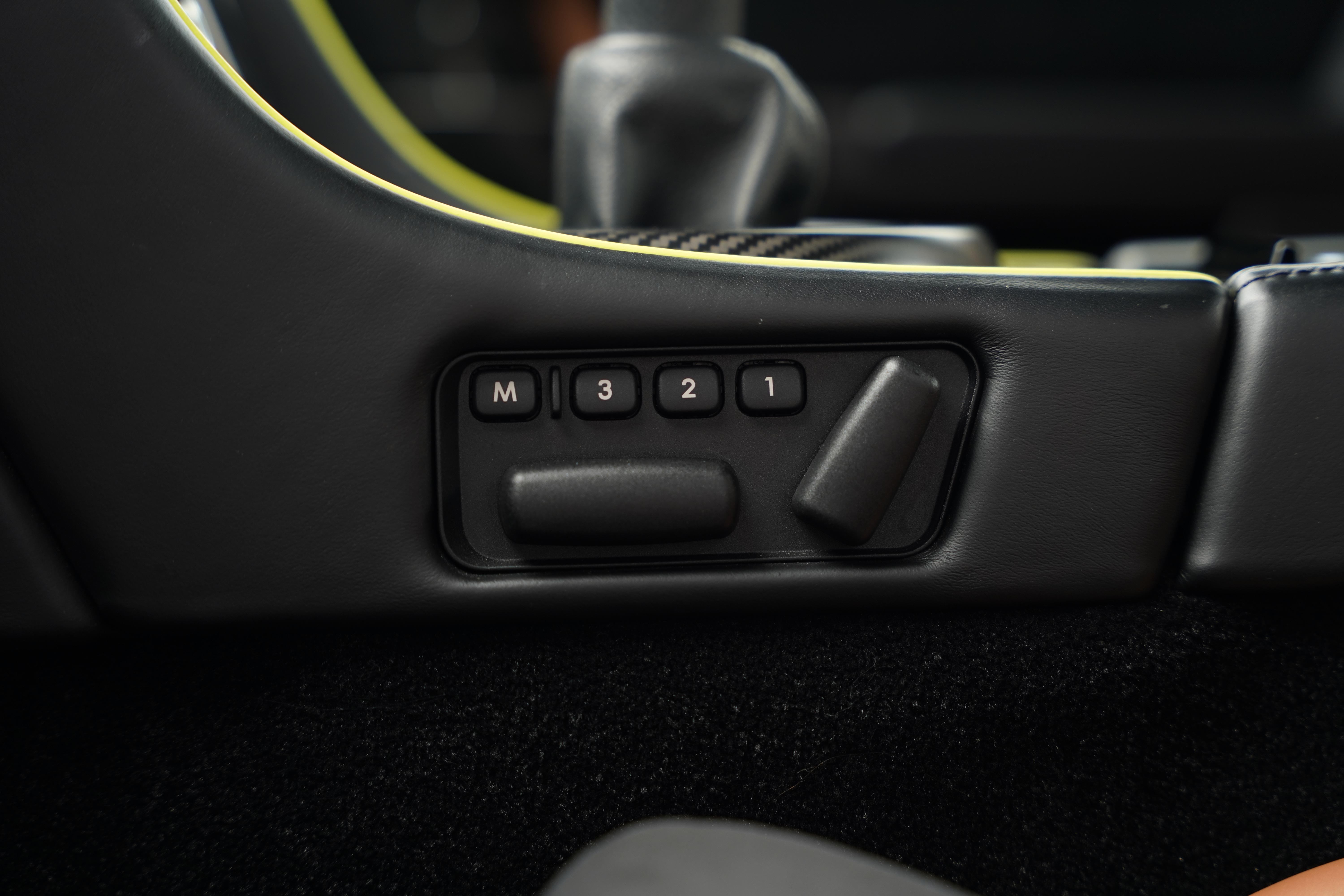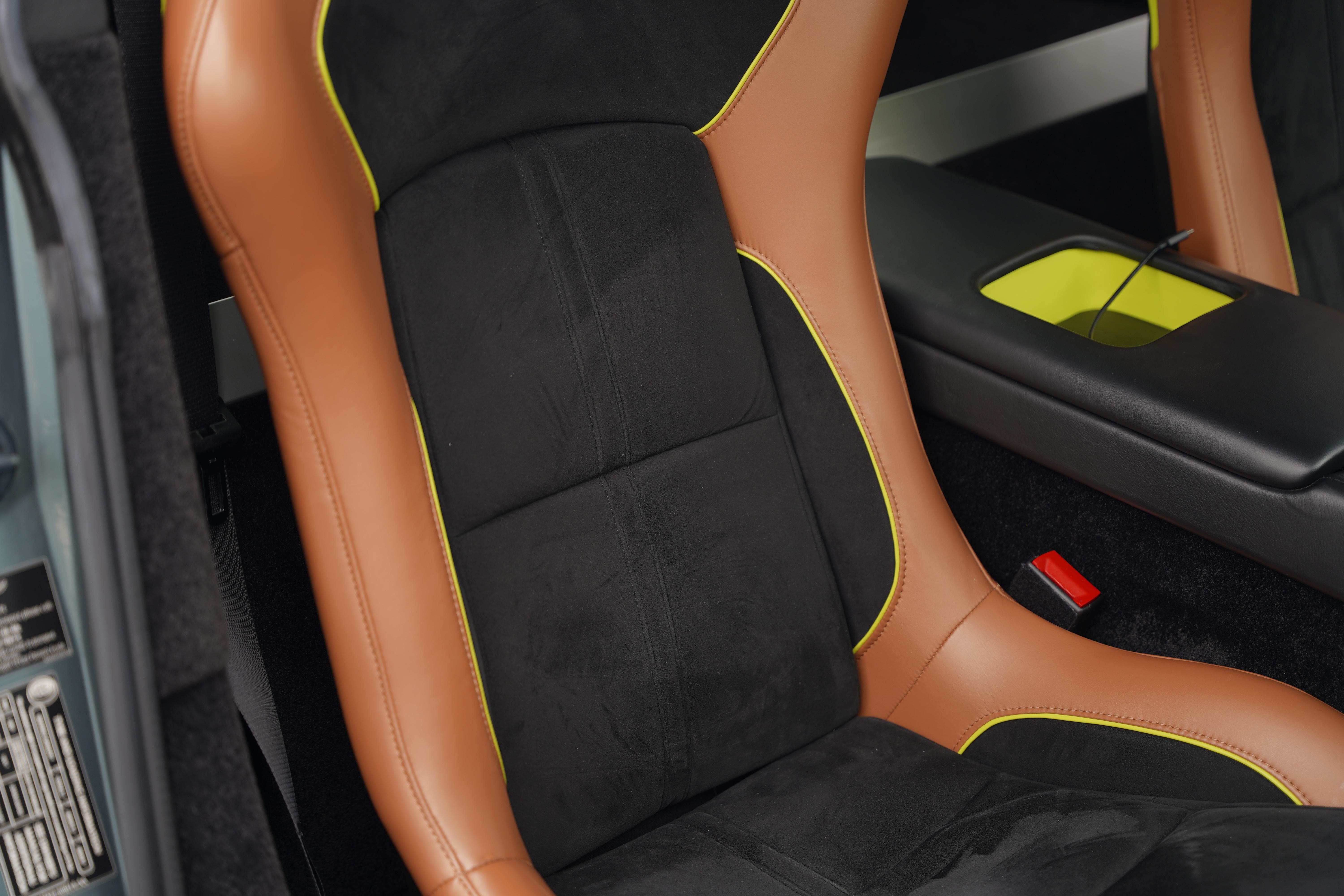 The interior follows the exterior styling perfectly, with the glorious Halo Pack colourway. The lightweight carbon seats feature Copper Tan bolsters with Pure Black Alcantara centre panels, highlighted by Lime Green piping and rear panels. The Alcantara steering wheel and dash house the carbon fibre ski slope, again highlighted with Lime Green accent and the all-important gearstick takes centre stage with its carbon surround. The door cards follow suit again, completing the aesthetic.