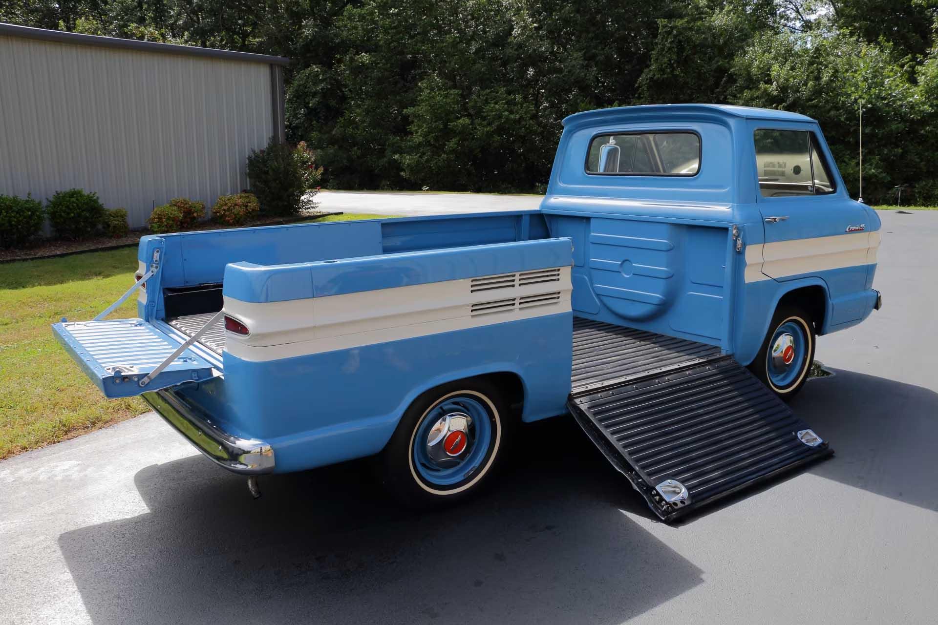 Flat 6 cylinder engine with 80 horsepower,Developed by Chevrolet General Motors Ed Cole,Cab over configuration,Step down cargo area in front & rear mounted engine,Hinged gate on passenger side for easy access to bed,4 speed manual transmission,Bench seat,AM radio,White wall tires,Chrome bumpers and grill