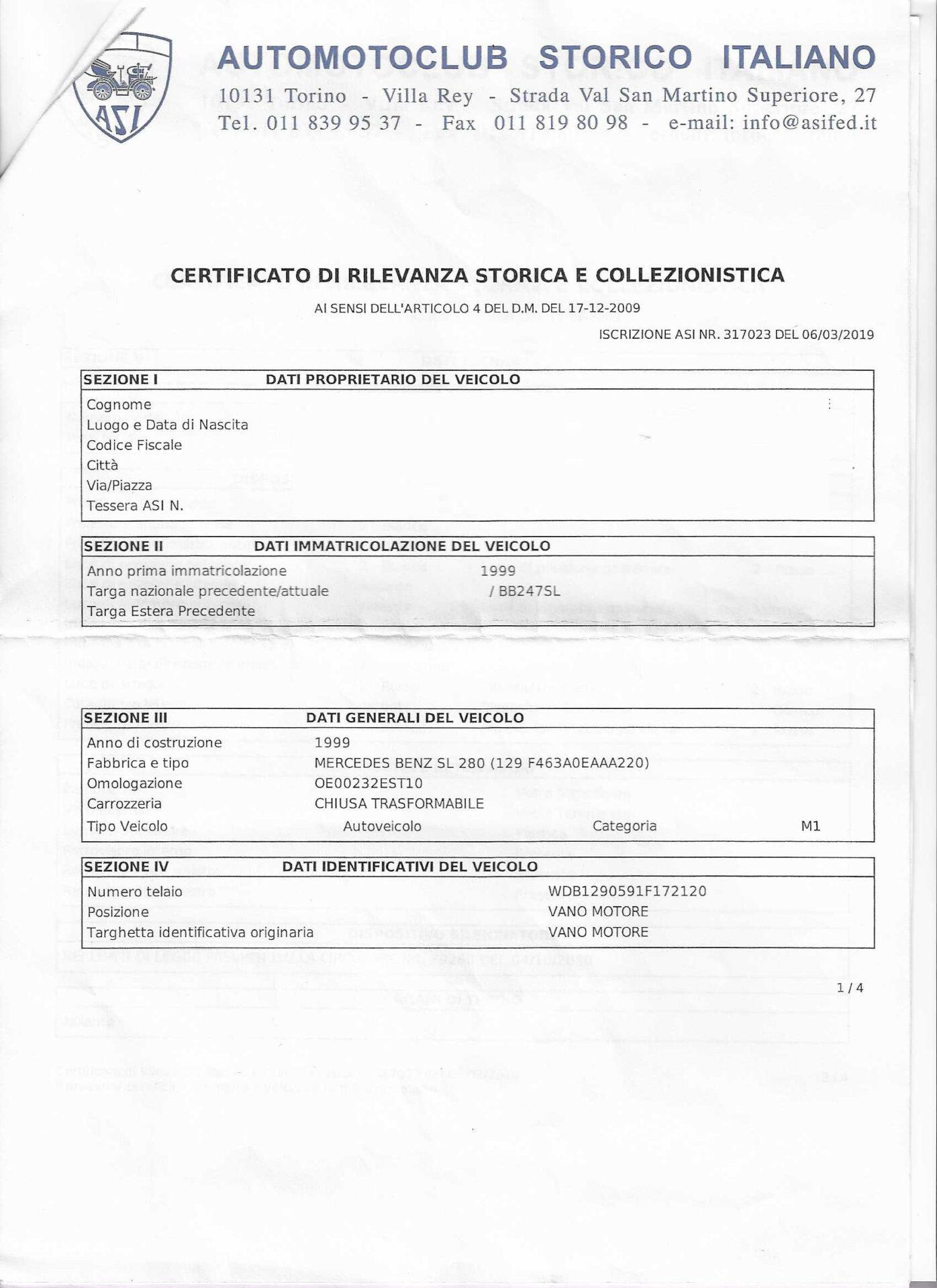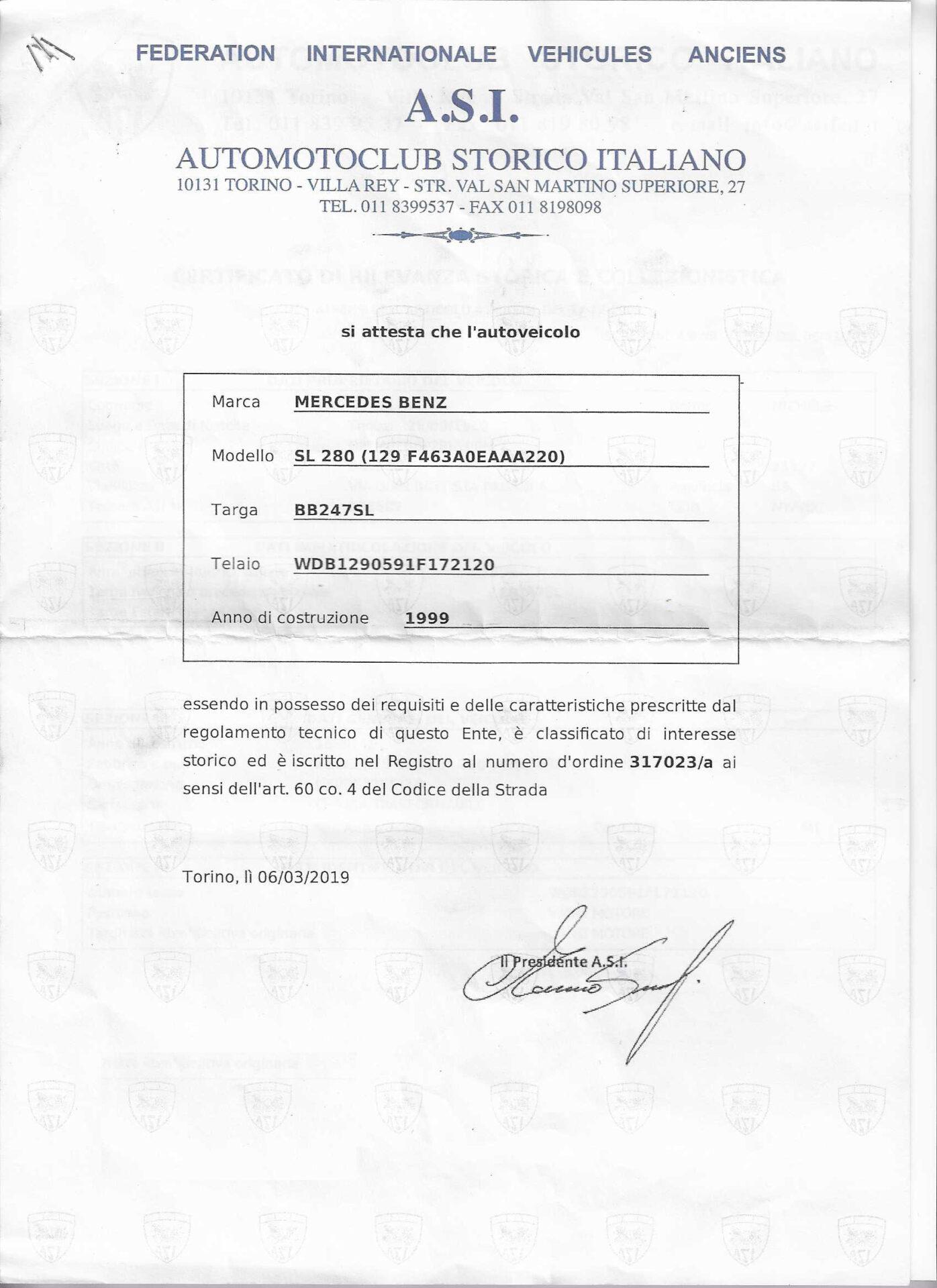 In 2019, it was registered with the Italian Historic Automobile Club (ASI), and in 2024, it received the Certificate of Historical Significance, now officially noted on the vehicle registration document, granting tax exemptions and historic vehicle benefits.