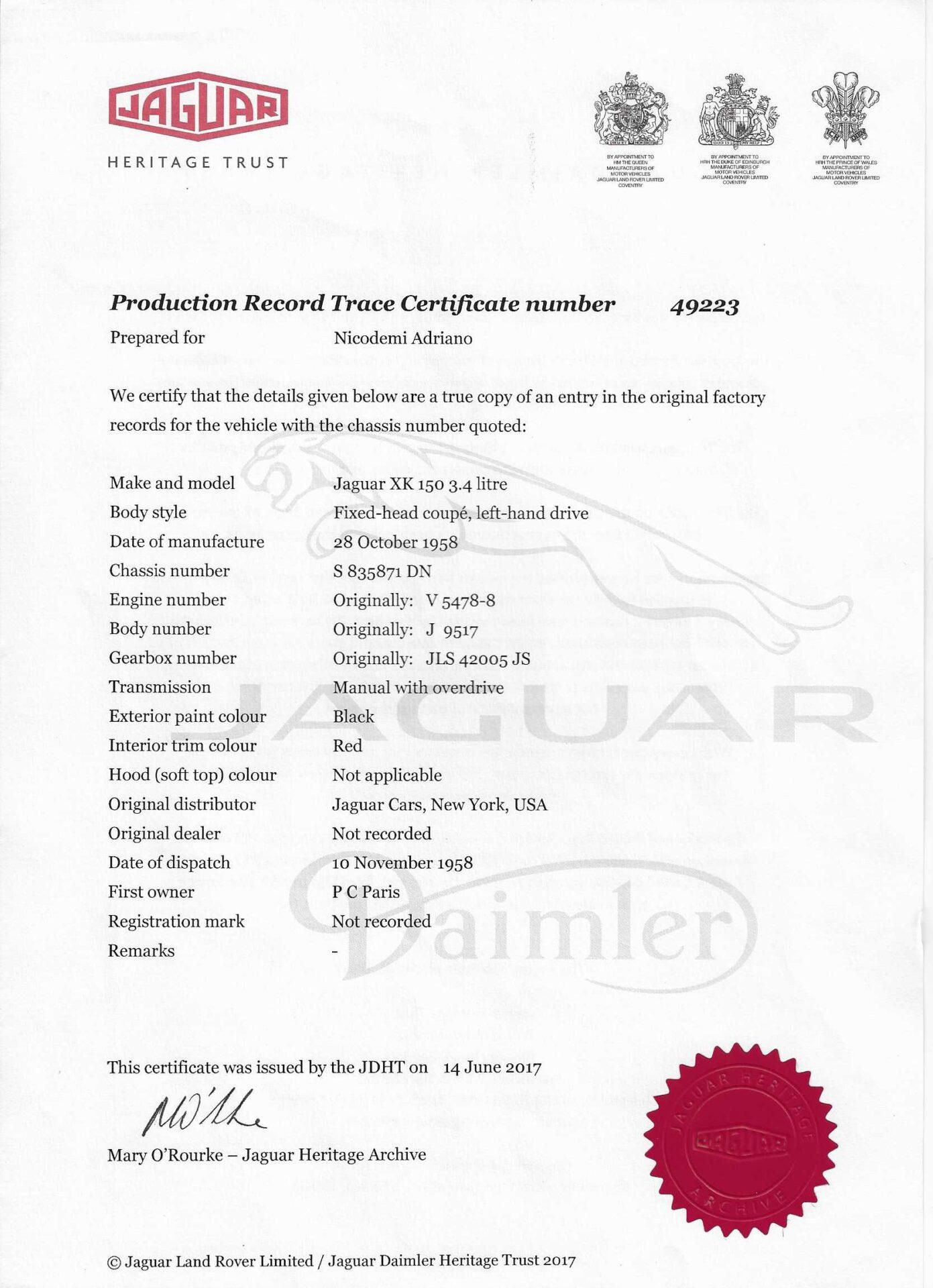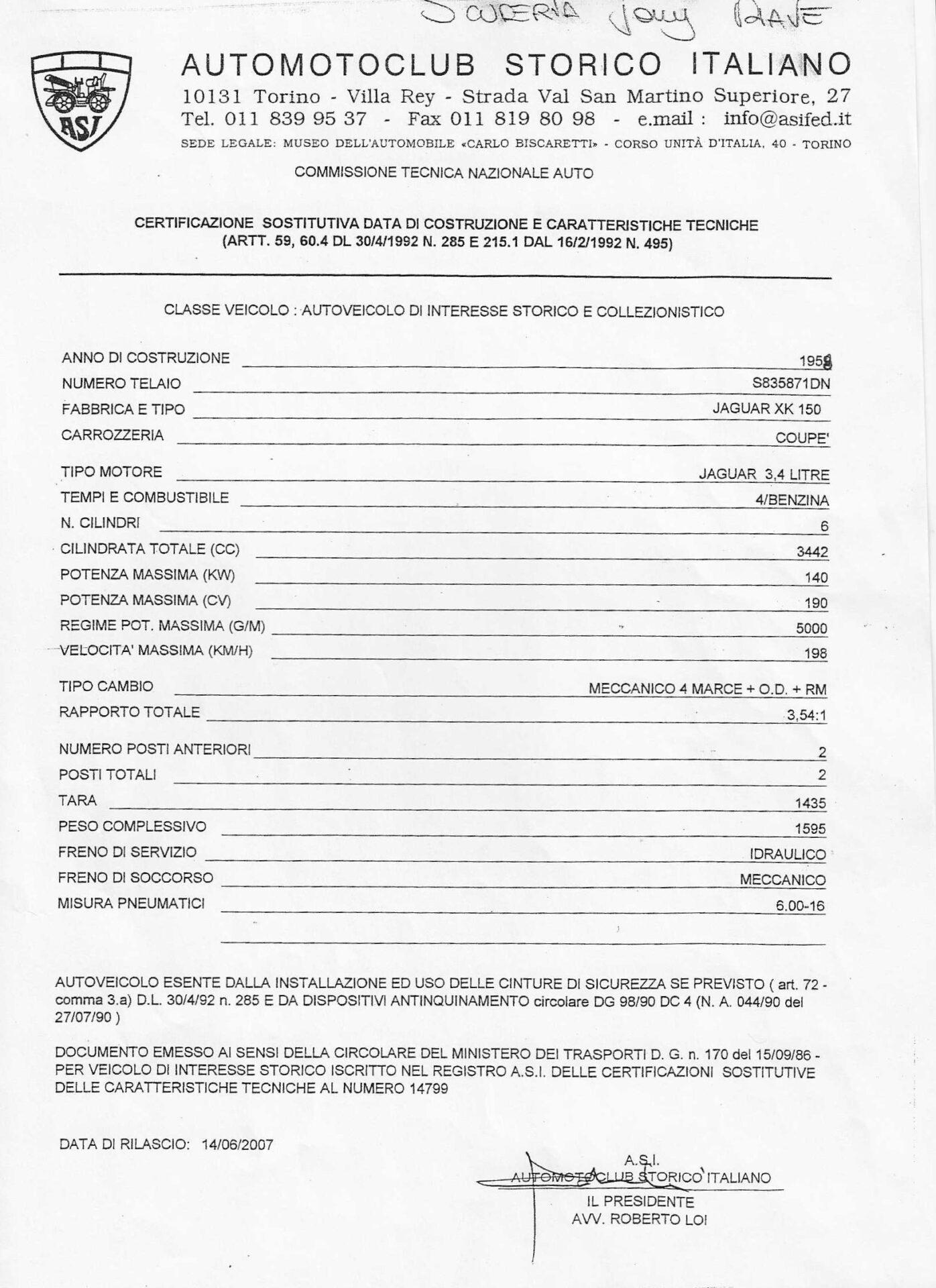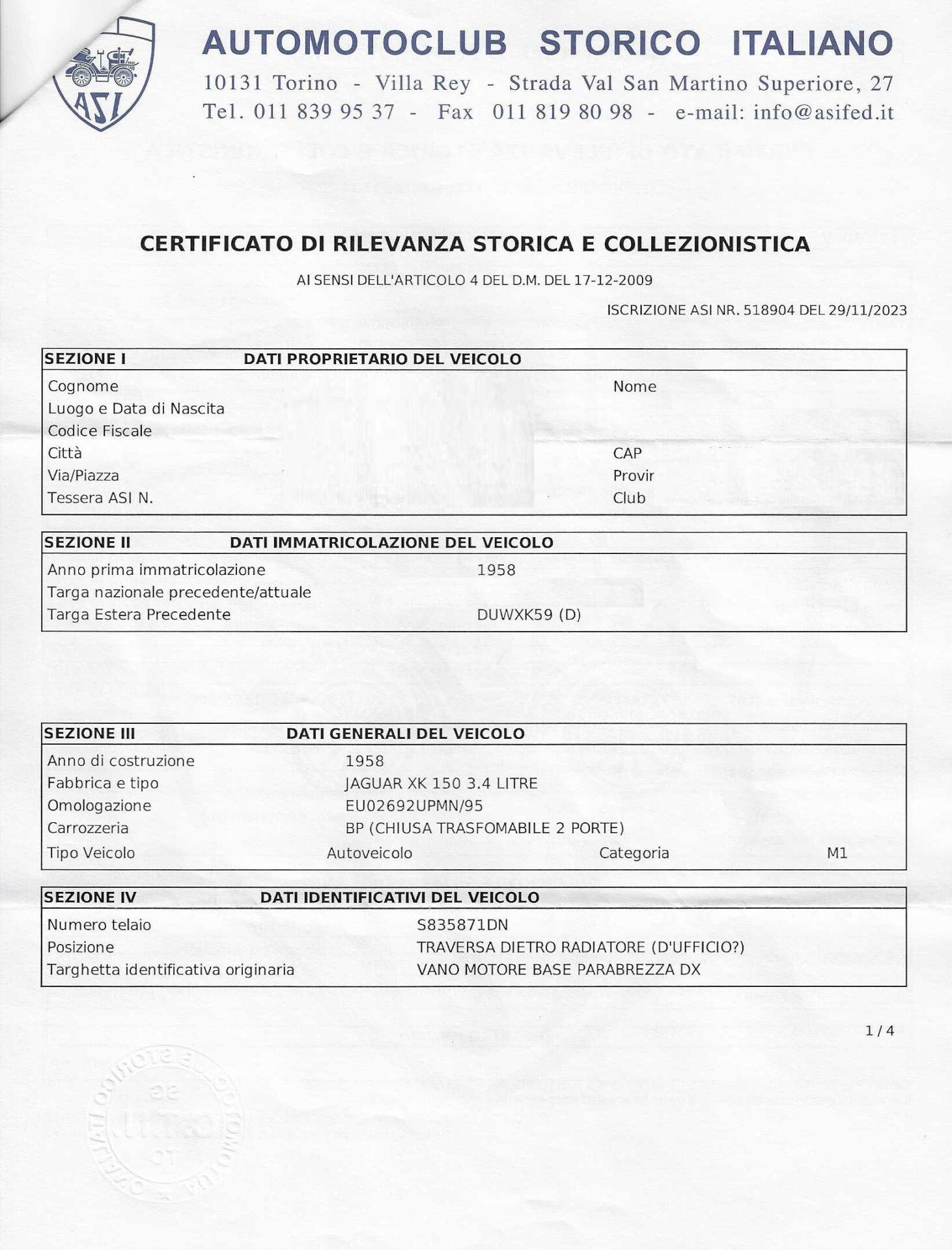 In 2017, the car received the Jaguar Heritage Certificate, confirming its factory specifications. In 2023, it was awarded the ASI Certificate of Historical and Collectible Significance, a prestigious recognition for collectible vehicles in Italy.