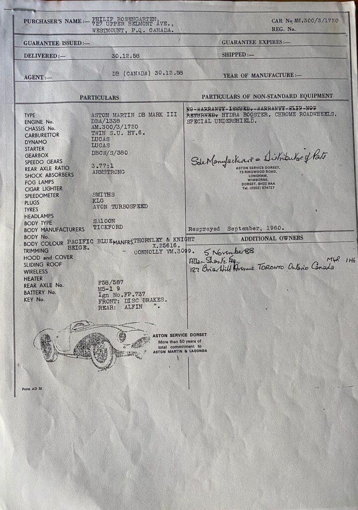 Shipped from the Aston Martin factory on 30 December 1958 to the Canadian importer DB Cars, this DB2/4 MkIII was delivered to Mr. Philip Rosengarten of Westmount, Canada.