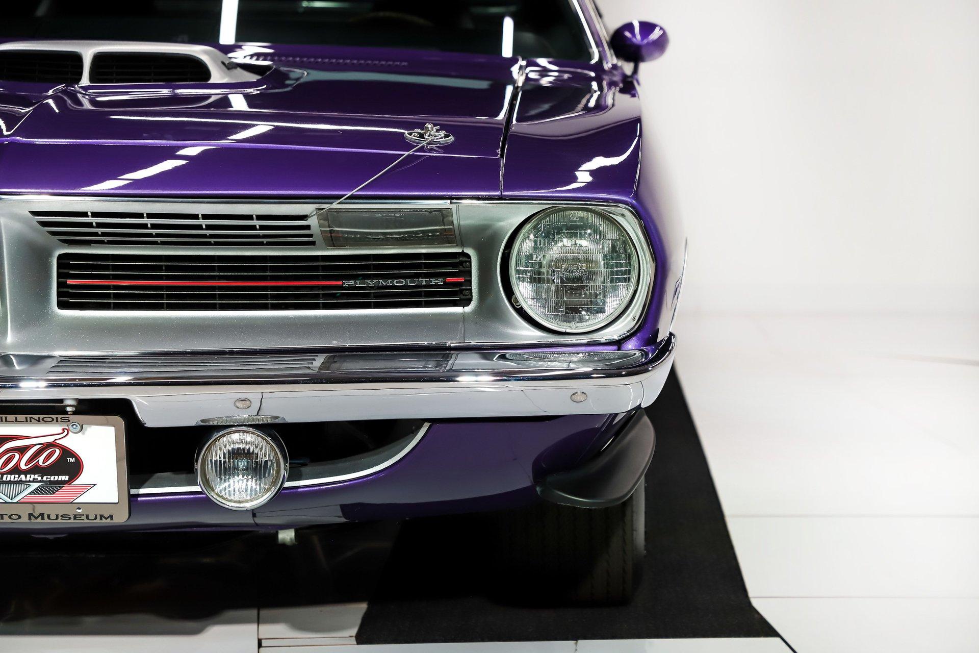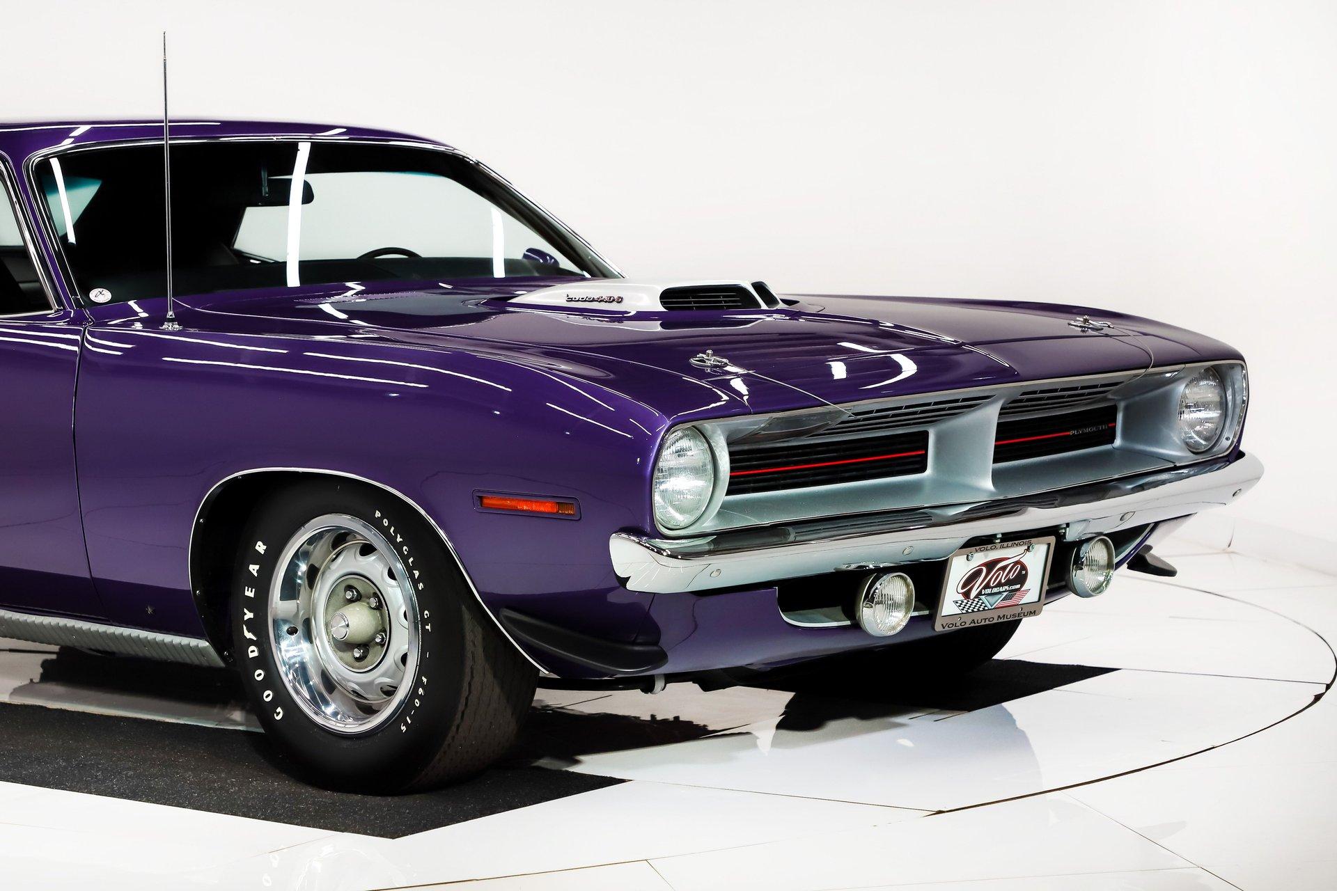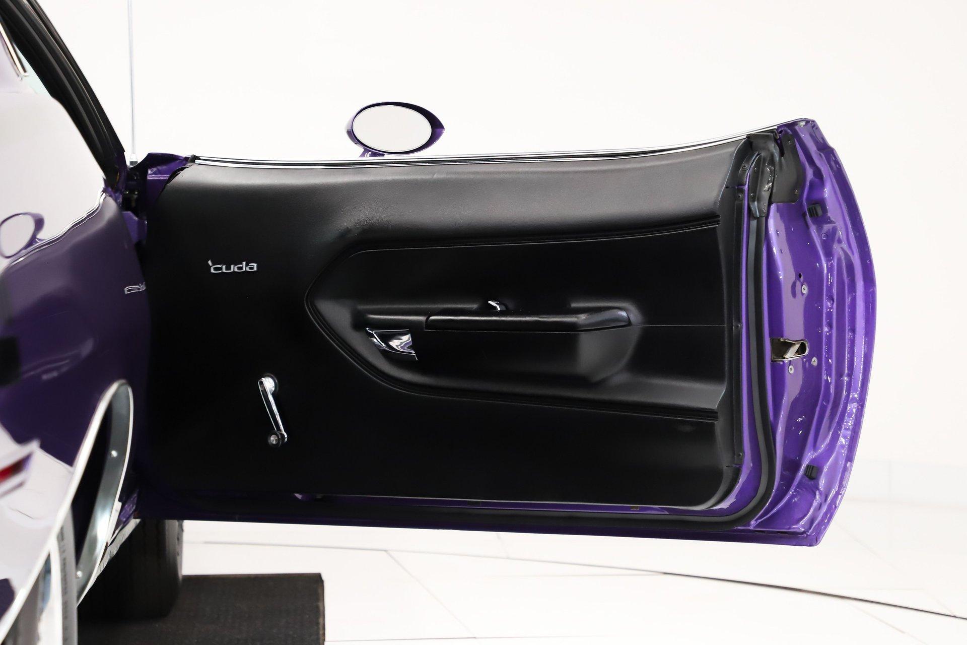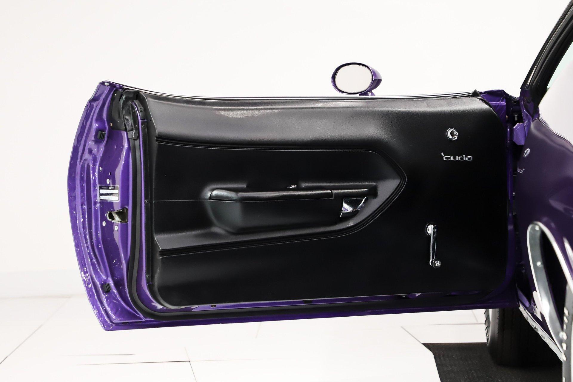EXTERIOR: It doesn't get much better than this- a factory FC7 In Violet Cuda with no vinyl top and a shaker hood! The body was restored in 2006, and the fact it still looks this good is a true testament to the quality of the workmanship. It is absolutely straight, look down either side and you'll see it. The panels are aligned with precision, and the doors close like a new car. It's been repainted its factory Violet (FC7) color, laid out beautifully with a smooth, glossy finish. The chrome and trim have been restored or replaced, and all the glass has been replaced along with the weatherstrips. The shaker hood scoop feeds air to those 3 hungry carbs, and it's dressed just right with road lamps, chin spoilers, a Go-Wing, and hockey stick stripes. It's sitting on 15-inch Rallye wheels wrapped in reproduction Goodyear tires, giving it an authentic, factory correct stance.