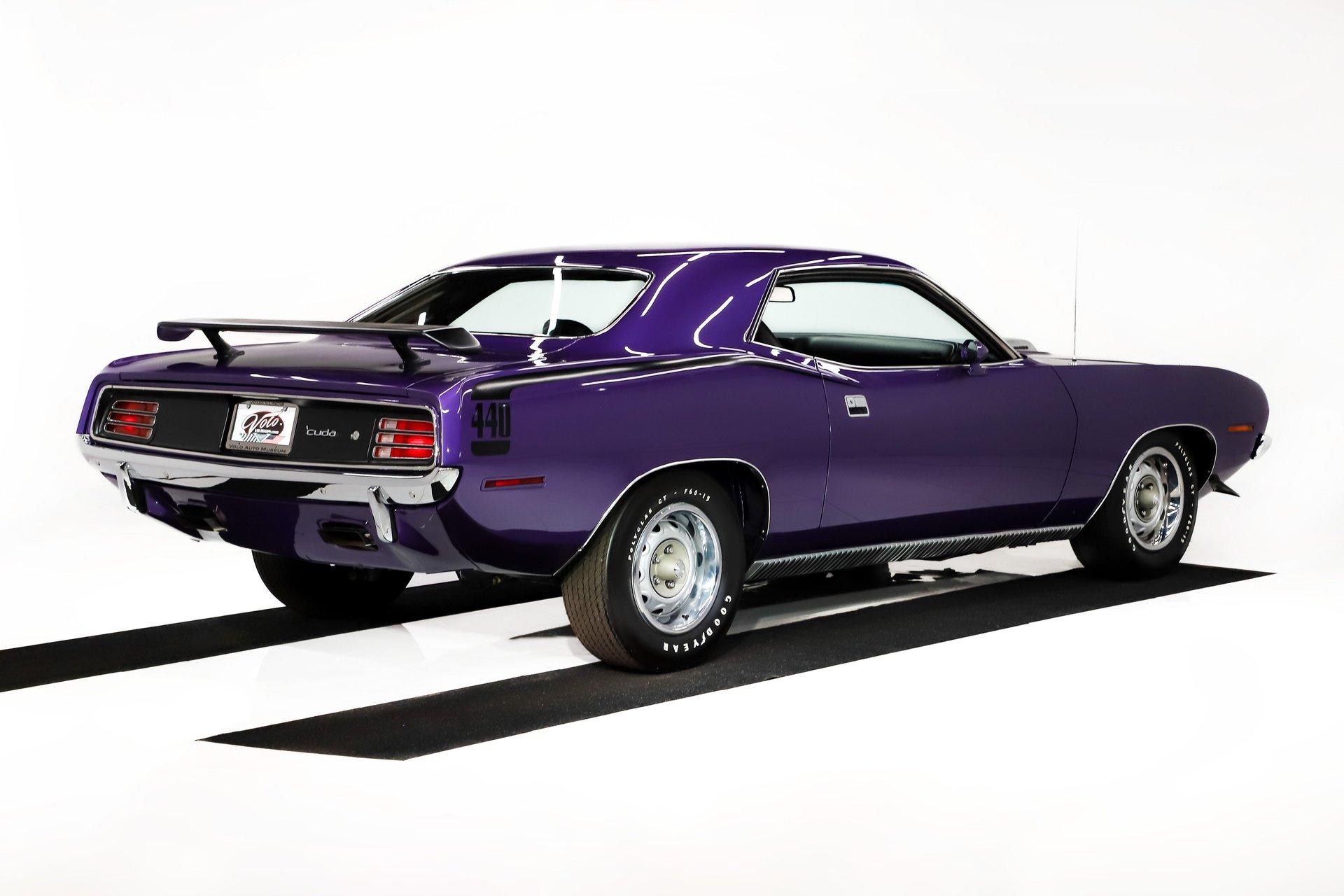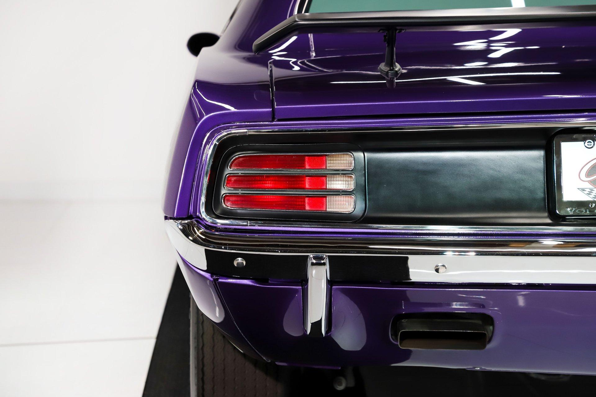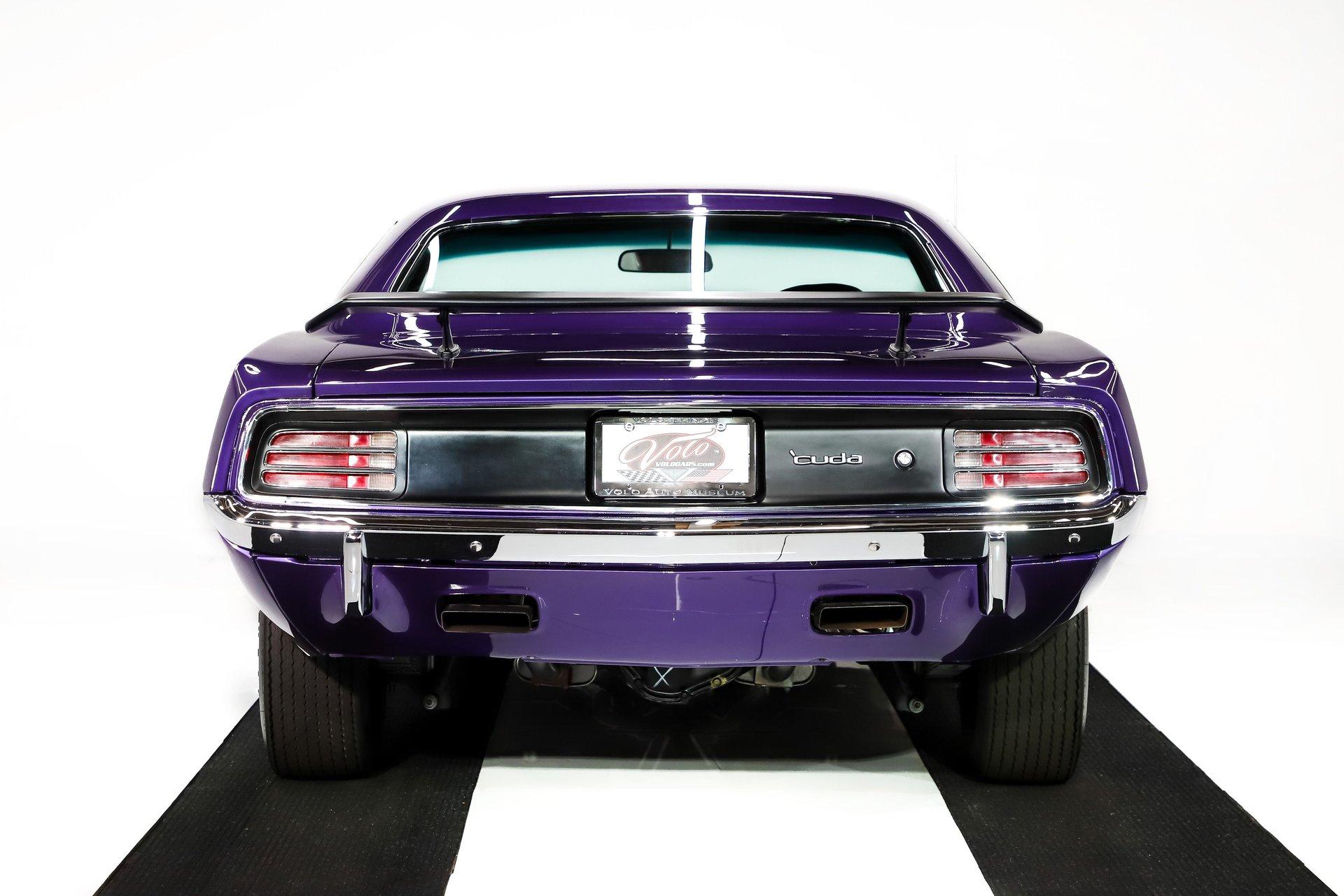 EXTERIOR: It doesn't get much better than this- a factory FC7 In Violet Cuda with no vinyl top and a shaker hood! The body was restored in 2006, and the fact it still looks this good is a true testament to the quality of the workmanship. It is absolutely straight, look down either side and you'll see it. The panels are aligned with precision, and the doors close like a new car. It's been repainted its factory Violet (FC7) color, laid out beautifully with a smooth, glossy finish. The chrome and trim have been restored or replaced, and all the glass has been replaced along with the weatherstrips. The shaker hood scoop feeds air to those 3 hungry carbs, and it's dressed just right with road lamps, chin spoilers, a Go-Wing, and hockey stick stripes. It's sitting on 15-inch Rallye wheels wrapped in reproduction Goodyear tires, giving it an authentic, factory correct stance.
