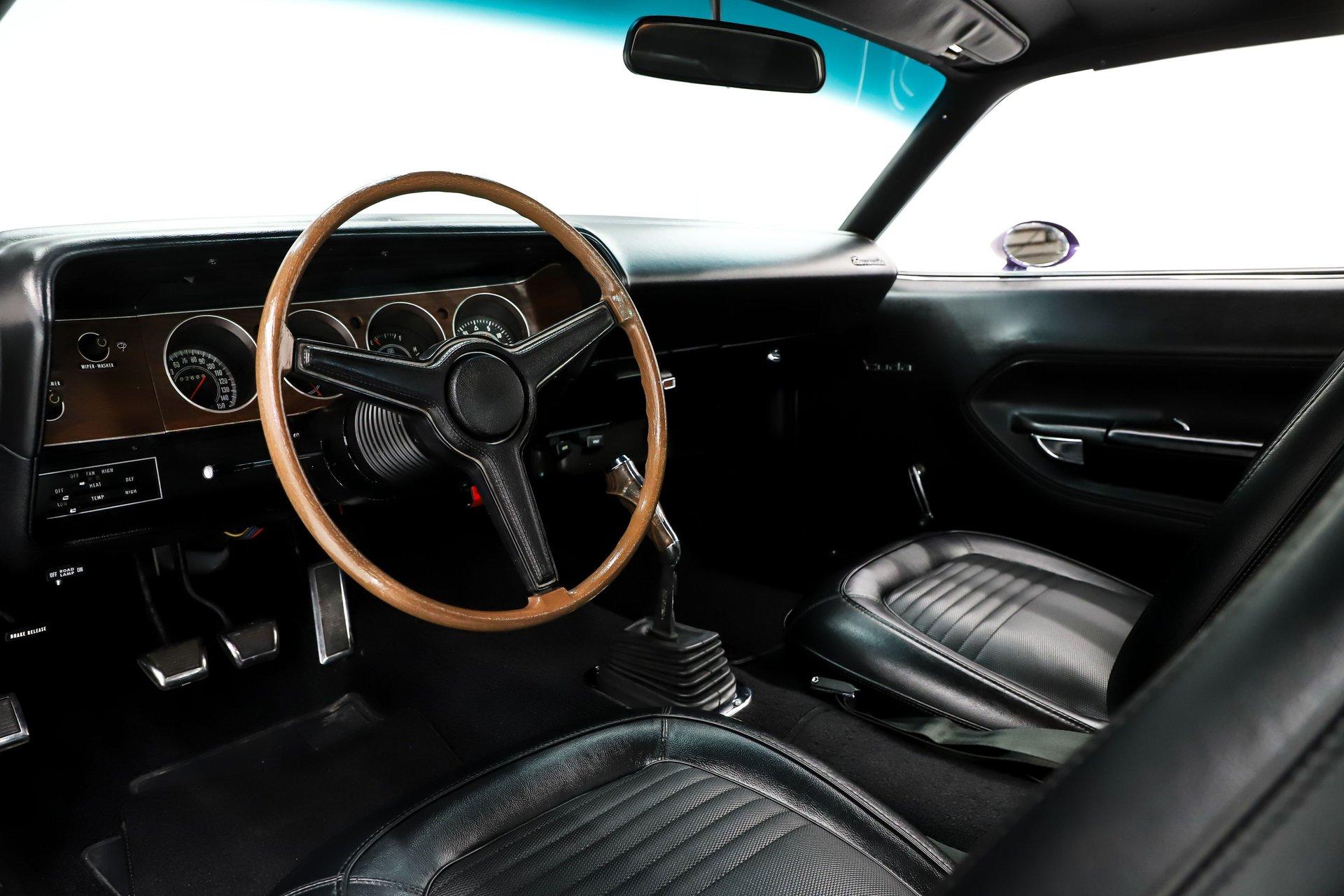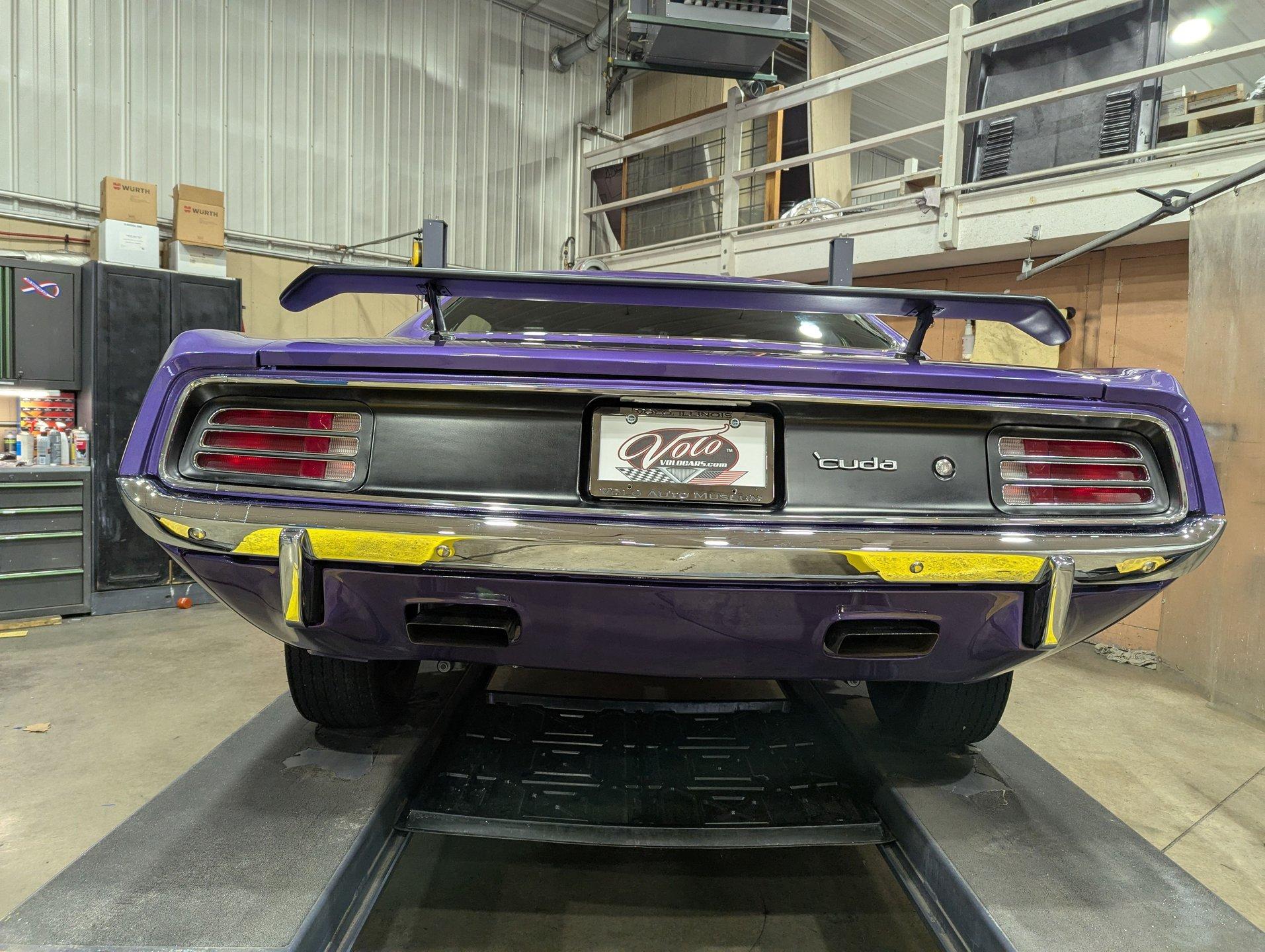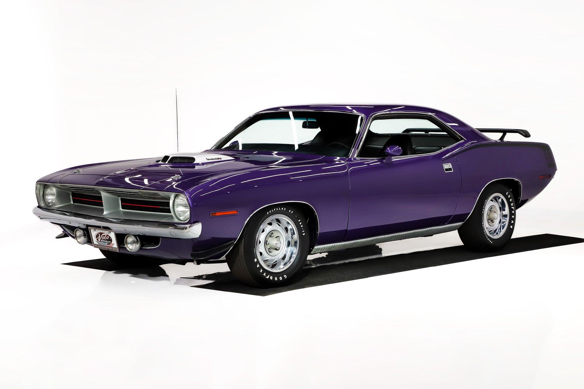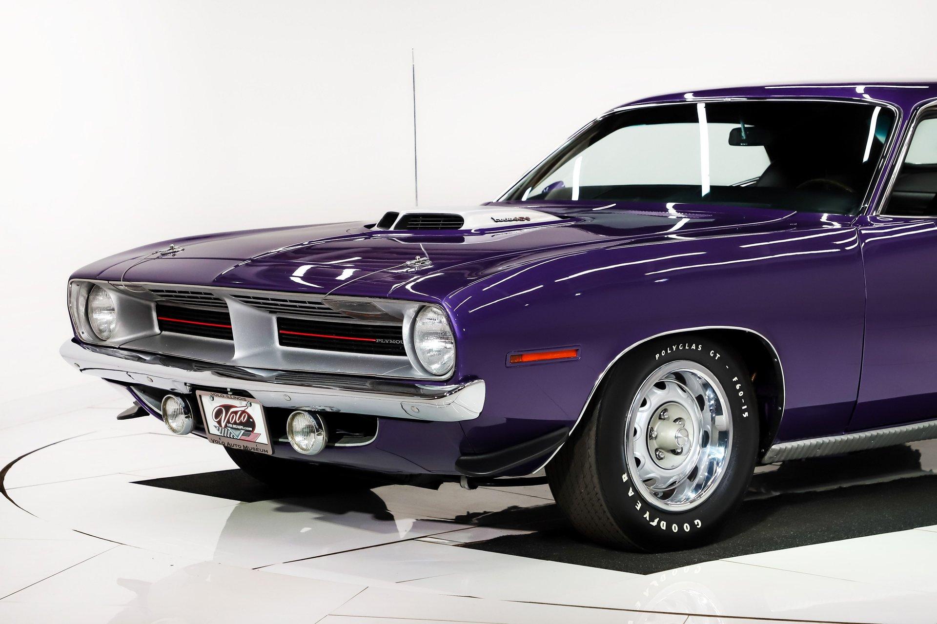EXTERIOR: It doesn't get much better than this- a factory FC7 In Violet Cuda with no vinyl top and a shaker hood! The body was restored in 2006, and the fact it still looks this good is a true testament to the quality of the workmanship. It is absolutely straight, look down either side and you'll see it. The panels are aligned with precision, and the doors close like a new car. It's been repainted its factory Violet (FC7) color, laid out beautifully with a smooth, glossy finish. The chrome and trim have been restored or replaced, and all the glass has been replaced along with the weatherstrips. The shaker hood scoop feeds air to those 3 hungry carbs, and it's dressed just right with road lamps, chin spoilers, a Go-Wing, and hockey stick stripes. It's sitting on 15-inch Rallye wheels wrapped in reproduction Goodyear tires, giving it an authentic, factory correct stance.