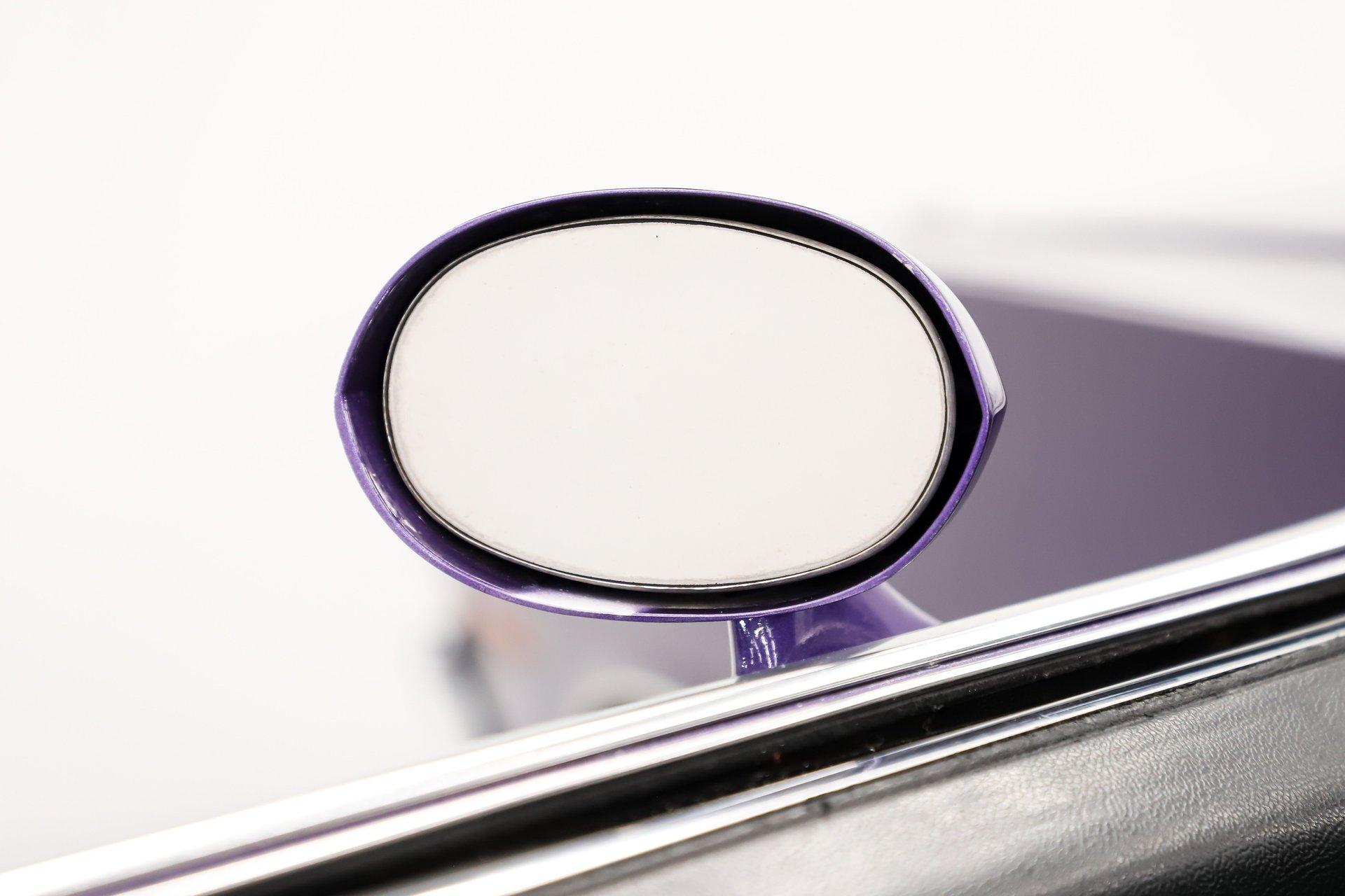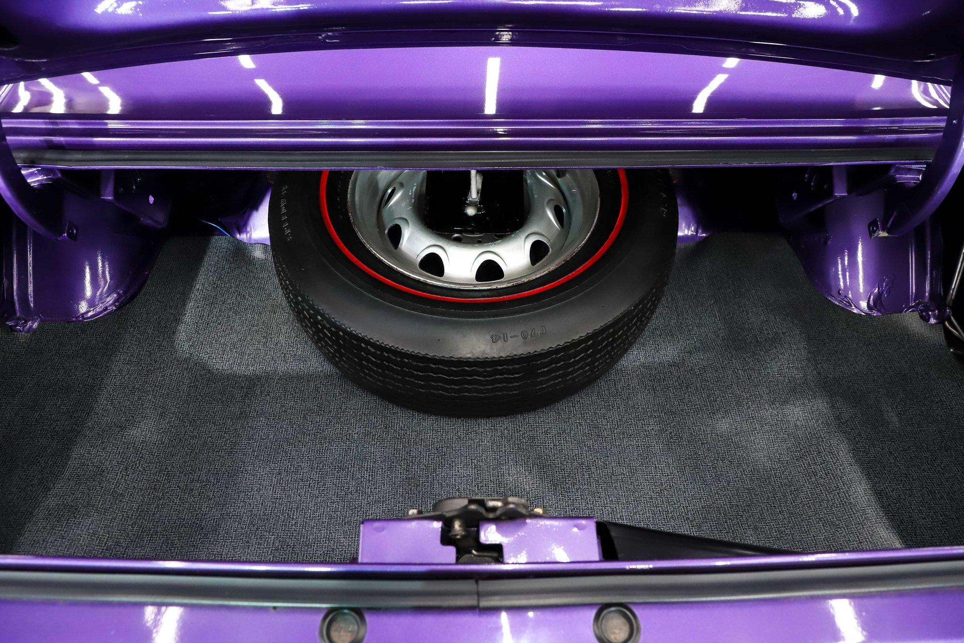 TRUNK COMPARTMENT: It's all clean, solid metal, finished in a glossy purple to match the exterior. Nicely detailed with the correct sticker, fresh weatherstrip, and proper trunk mat. It's complete with the jack assembly and a rally wheel spare wrapped in a vintage redline tire- just the way it should be.