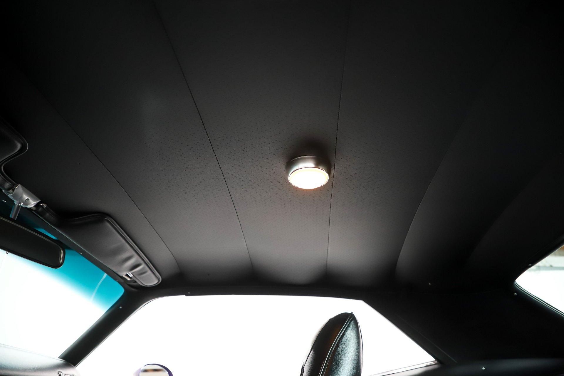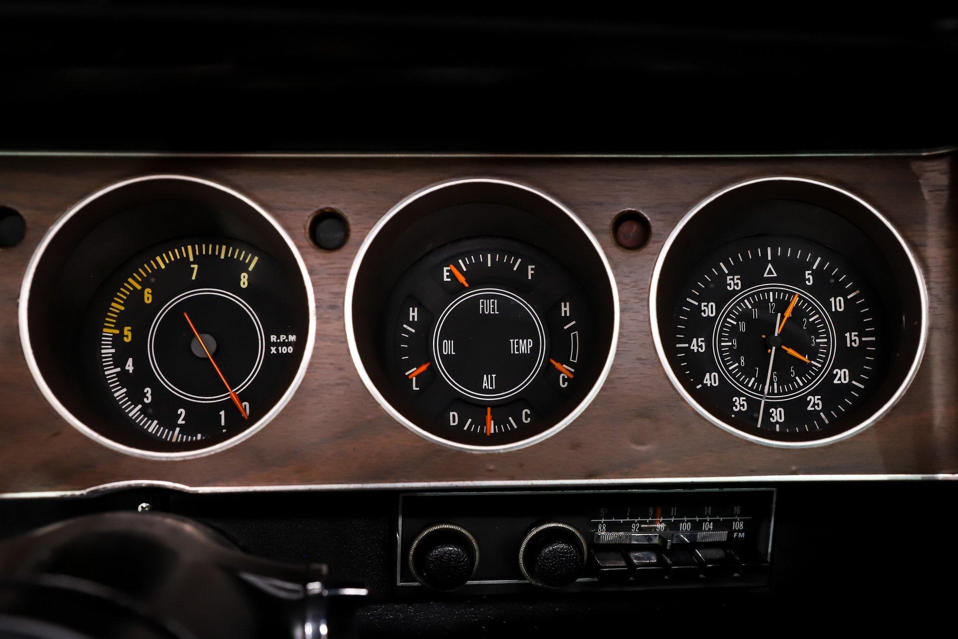 INTERIOR: Let's start with the best part- three pedals and a pistol grip shifter! Yes, it's been restored to excellent condition throughout. Down on the floor is a nicely fitted carpet with no wrinkles, along with the original seat belts. The seats have been rebuilt with firm cushions and reupholstered, offering great support. The side panels are in excellent shape. The dash pad has been professionally restored and it features a full set of Rallye gauges, including a tachometer, along with a factory AM/FM radio. The steering wheel has been restored, and the glove box liner has been replaced. The headliner and visors are in very good condition, with only a few tiny imperfections.