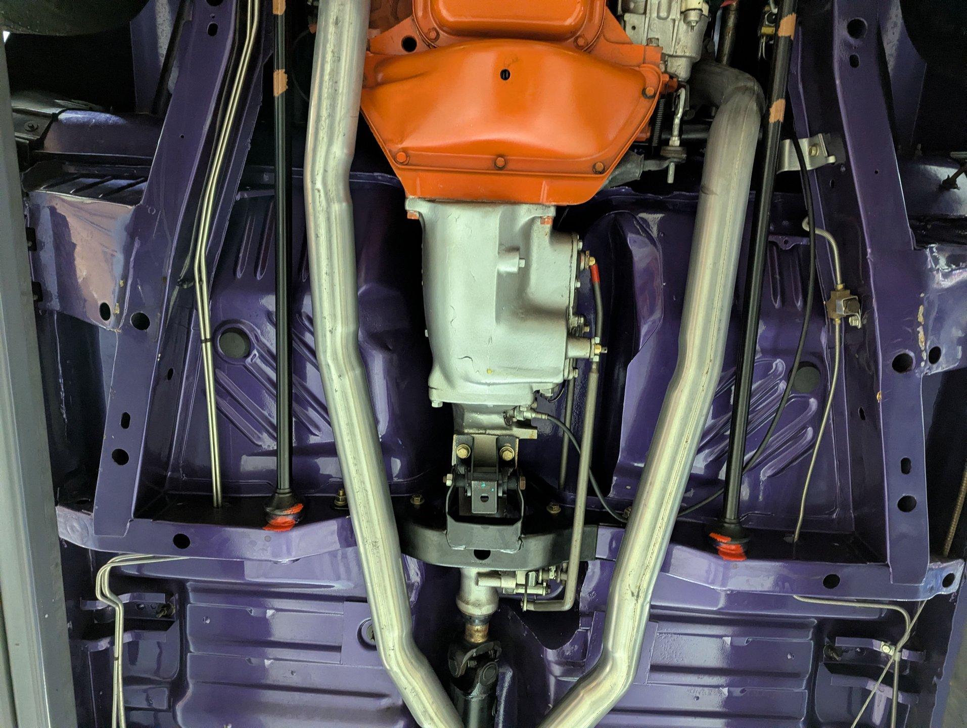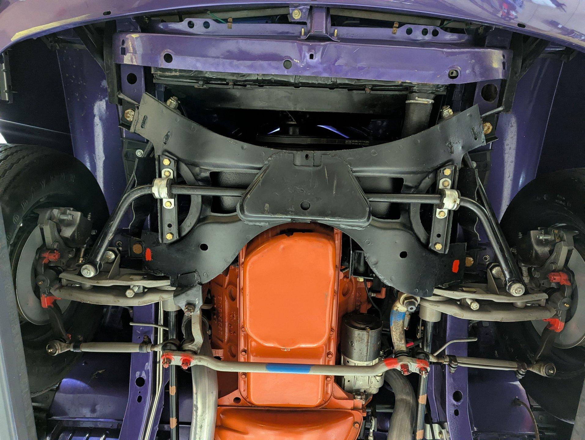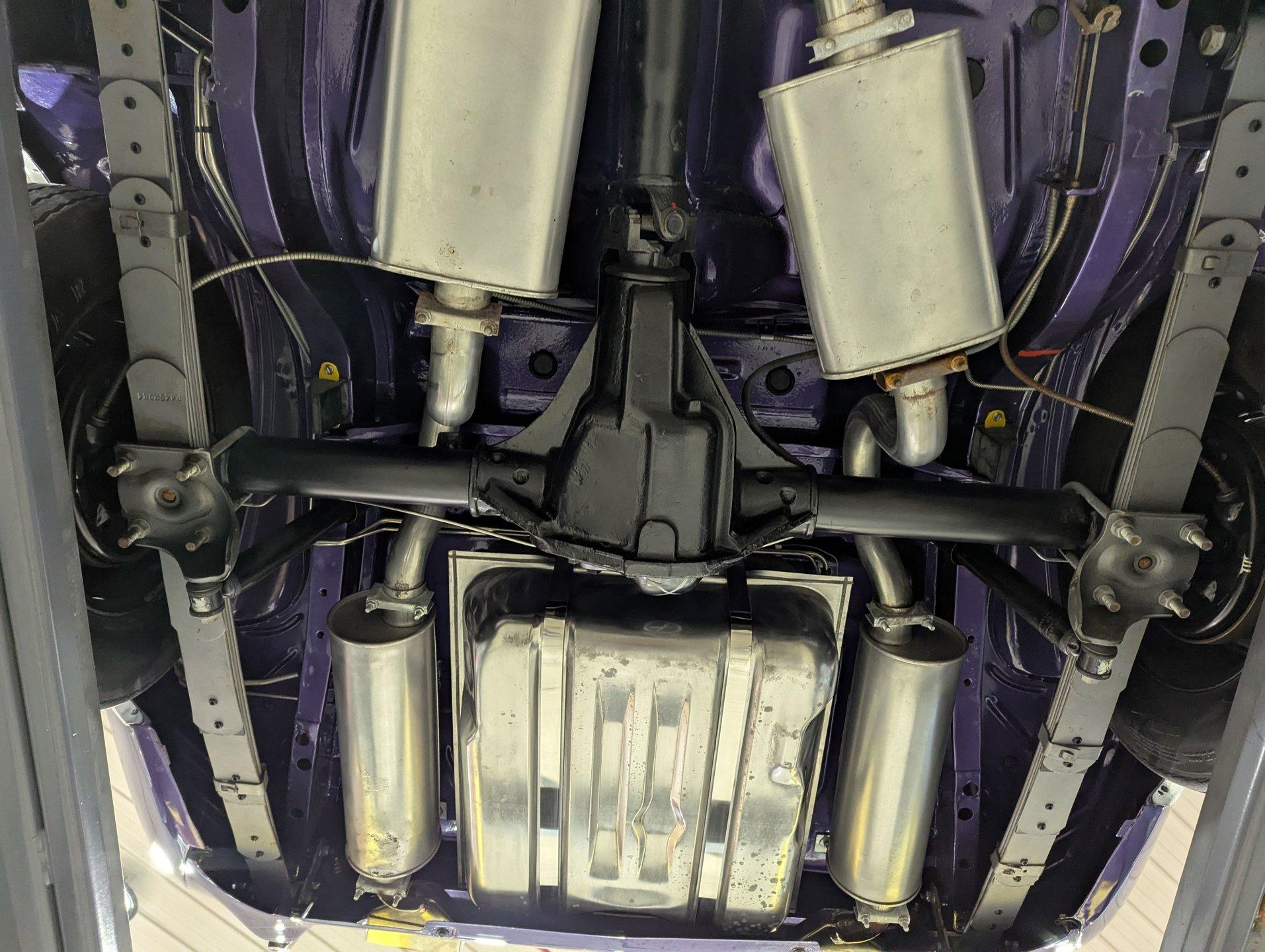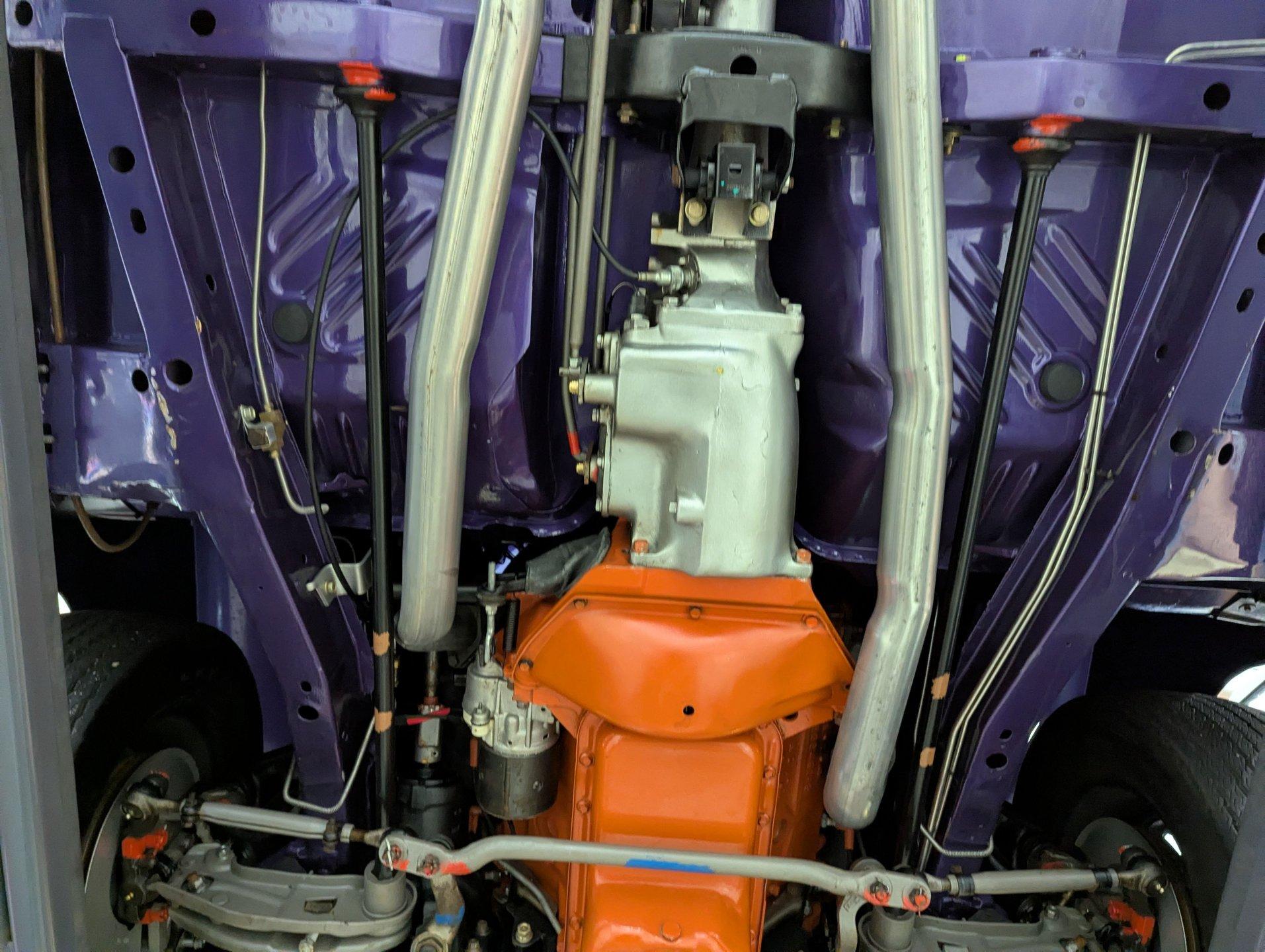 UNDERSIDE: Every component under this car was removed and the body was mounted on a rotisserie for a thorough restoration. The floors, braces, and rockers are all pristine metal, finished in the same glossy In Violet purple as the exterior. The entire suspension and steering system, front to back, has been completely rebuilt. The brake system has been fully redone with new lines and cables, the e-brake is hooked up, and it features front disc brakes. It has a factory correct dual exhaust system with mufflers and resonators, exiting cleanly through the valance with square tips. The fuel system has been replaced and includes a polished tank. Looking up at the engine, it's spotless and properly detailed with correct components, casting codes, and the matching VIN stamped by the oil pan. It is paired to a correct 833 4-speed transmission also with matching VIN, and a Dana 60 heavy duty rear end with 4.10 Sure Grip gears. Even the assembly line markings are replicated- this car is detailed right down to the last inch.
