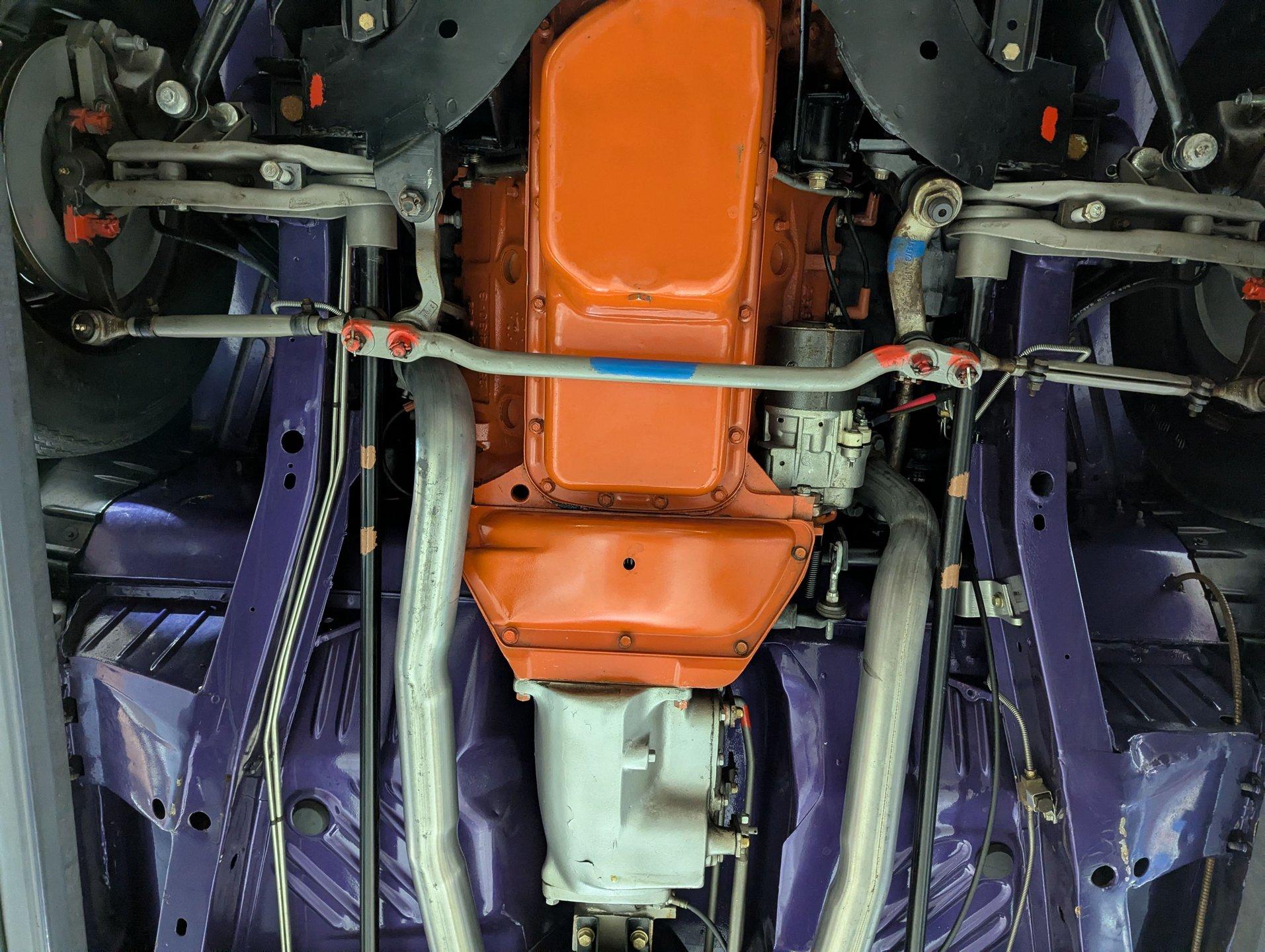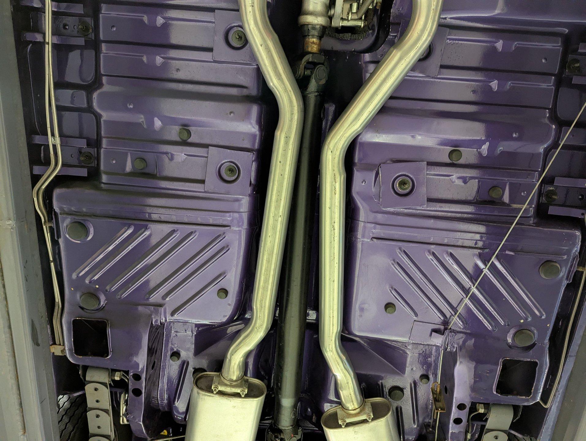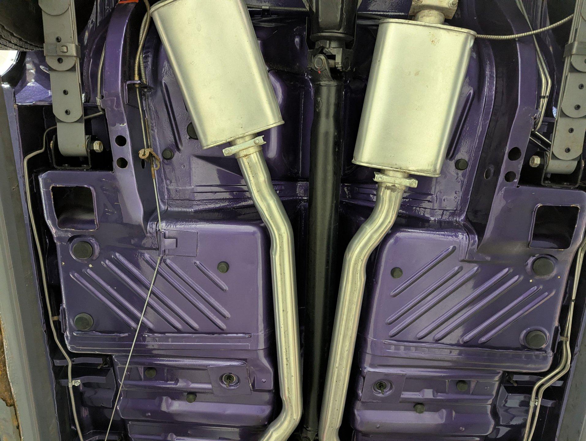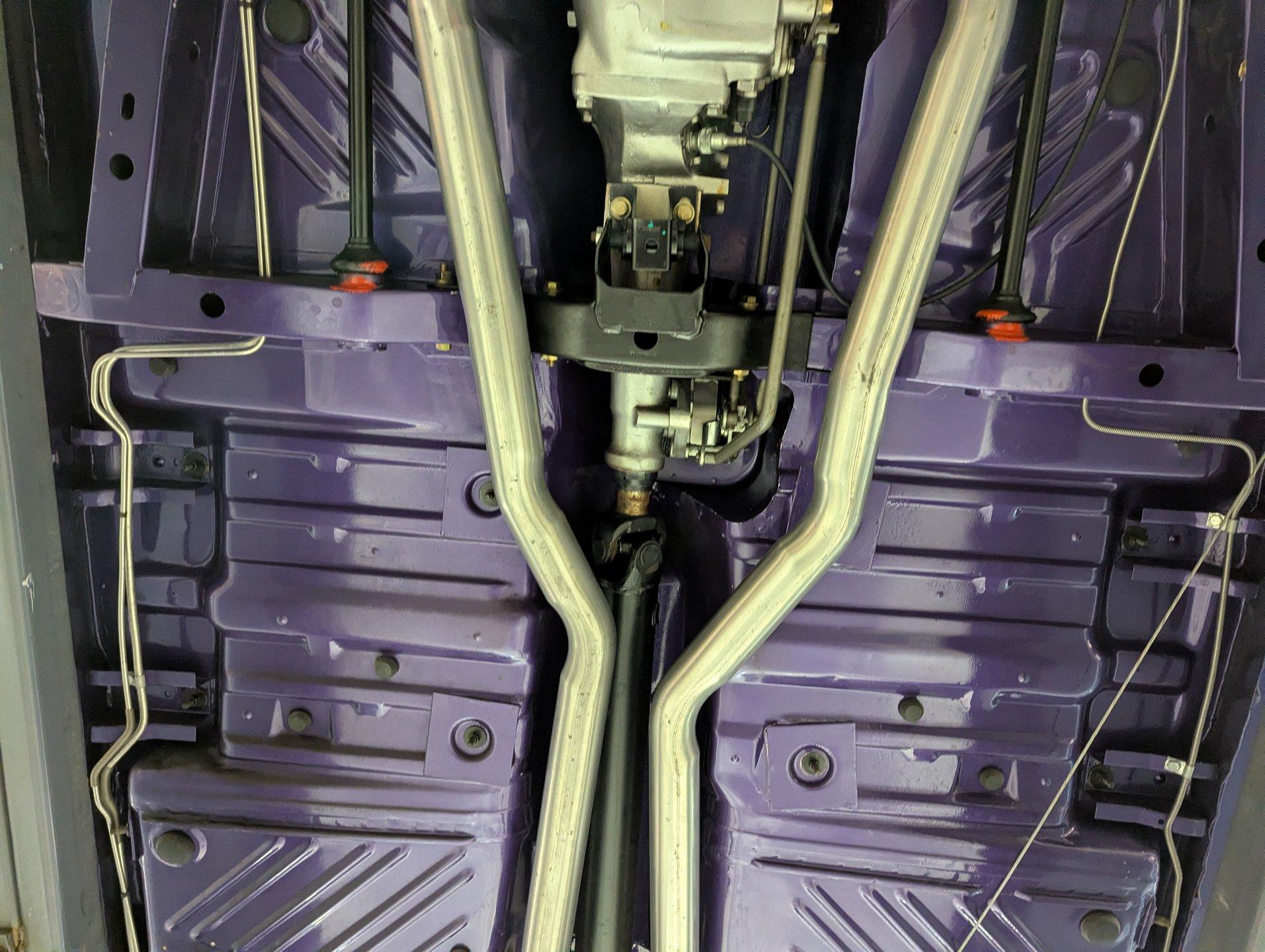 UNDERSIDE: Every component under this car was removed and the body was mounted on a rotisserie for a thorough restoration. The floors, braces, and rockers are all pristine metal, finished in the same glossy In Violet purple as the exterior. The entire suspension and steering system, front to back, has been completely rebuilt. The brake system has been fully redone with new lines and cables, the e-brake is hooked up, and it features front disc brakes. It has a factory correct dual exhaust system with mufflers and resonators, exiting cleanly through the valance with square tips. The fuel system has been replaced and includes a polished tank. Looking up at the engine, it's spotless and properly detailed with correct components, casting codes, and the matching VIN stamped by the oil pan. It is paired to a correct 833 4-speed transmission also with matching VIN, and a Dana 60 heavy duty rear end with 4.10 Sure Grip gears. Even the assembly line markings are replicated- this car is detailed right down to the last inch.