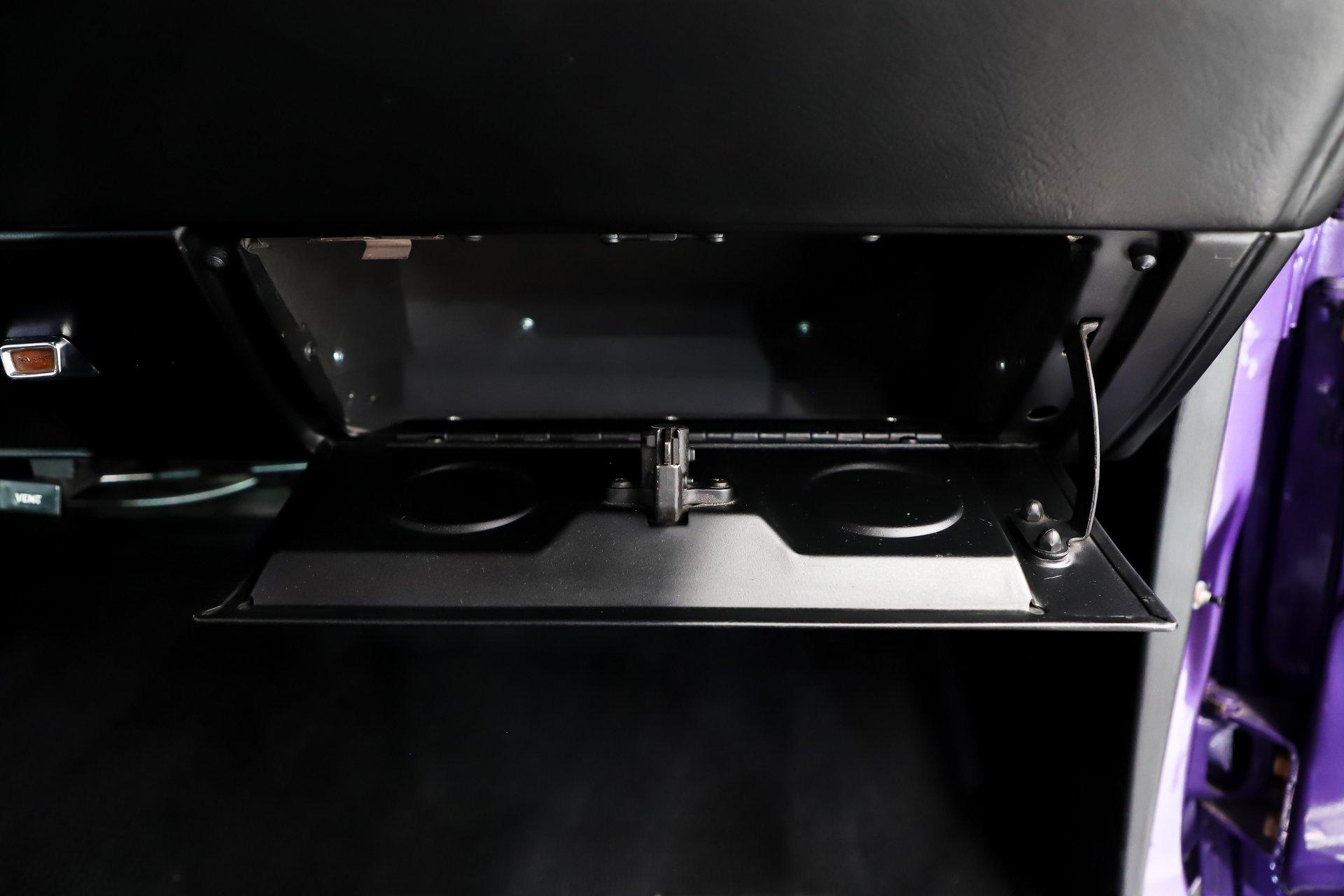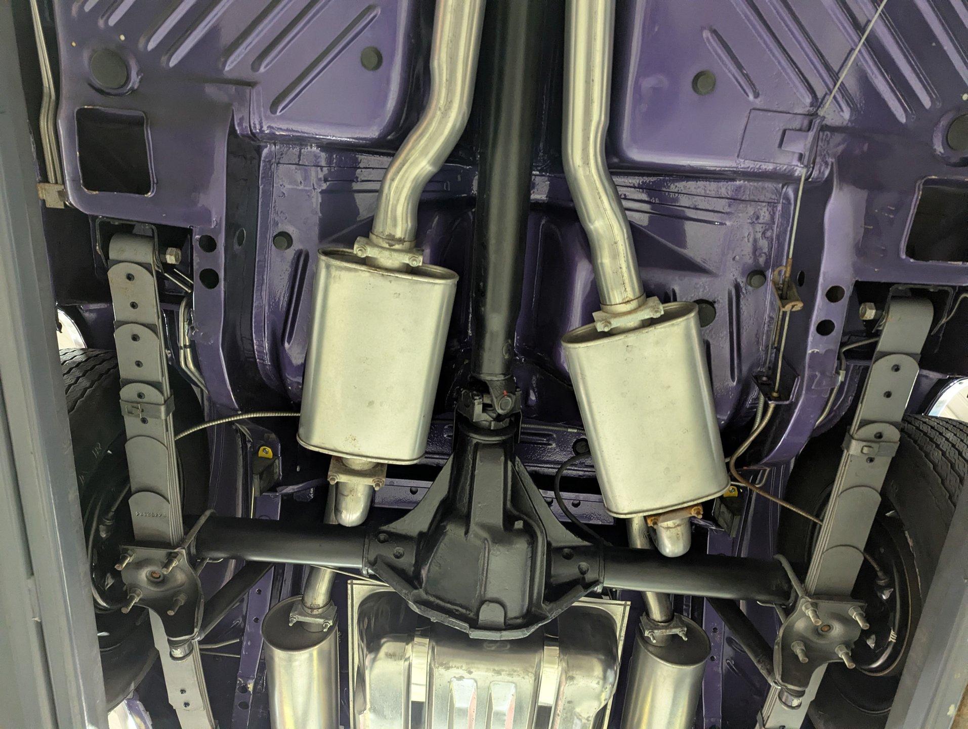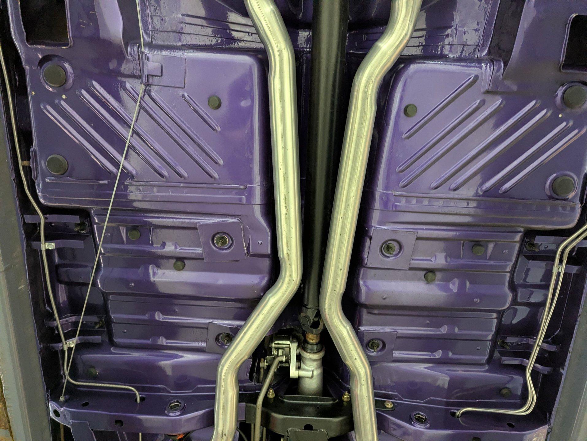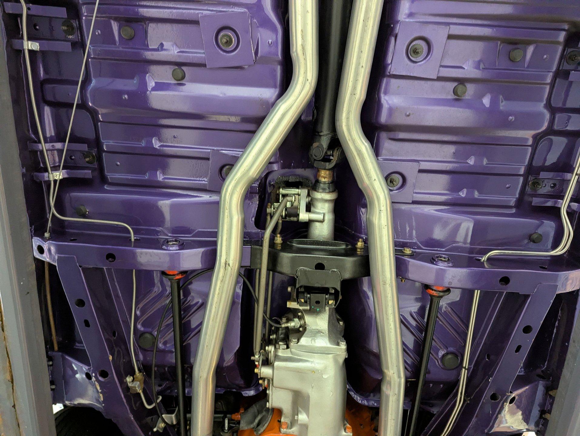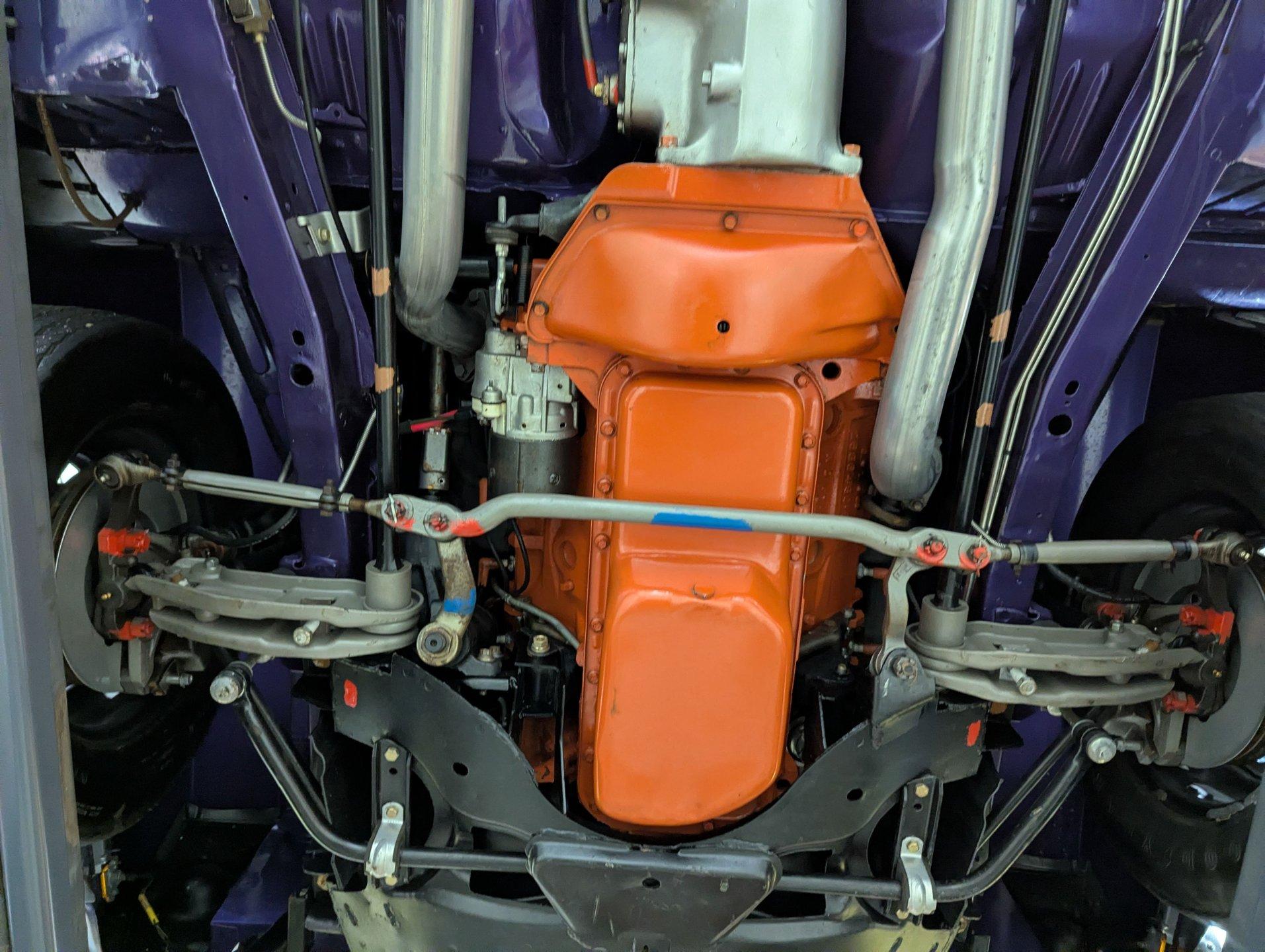 UNDERSIDE: Every component under this car was removed and the body was mounted on a rotisserie for a thorough restoration. The floors, braces, and rockers are all pristine metal, finished in the same glossy In Violet purple as the exterior. The entire suspension and steering system, front to back, has been completely rebuilt. The brake system has been fully redone with new lines and cables, the e-brake is hooked up, and it features front disc brakes. It has a factory correct dual exhaust system with mufflers and resonators, exiting cleanly through the valance with square tips. The fuel system has been replaced and includes a polished tank. Looking up at the engine, it's spotless and properly detailed with correct components, casting codes, and the matching VIN stamped by the oil pan. It is paired to a correct 833 4-speed transmission also with matching VIN, and a Dana 60 heavy duty rear end with 4.10 Sure Grip gears. Even the assembly line markings are replicated- this car is detailed right down to the last inch.