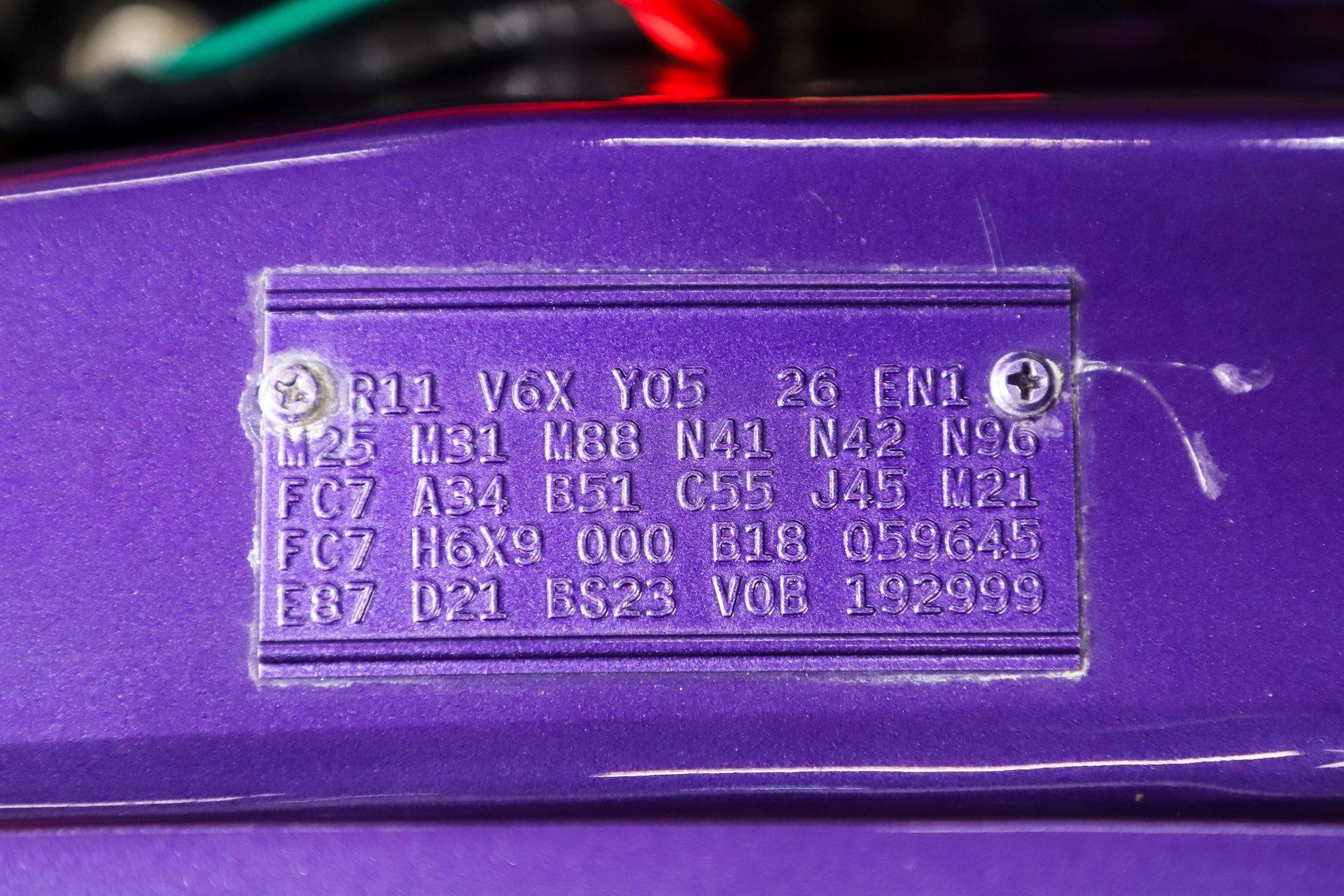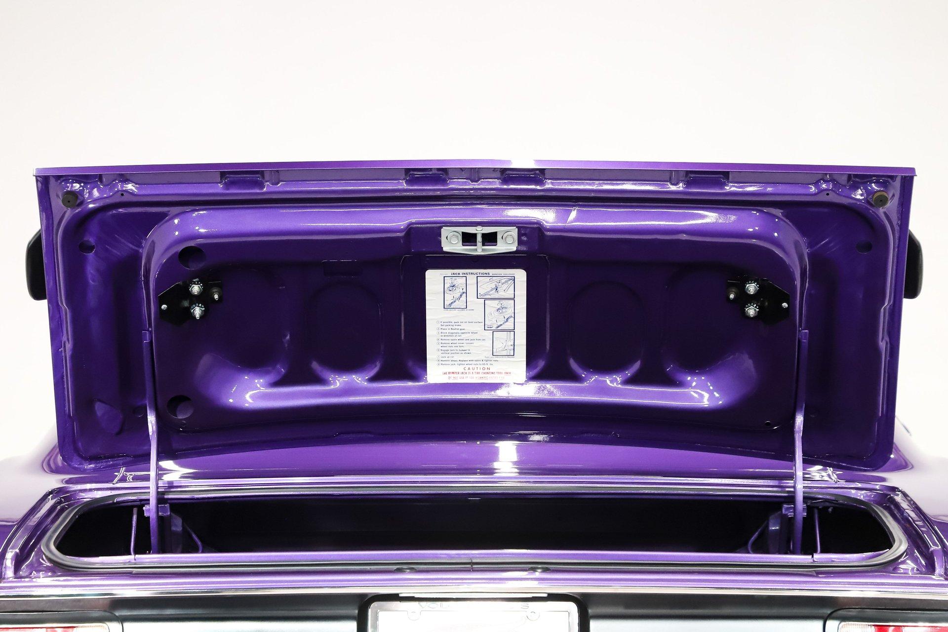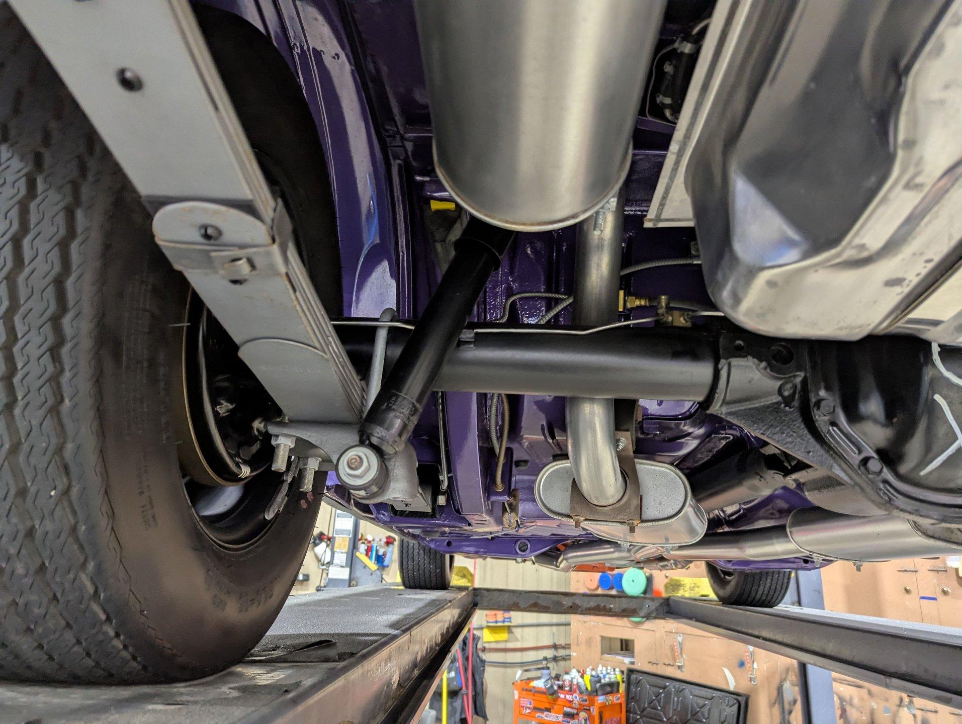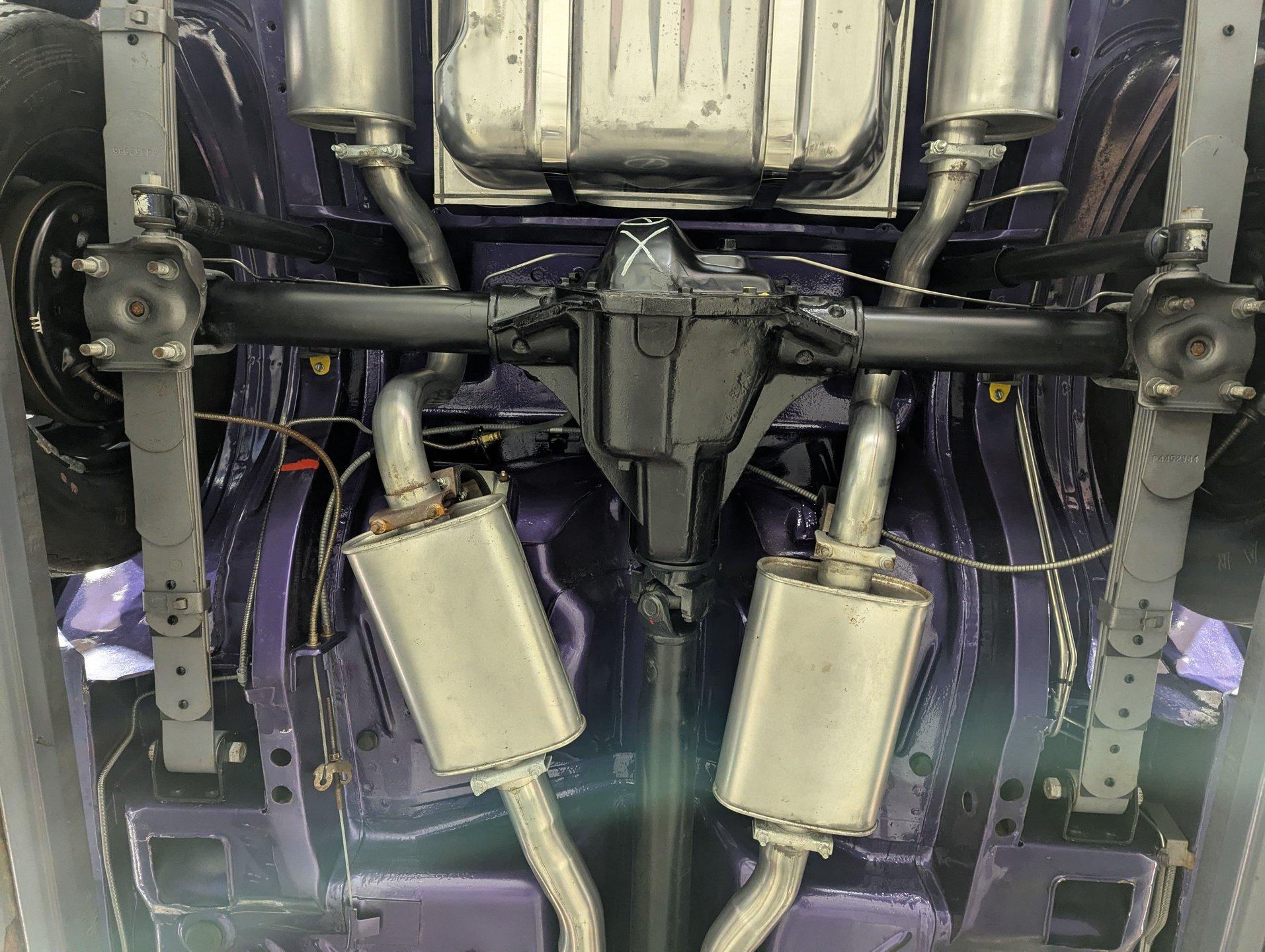UNDERSIDE: Every component under this car was removed and the body was mounted on a rotisserie for a thorough restoration. The floors, braces, and rockers are all pristine metal, finished in the same glossy In Violet purple as the exterior. The entire suspension and steering system, front to back, has been completely rebuilt. The brake system has been fully redone with new lines and cables, the e-brake is hooked up, and it features front disc brakes. It has a factory correct dual exhaust system with mufflers and resonators, exiting cleanly through the valance with square tips. The fuel system has been replaced and includes a polished tank. Looking up at the engine, it's spotless and properly detailed with correct components, casting codes, and the matching VIN stamped by the oil pan. It is paired to a correct 833 4-speed transmission also with matching VIN, and a Dana 60 heavy duty rear end with 4.10 Sure Grip gears. Even the assembly line markings are replicated- this car is detailed right down to the last inch.