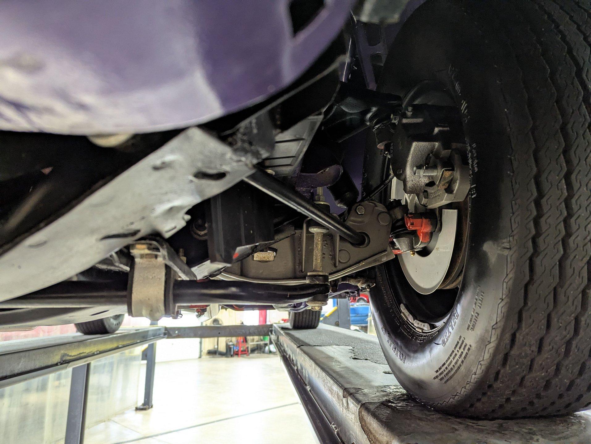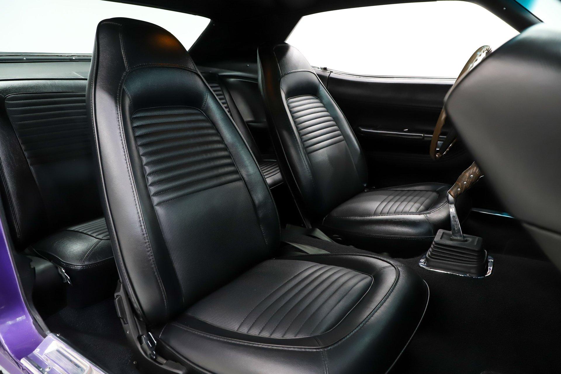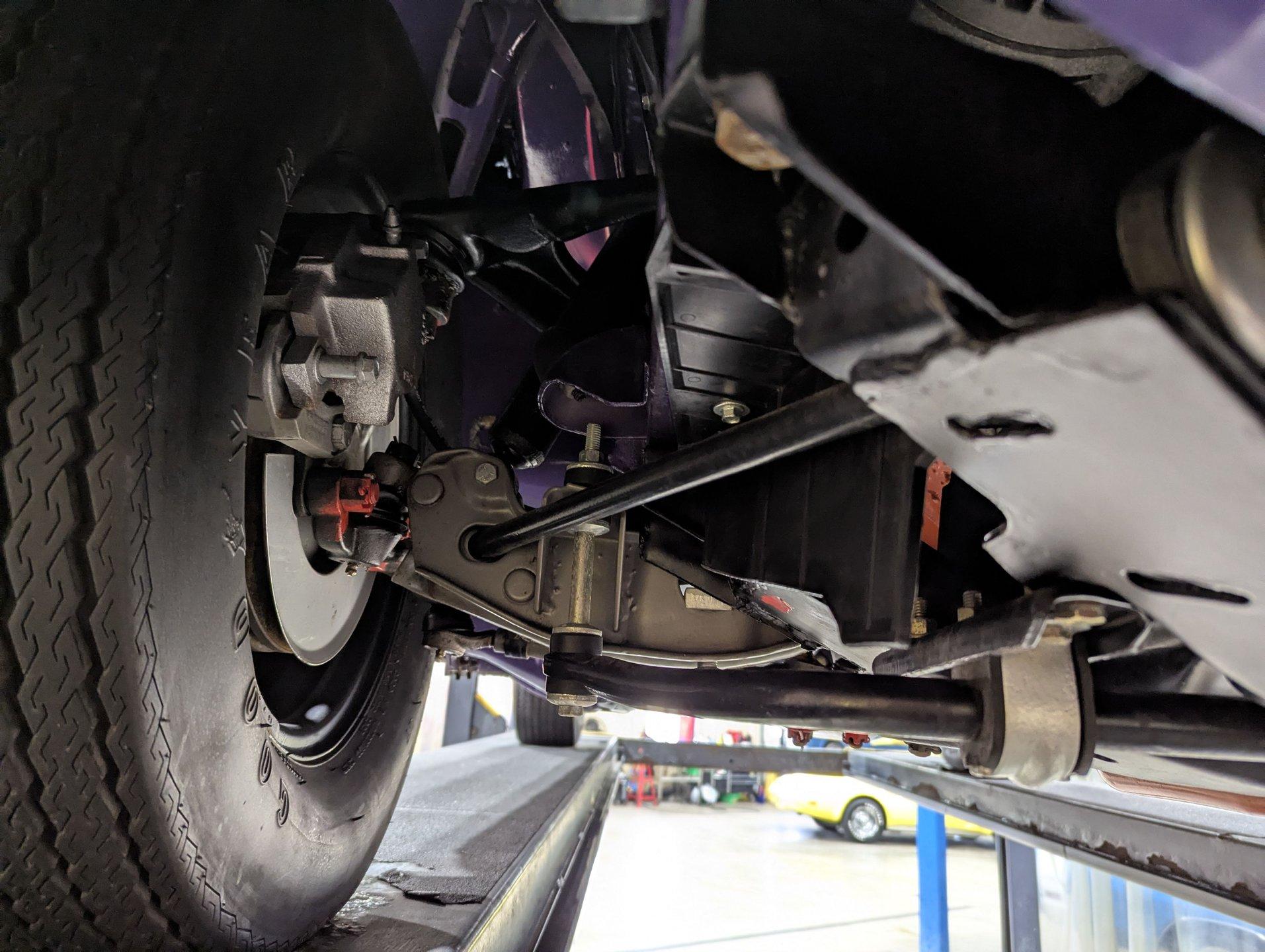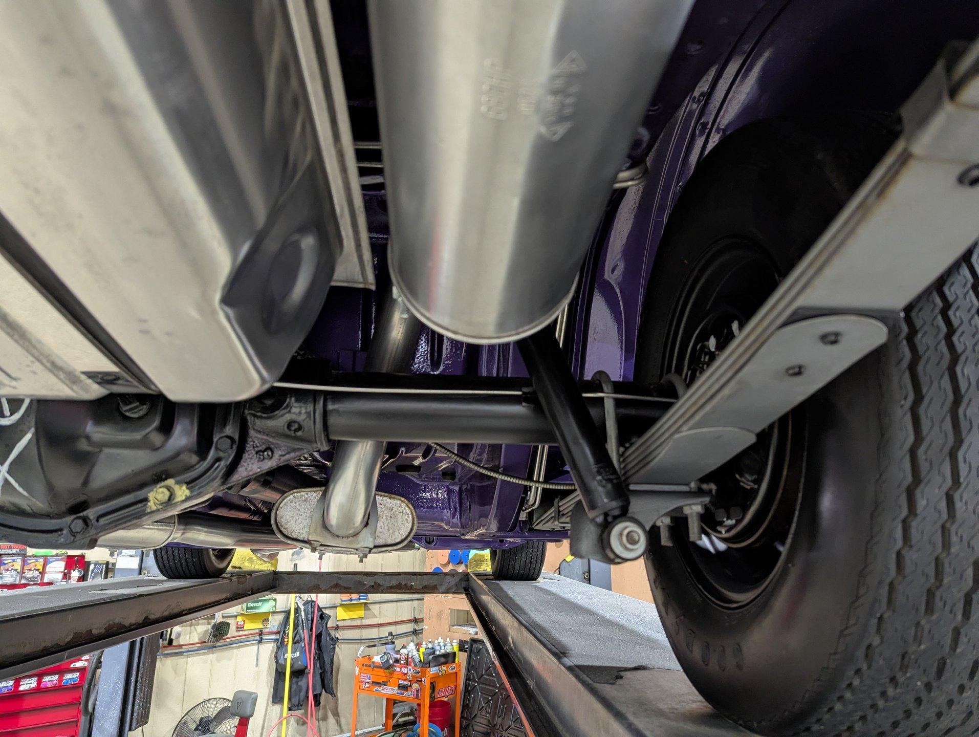 UNDERSIDE: Every component under this car was removed and the body was mounted on a rotisserie for a thorough restoration. The floors, braces, and rockers are all pristine metal, finished in the same glossy In Violet purple as the exterior. The entire suspension and steering system, front to back, has been completely rebuilt. The brake system has been fully redone with new lines and cables, the e-brake is hooked up, and it features front disc brakes. It has a factory correct dual exhaust system with mufflers and resonators, exiting cleanly through the valance with square tips. The fuel system has been replaced and includes a polished tank. Looking up at the engine, it's spotless and properly detailed with correct components, casting codes, and the matching VIN stamped by the oil pan. It is paired to a correct 833 4-speed transmission also with matching VIN, and a Dana 60 heavy duty rear end with 4.10 Sure Grip gears. Even the assembly line markings are replicated- this car is detailed right down to the last inch.