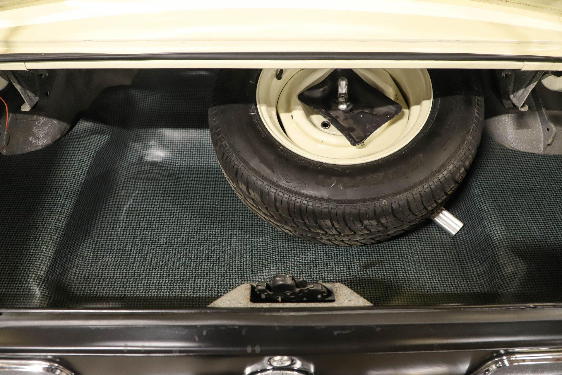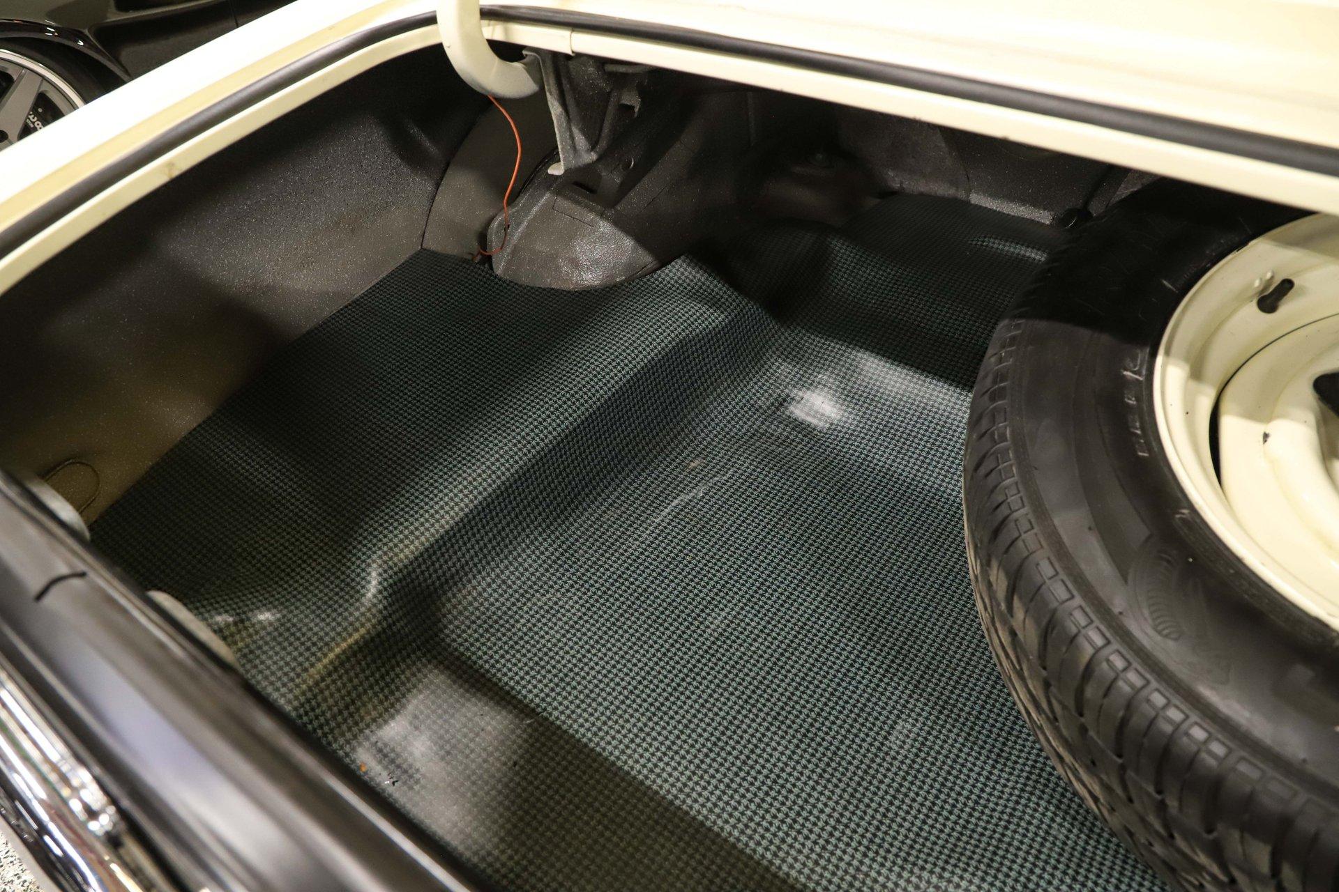 TRUNK COMPARTMENT: Under the trunk lid and the jamb are painted real nicely. Inside is rock solid metal that has been spatter painted. Nice fitting rubber mat. Complete jack assembly, no spare. New weatherstrip and optional trunk light.