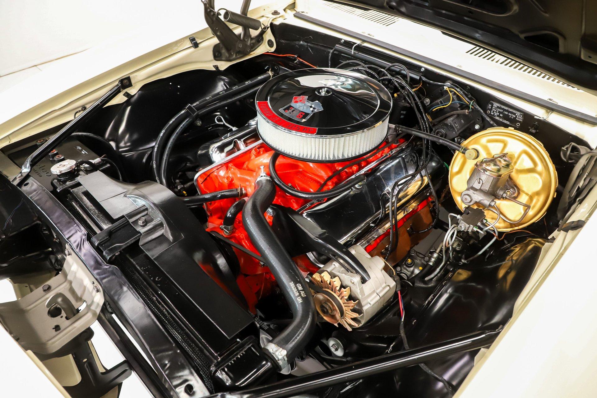 ENGINE COMPARTMENT: Correct dated and coded 396-325 hp engine. It is completely stock including the manifolds, valve covers and even reproduction spark plug wires. The hoses and clamps are reproduction. It has a Delco battery topper and spring clamp cables. Features include power steering and power brakes. It is detailed to factory new condition.