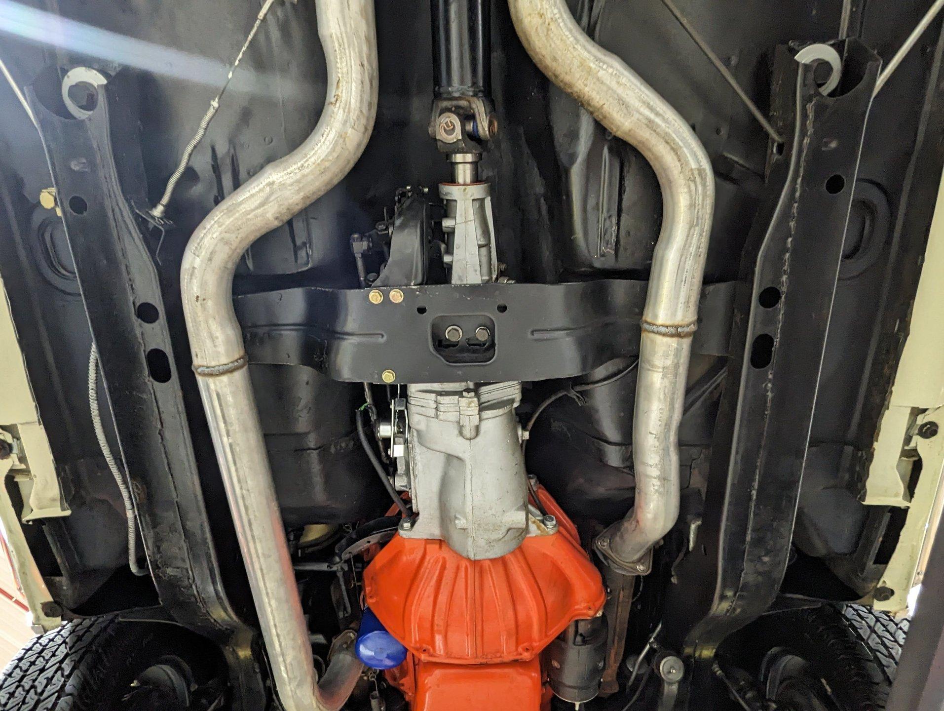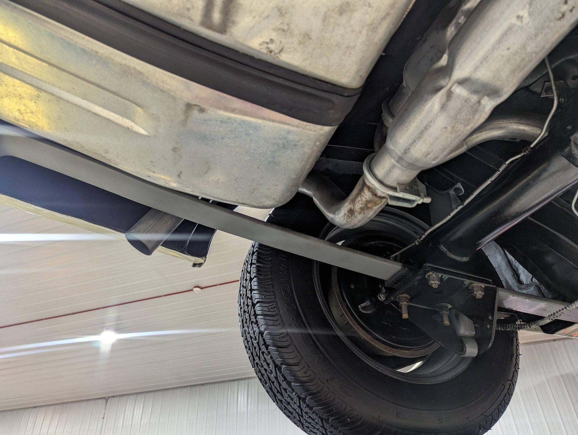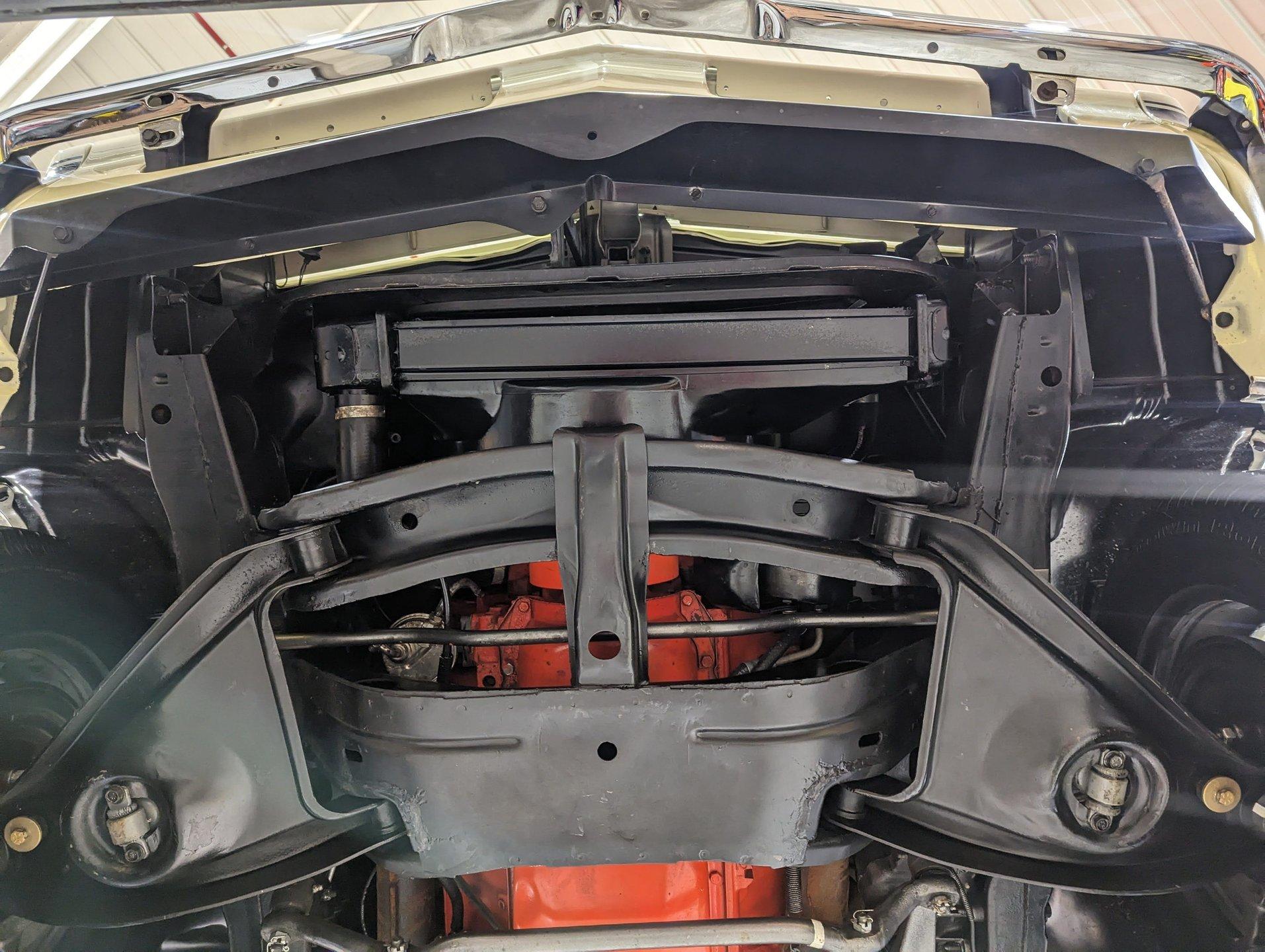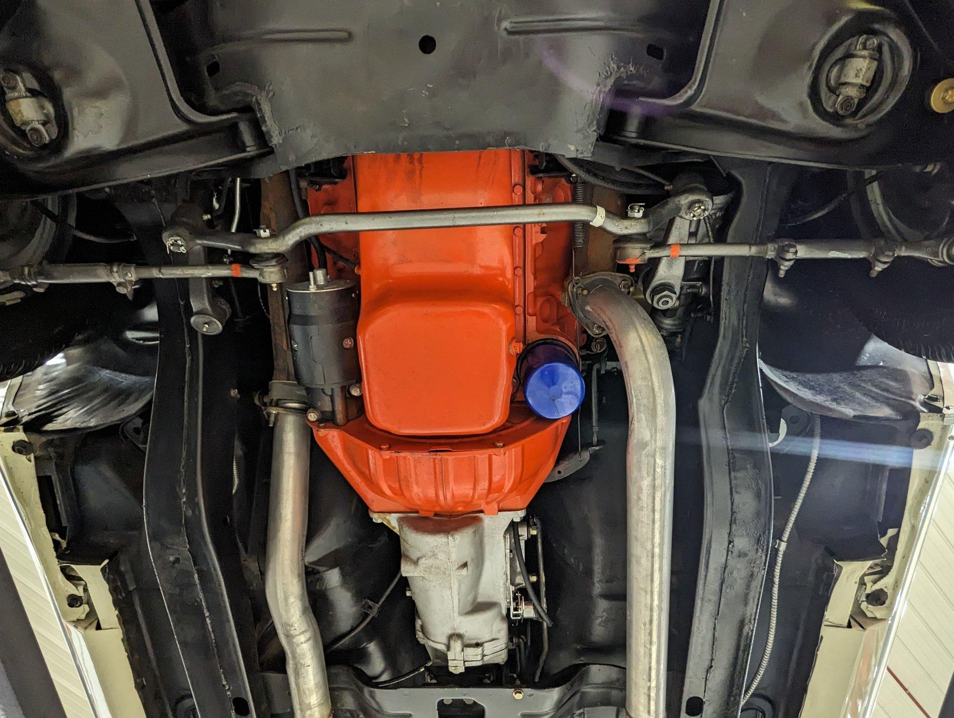 UNDERSIDE: The frame and all the components were removed from the bottom of the car. The floors are dry, clean metal all painted semi-gloss black. It all went back together with rebuilt or new components. The steering and suspension were rebuilt. It has the factory traction bar that was only used on high performance Camaros. It also has the performance chambered exhaust system. The brake system was restored, e-brake is hooked up. The fuel system was replaced. Looking up at the motor it is clean Chevy orange with a proper starter. It has a correct dated Muncie M20 4-speed trans. Rebuilt drive shaft leads to the 12 bolt rear end.