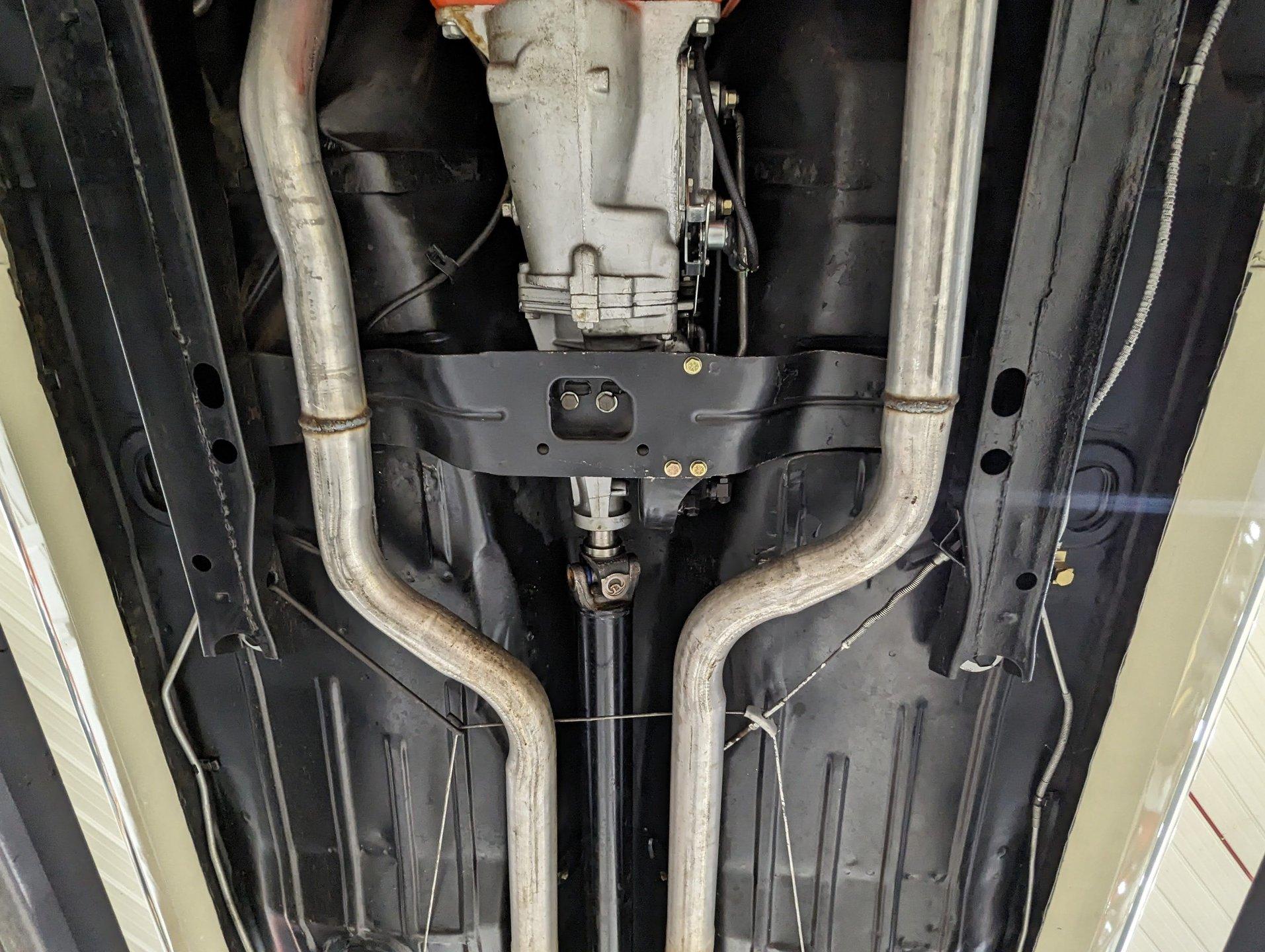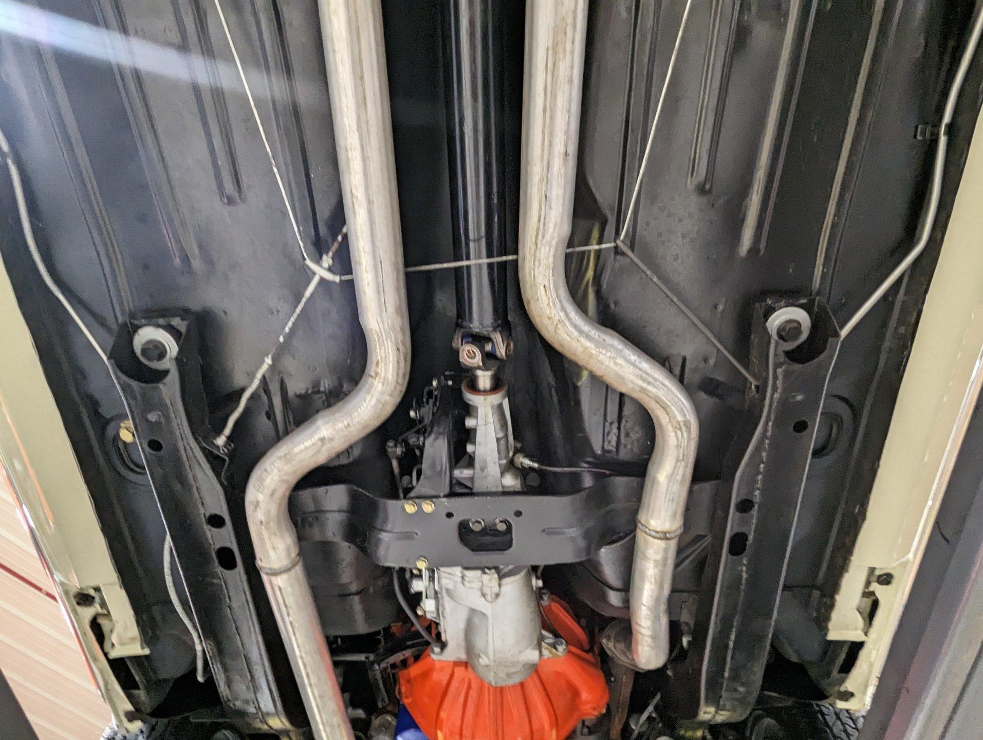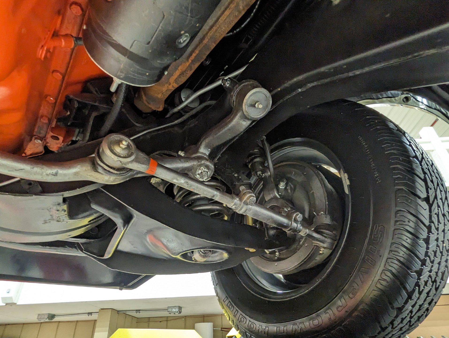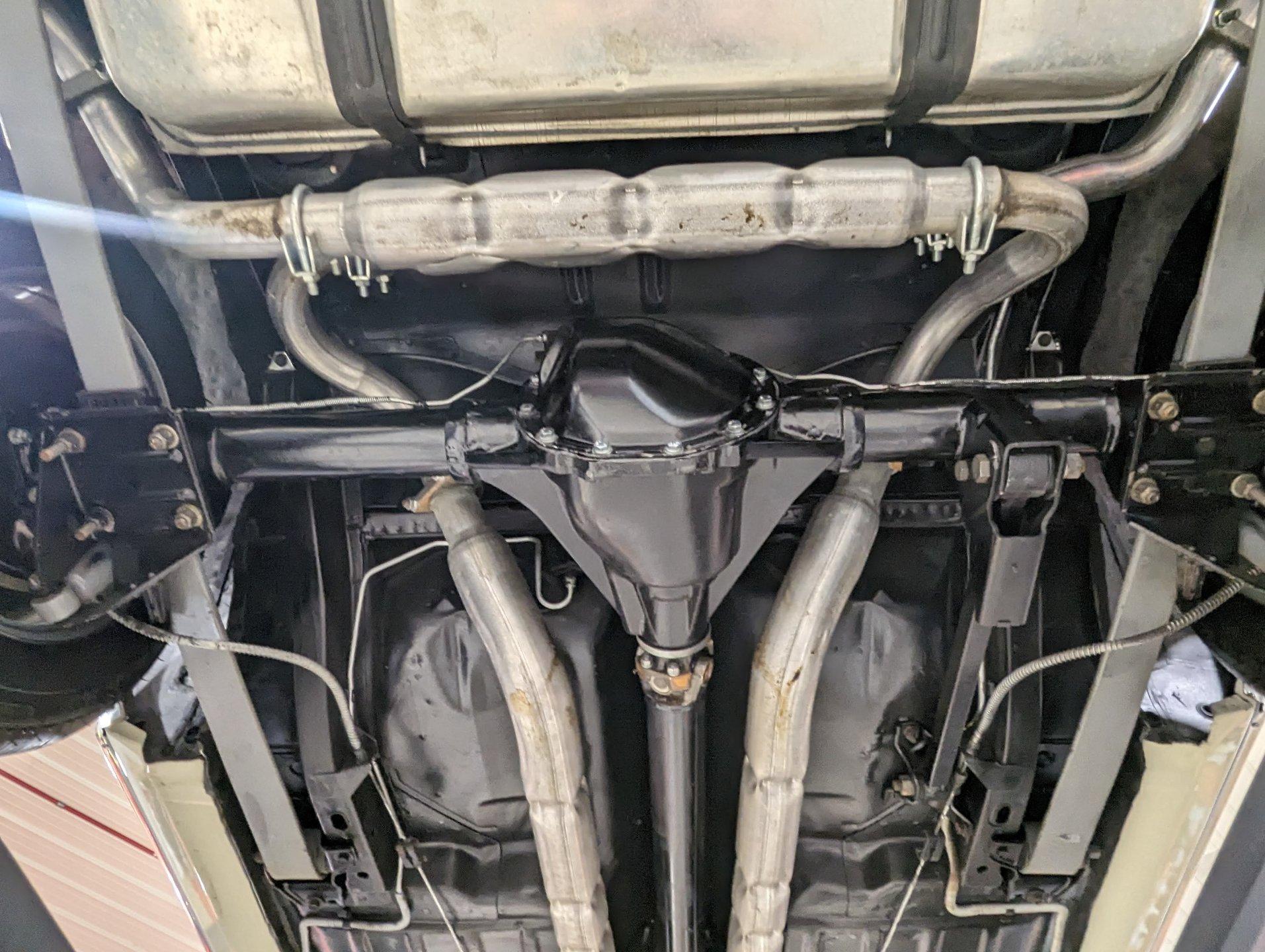 UNDERSIDE: The frame and all the components were removed from the bottom of the car. The floors are dry, clean metal all painted semi-gloss black. It all went back together with rebuilt or new components. The steering and suspension were rebuilt. It has the factory traction bar that was only used on high performance Camaros. It also has the performance chambered exhaust system. The brake system was restored, e-brake is hooked up. The fuel system was replaced. Looking up at the motor it is clean Chevy orange with a proper starter. It has a correct dated Muncie M20 4-speed trans. Rebuilt drive shaft leads to the 12 bolt rear end.